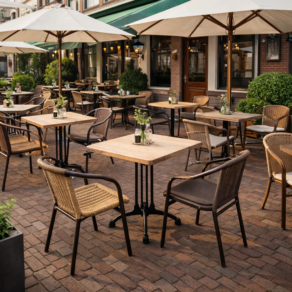 Een classic bistro terras is niet compleet zonder de juiste tafels. Terrastafels bepalen niet alleen hoe praktisch een terras in gebruik is, maar hebben ook veel invloed op de uitstraling van het geheel. Compacte, ronde of vierkante tafels maken het eenvoudig om een efficiënte en overzichtelijke opstelling te creëren. Ze zorgen ervoor dat gasten prettig kunnen zitten, terwijl je als ondernemer flexibel blijft in de indeling van het terras. Zeker op terrassen waar slim omgaan met ruimte belangrijk is, vormen deze tafels een logische en functionele keuze.