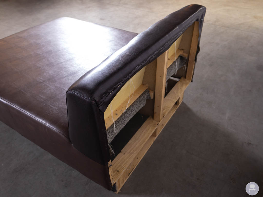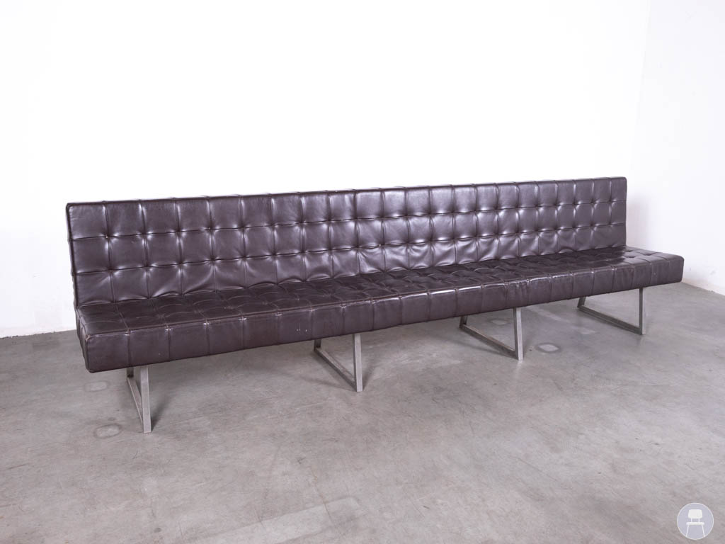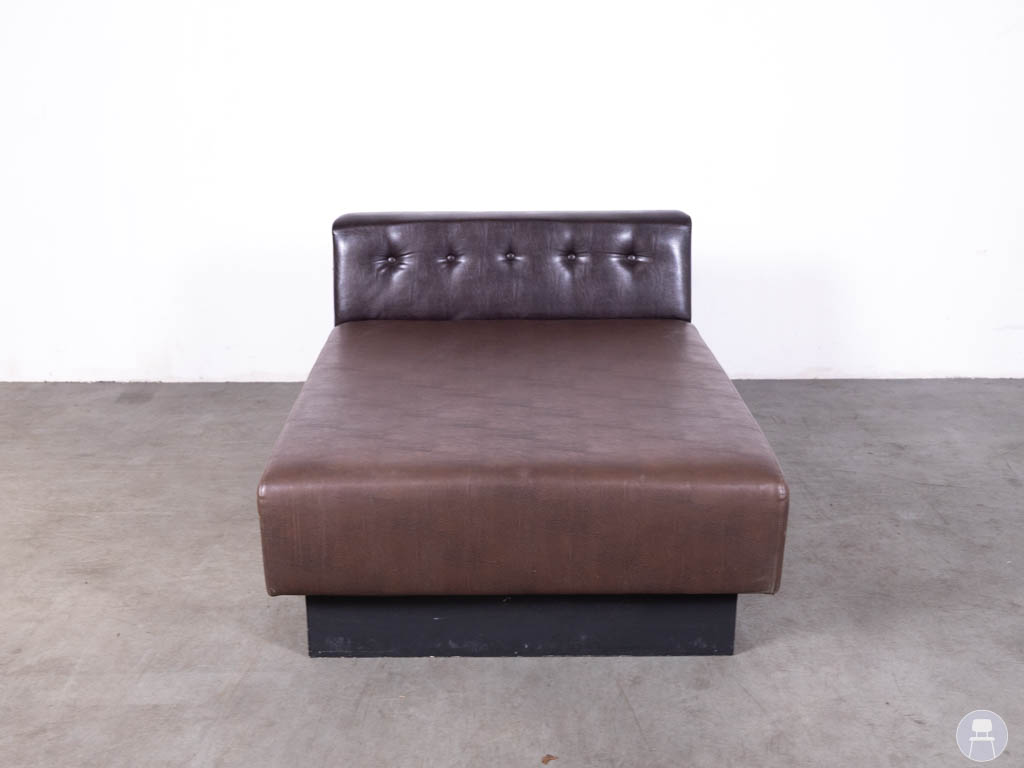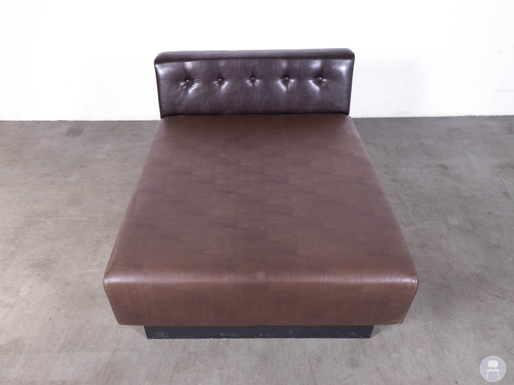 De bank is uitgevoerd in bruine bekleding met een elegante rugleuning voorzien van subtiele knopen, wat zorgt voor een klassieke en sfeervolle uitstraling. De stevige basis geeft de loungebank een stabiele en robuuste constructie.