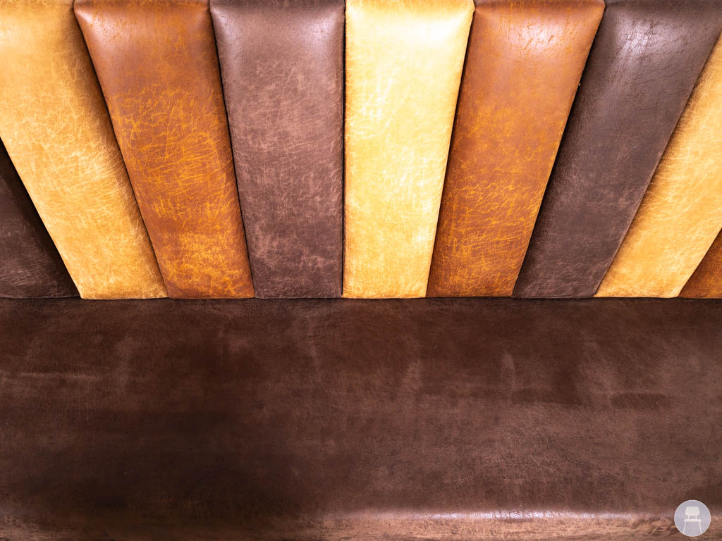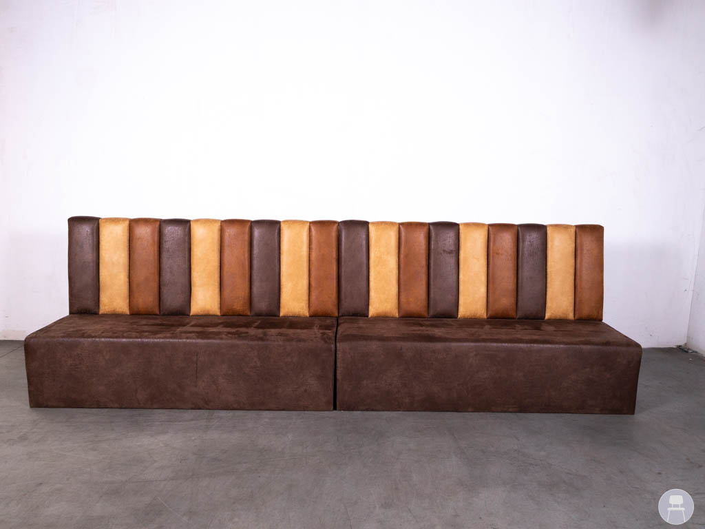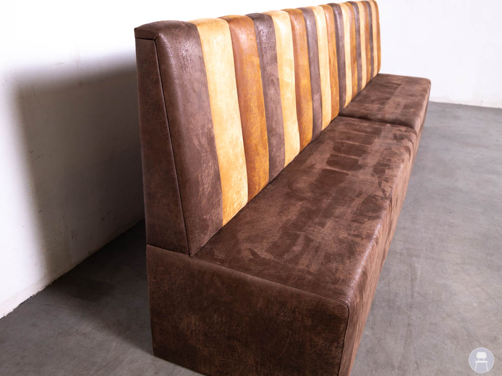 Deze horecabank heeft een totale lengte van 362 cm en bestaat uit 2 delen die eenvoudig aan elkaar geplaatst kunnen worden. De bekleding is uitgevoerd in microvezel en skai leer, in verschillende bruine en warme tinten, wat zorgt voor een unieke en sfeervolle look. De verticale stiknaden in de rugleuning geven de bank een moderne en stijlvolle afwerking. Daarnaast is de bank volledig bekleed aan de achterkant, waardoor deze vrij in de ruimte geplaatst kan worden.