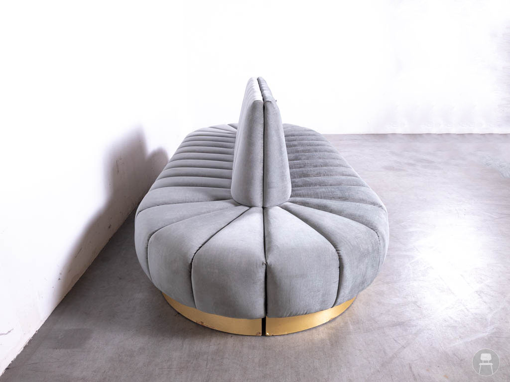 Horecabank Judith zeegroen ovaal PMP 305cm is een absolute eyecatcher voor elke stijlvolle horecazaak! Met haar royale ovale vorm van 305 cm, chique zeegroene velvet bekleding en elegante verticale stiknaden straalt deze bank pure luxe uit. De goudkleurige plint aan de onderzijde maakt het plaatje helemaal af en geeft het geheel een extra glamoureuze uitstraling. De horecabank bestaat uit twee losse delen waarvan de rugleuningen tegen elkaar aan worden geschoven, wat het een veelzijdige keuze maakt voor bijvoorbeeld een midden opstelling in een ruimte.