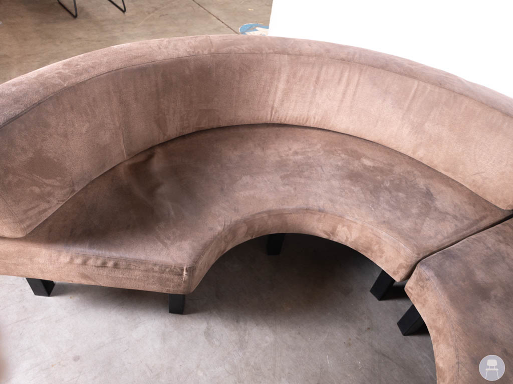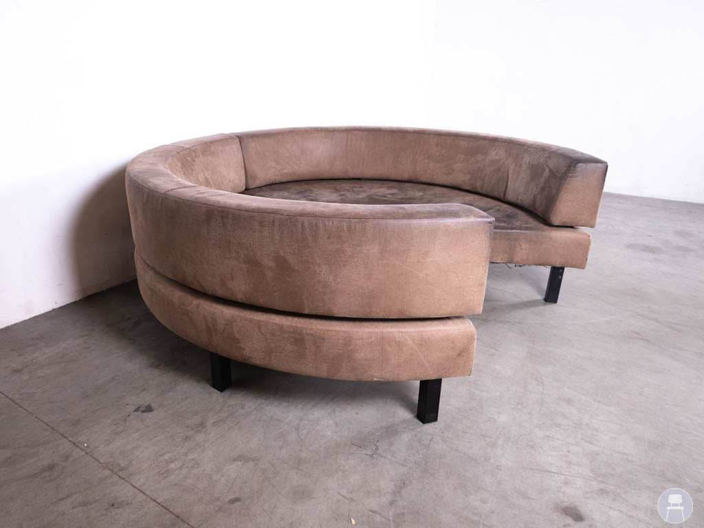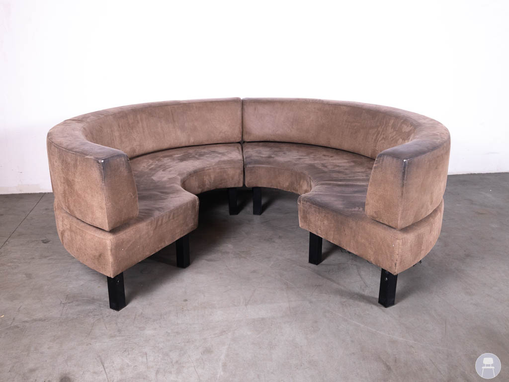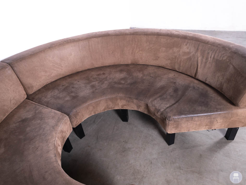 De bank heeft een ronde opstelling met een diameter van circa 240 cm en bestaat uit twee losse delen die eenvoudig tegen elkaar geplaatst kunnen worden. Hierdoor is de bank praktisch te verplaatsen en flexibel in te zetten binnen het interieur.