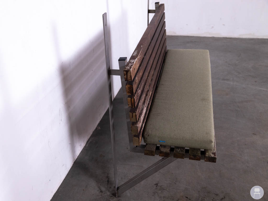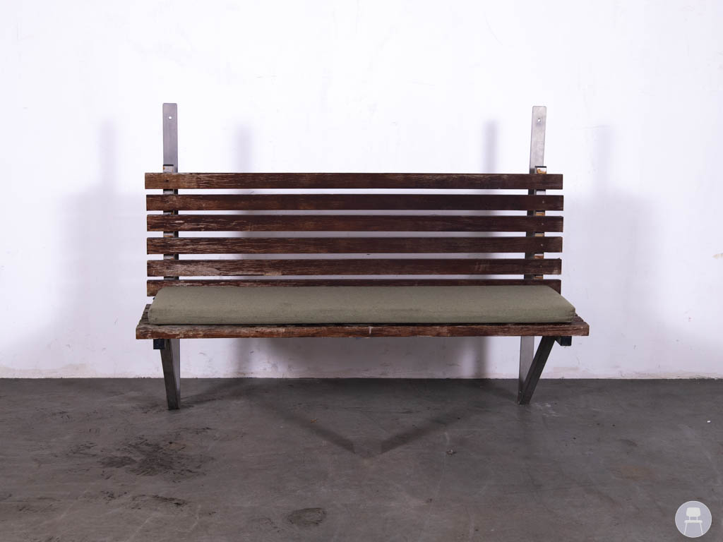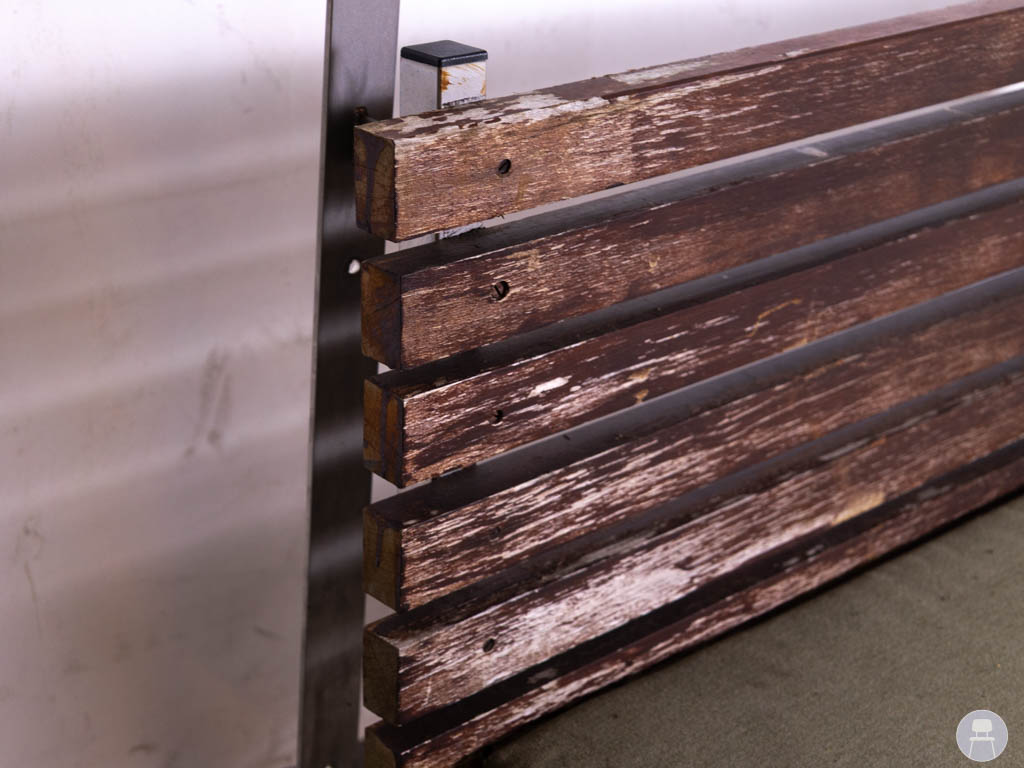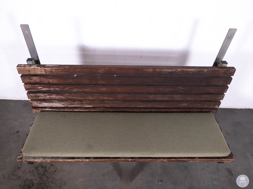 Deze buiten wandbank met kussen vertoont beschadigingen op het hout en lichte vlekjes op de stof. Dit is voornamelijk optisch en past bij een doorleefde, karaktervolle uitstraling. Let op: het hout heeft gebruikssporen.