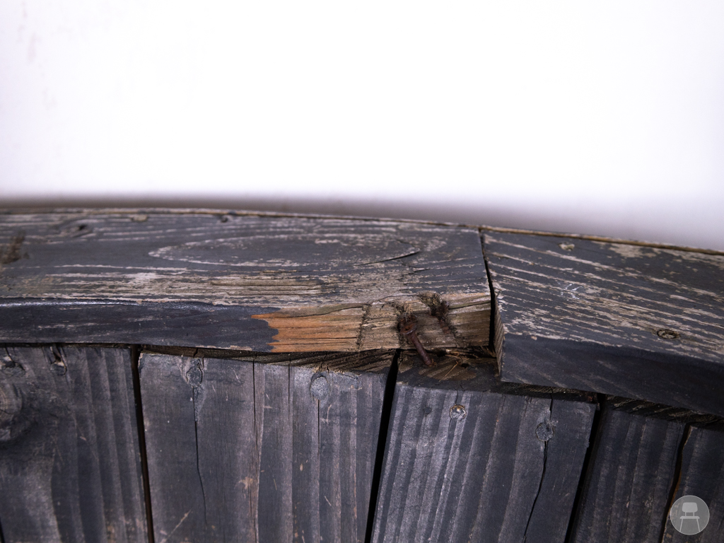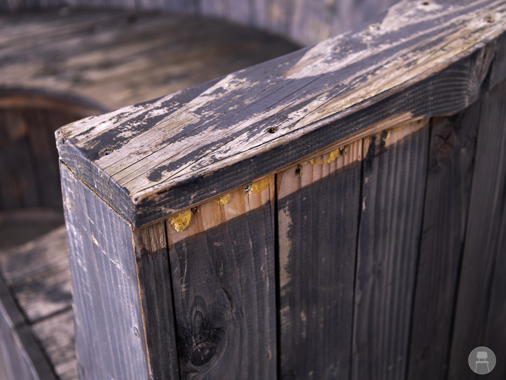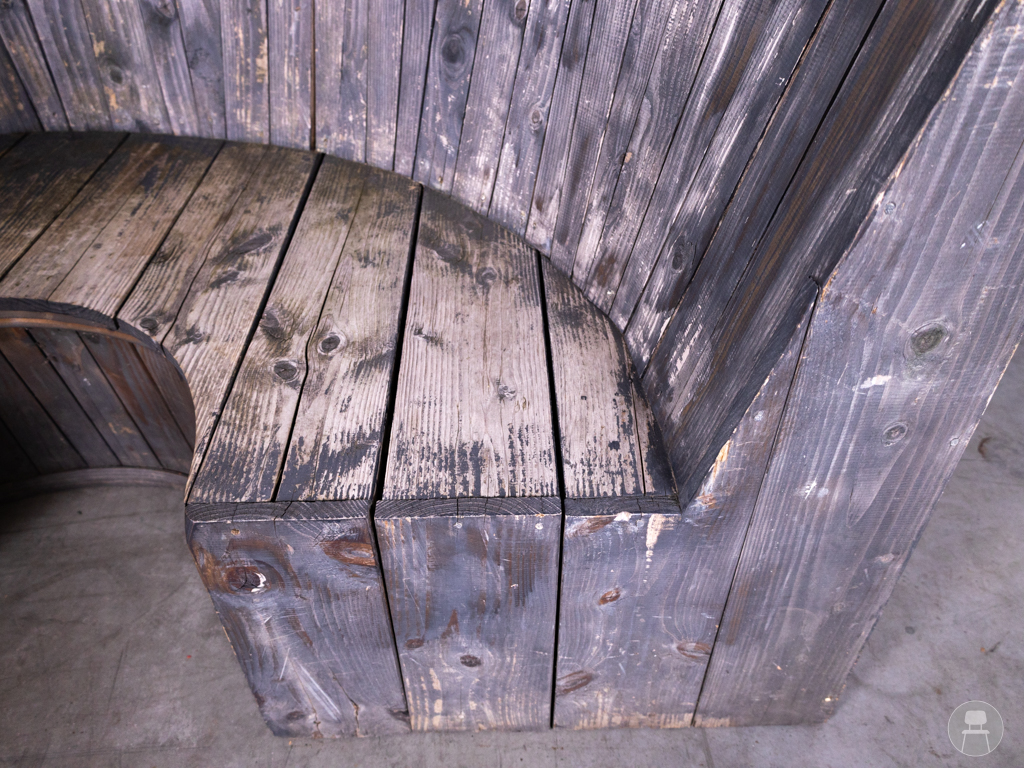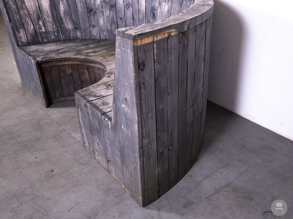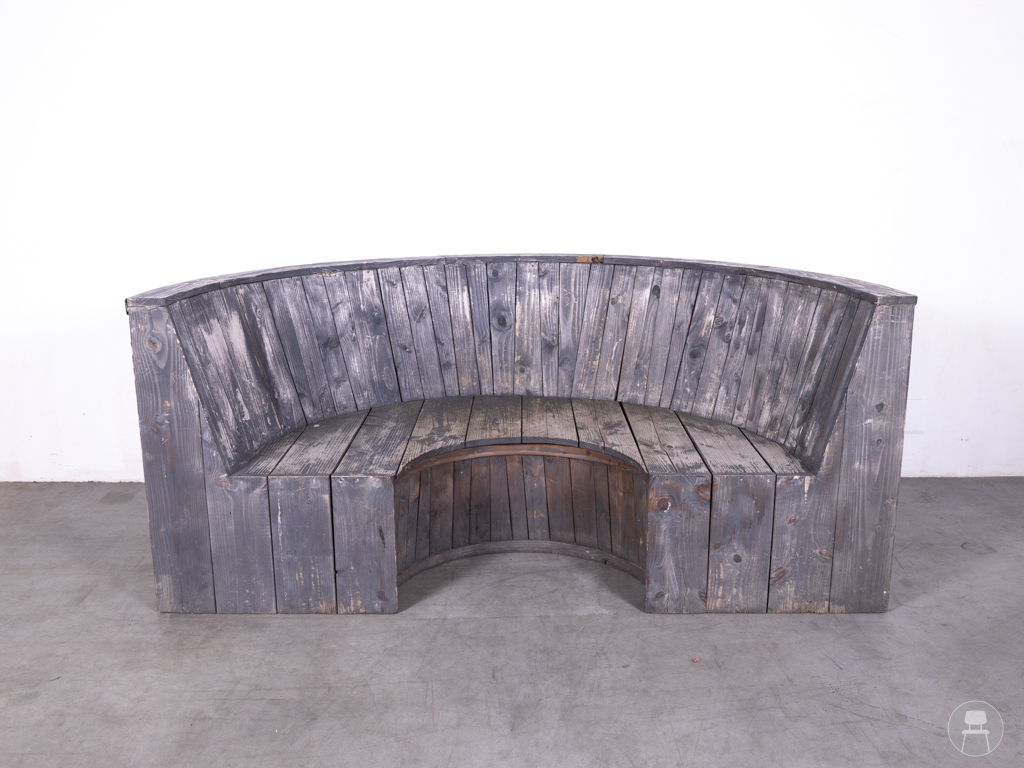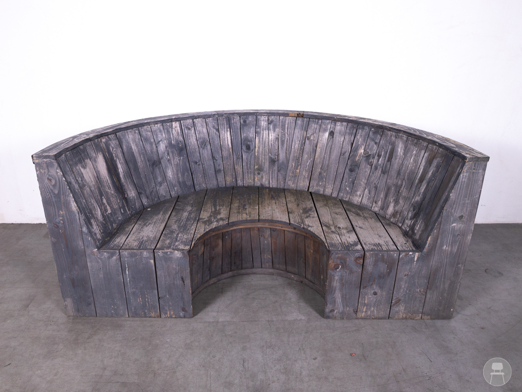 Terrasbank Cirkel grijs 230cm is een opvallende, halfronde bank met een stoere en robuuste uitstraling. Deze terrasbank is volledig vervaardigd uit massief hout en uitgevoerd in een verweerd grijs, wat zorgt voor een karaktervolle en industriële look. Met een lengte van 230 cm biedt de bank ruim zitcomfort voor meerdere personen. Ondanks enkele zichtbare gebruikssporen is de constructie stevig en geschikt voor intensief gebruik op het terras of in de buitenruimte.