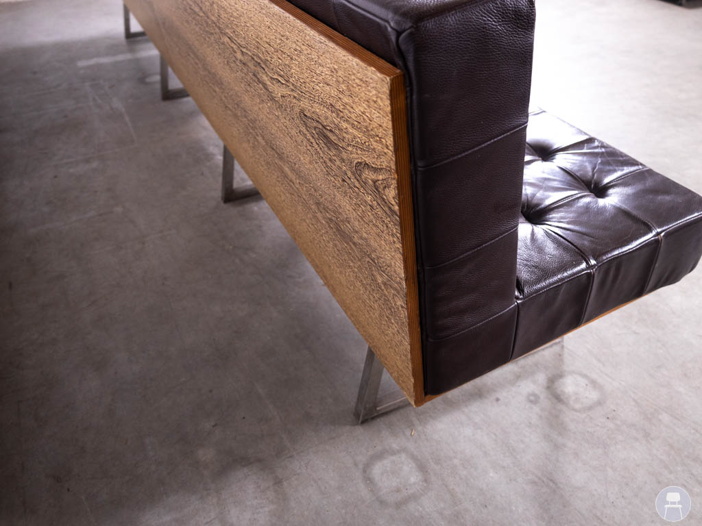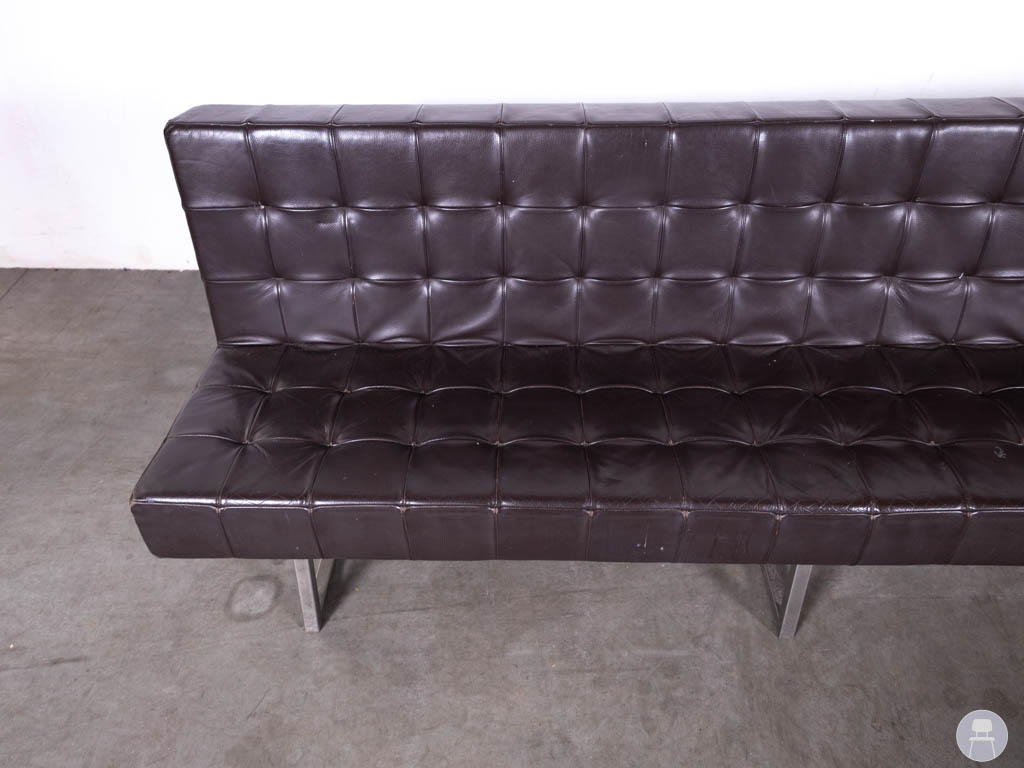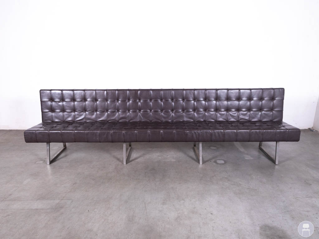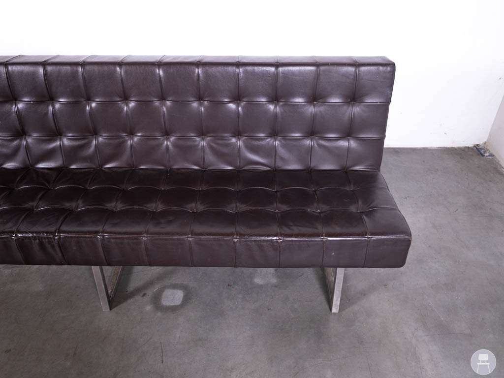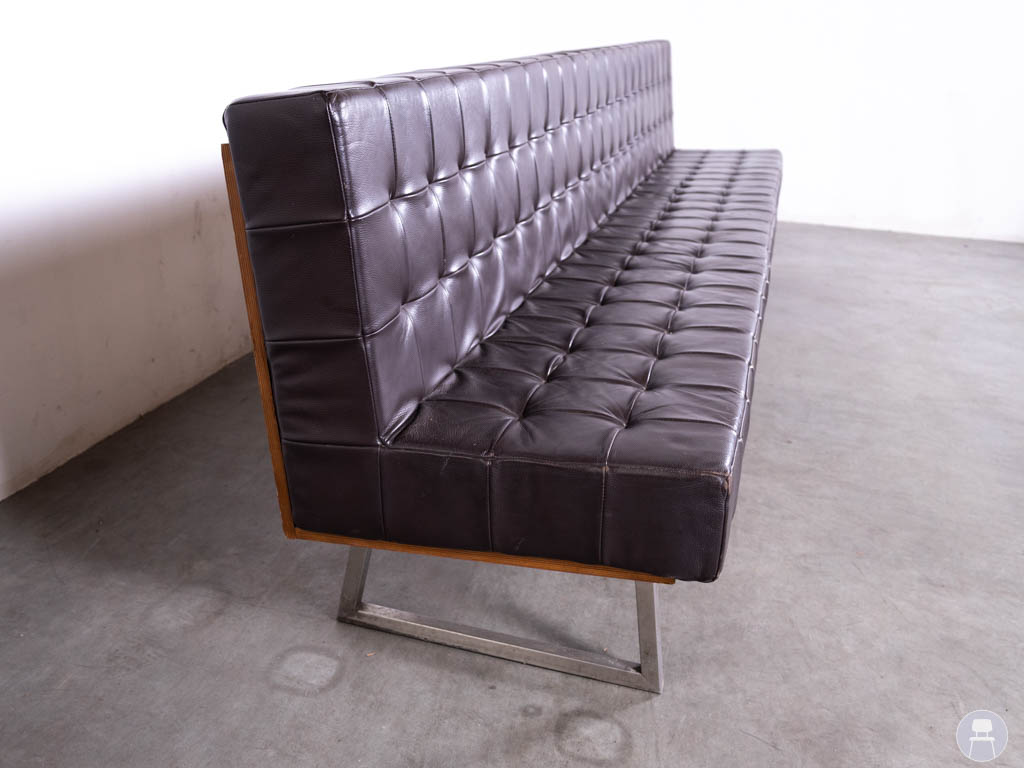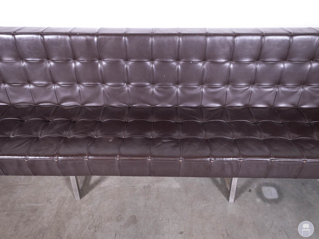 Het slanke metalen onderstel zorgt voor een moderne touch en biedt tegelijkertijd een stevige en stabiele basis. Dankzij het lange, rechte ontwerp is deze wandbank perfect geschikt om tegen een muur te plaatsen, maar ook vrijstaand kan hij dienen als echte blikvanger in de ruimte. Let op, de bank heeft gebruikssporen op het skai leer. Bent u op zoek naar een lange horecabank? Deze wandbank combineert comfort, uitstraling en functionaliteit in één stijlvol meubelstuk.