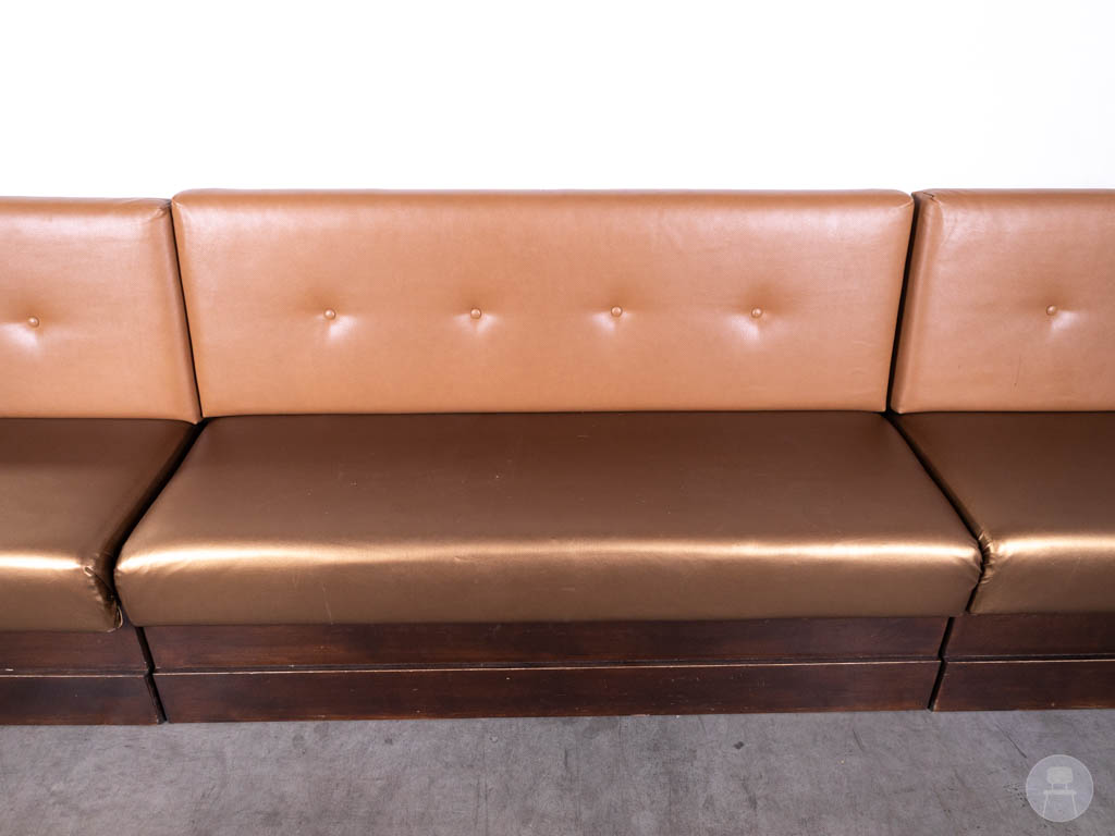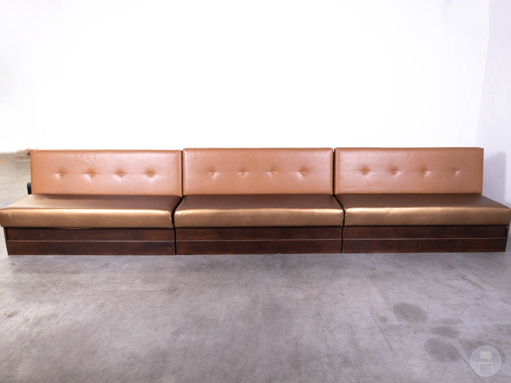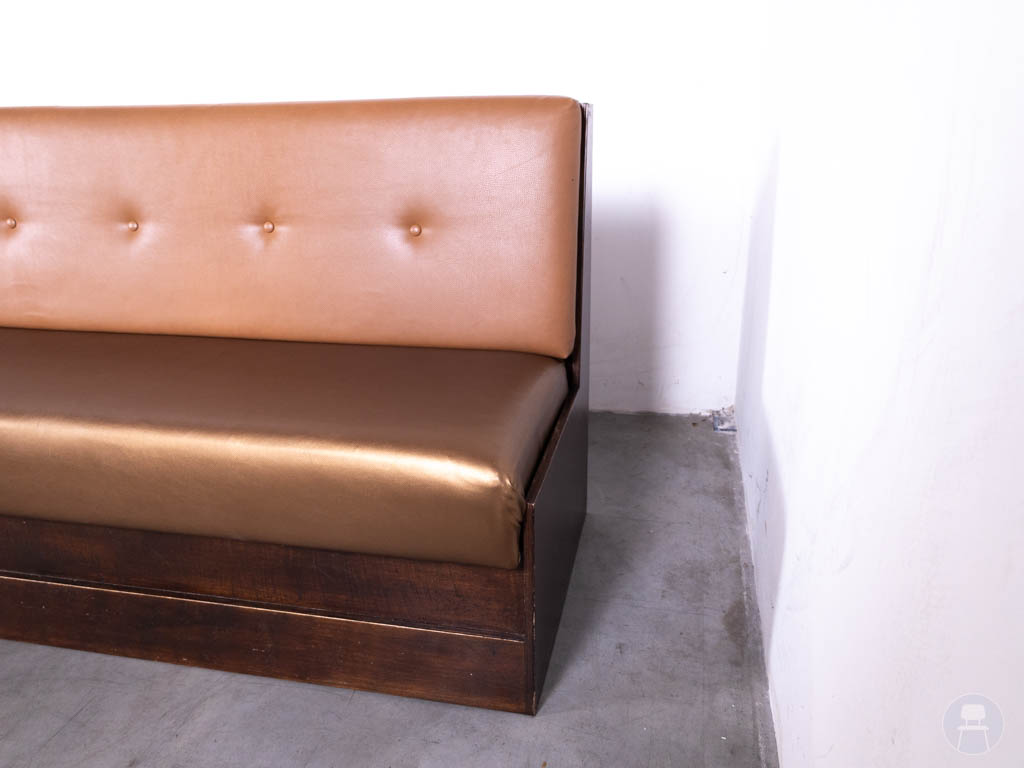 Wandbank Madeleine bruin 510cm is een indrukwekkende en stijlvolle zitoplossing voor iedere horecazaak die op zoek is naar comfort, klasse én een vleugje retro allure. Met een lengte van maar liefst 510 cm biedt deze bank ruim plaats aan grote gezelschappen, ideaal voor restaurants, grand cafés of hotellounges. De wandbank is opgebouwd uit drie losse delen, waardoor hij flexibel te plaatsen is. Het stevige houten frame zorgt voor stabiliteit en duurzaamheid, terwijl de bekleding van skai leder niet alleen onderhoudsvriendelijk is, maar ook luxe oogt. De goudkleurige zitting springt er subtiel uit en vormt een mooi contrast met de warme bruine rugleuning. De dichte achterkant maakt de horecabank ook geschikt als scheidingselement in de ruimte. Madeleine is meer dan een zitmeubel – het is een sfeermaker die je interieur direct naar een hoger niveau tilt.