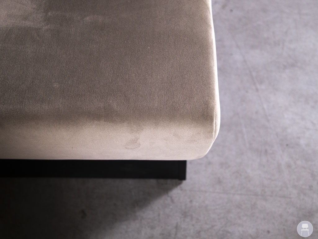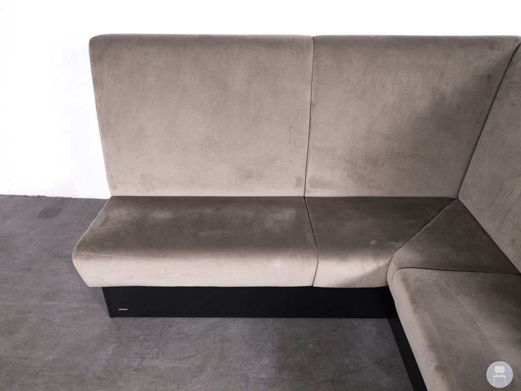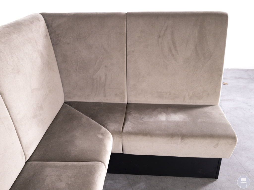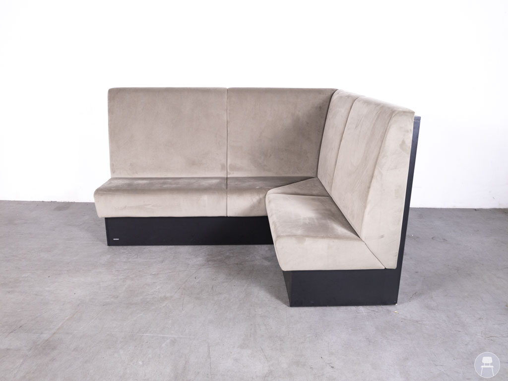 Wandbank Soho Diner Arie velvet grijs Satelliet 155x195cm is een stijlvolle en comfortabele zitoplossing voor elke horecagelegenheid. Deze wandbank bestaat uit twee losse delen, waardoor hij flexibel te plaatsen is in een hoekopstelling. De zachte grijs/beige velvet bekleding zorgt voor een luxe uitstraling en past perfect in moderne cafés, restaurants of hotelrestaurants. Het hoge zitcomfort en de stevige zwarte sokkel maken deze bank van het merk Satelliet geschikt voor intensief gebruik, terwijl het design bijdraagt aan een sfeervolle inrichting. Tweedehands maar in goede staat, met lichte gebruikssporen die de bank juist een authentiek karakter geven.