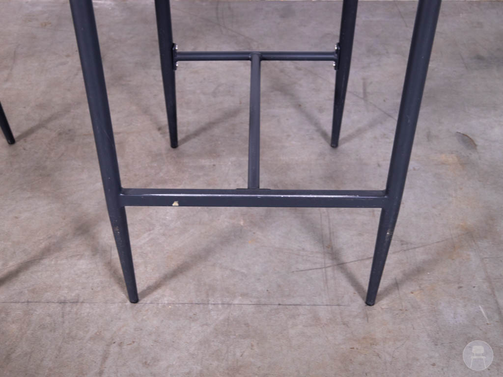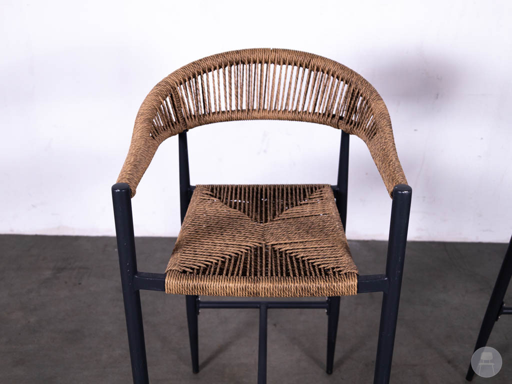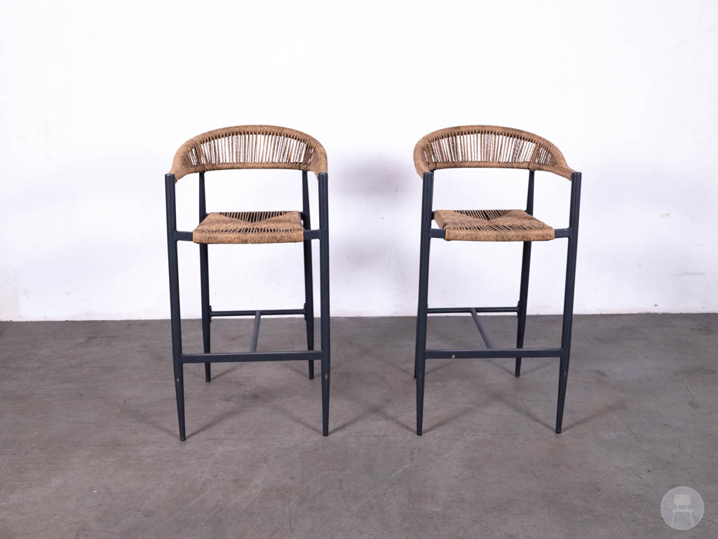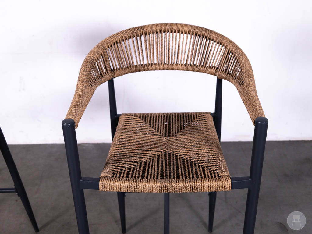 Het frame is uitgevoerd in zwart staal, wat zorgt voor een stevige constructie en een modern contrast met het gevlochten materiaal. Dankzij de voetsteun zitten deze barkrukken ook comfortabel voor langere tijd.