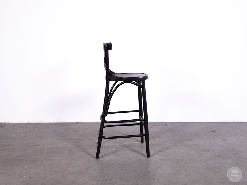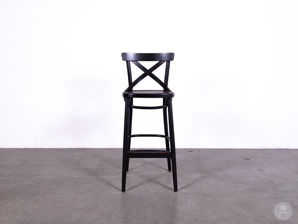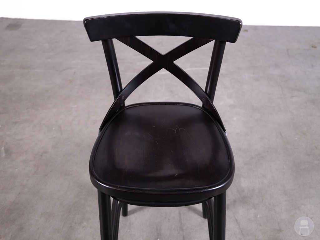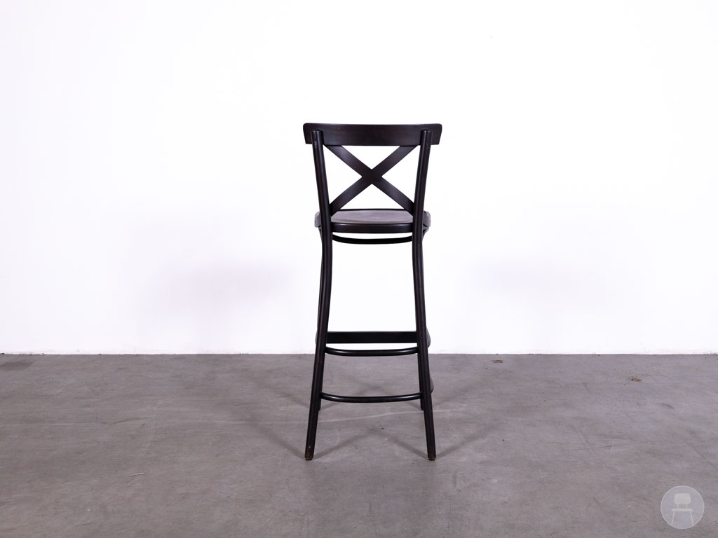 Deze barkruk is uitgevoerd in het populaire Crossback model met een kenmerkende kruisrug. De kruk is volledig vervaardigd uit hout en afgewerkt in een donkerbruine kleur, wat zorgt voor een robuuste en authentieke look. Het stevige houten frame maakt deze barkruk geschikt voor intensief horeca gebruik.