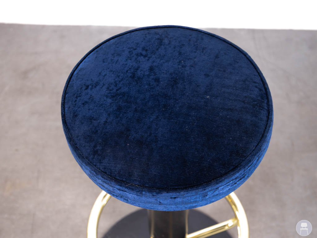 Barkruk Irma velvet blauw goud is een luxe en elegante barkruk die perfect past binnen een stijlvol horeca interieur. De zitting is bekleed met zachte velvet stof in een diepe donkerblauwe kleur, wat zorgt voor een chique en warme uitstraling.