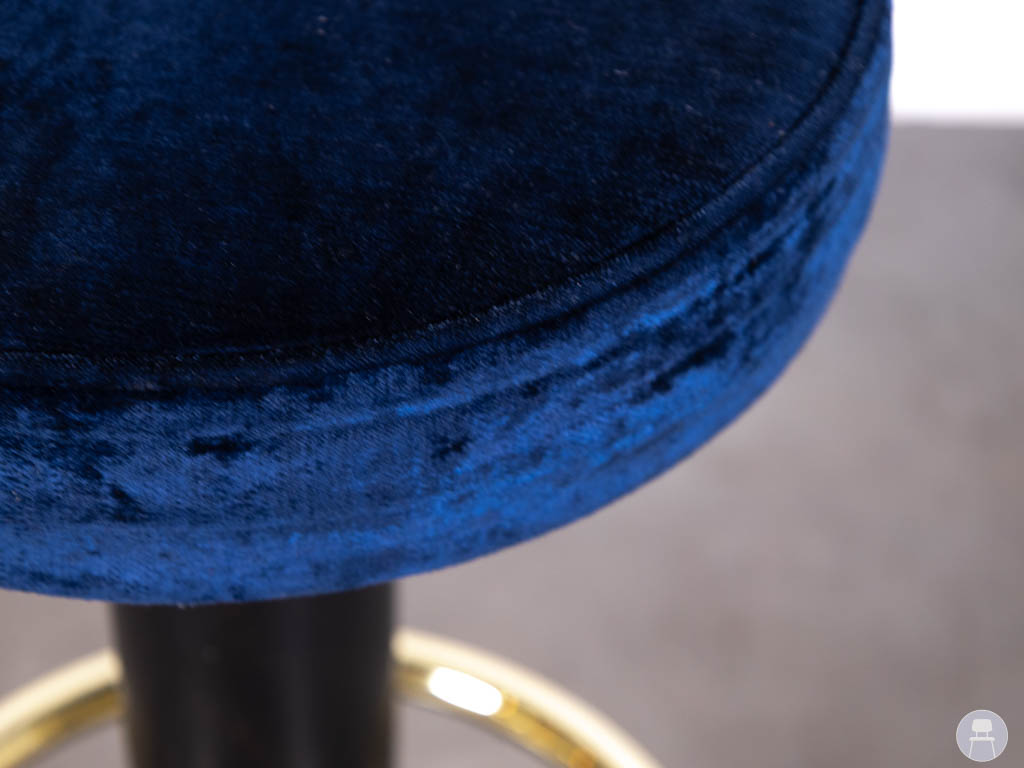 Het onderstel is uitgevoerd in zwart metaal met een opvallende gouden voetsteun en accenten, wat deze barkruk een exclusieve en moderne look geeft. De combinatie van blauw velvet en goud is momenteel een sterke trend binnen de horeca en zorgt direct voor een luxe sfeer in bijvoorbeeld een bar, restaurant of hotel.