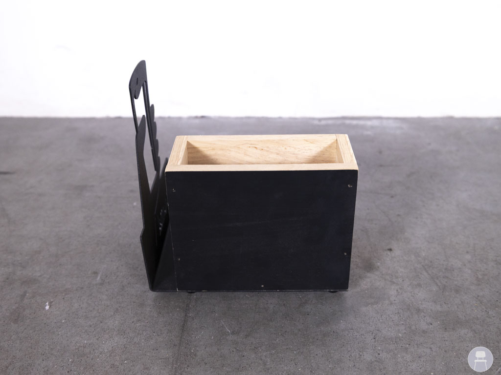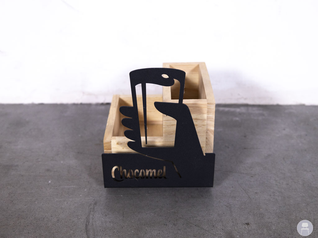 De houder beschikt over twee vakken: ideaal voor het organiseren van bestek, servetten, suikerzakjes of menukaarten. Aan één zijde bevindt zich een decoratief zwart metalen element met een uitgesneden Chocomel-logo en een krijtbordje, waarop je bijvoorbeeld een dagaanbieding of tafelnummer kunt schrijven.