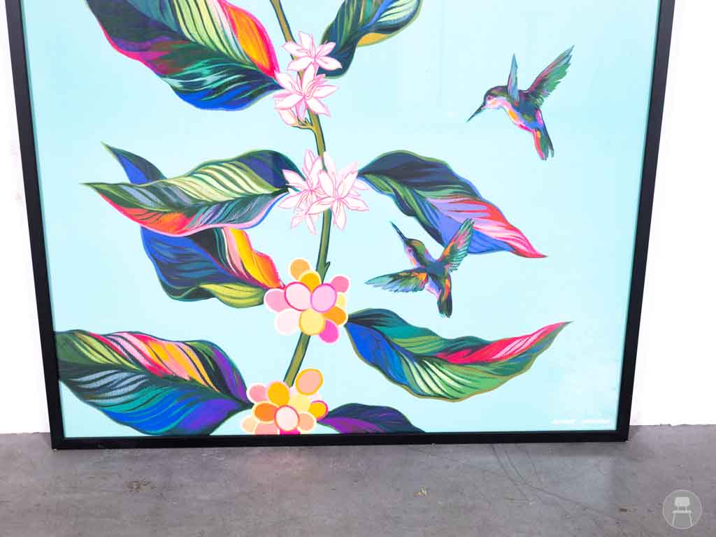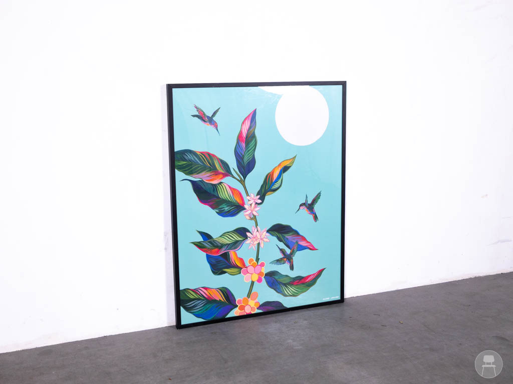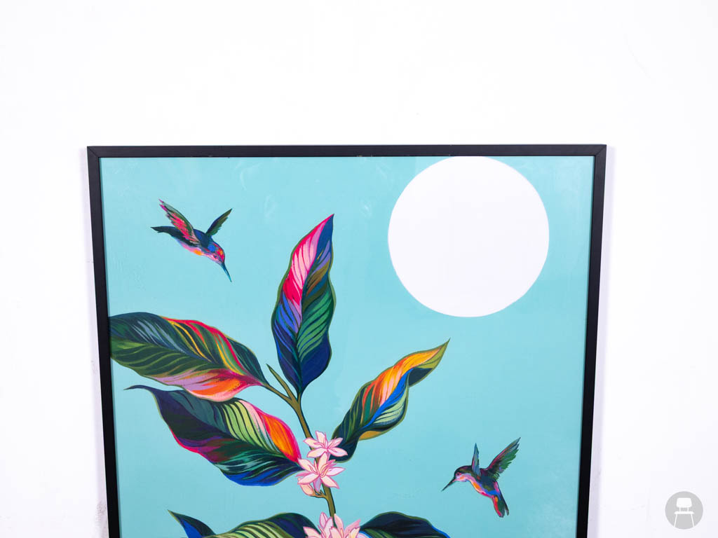 Schilderij Kolibrie 120x95cm brengt kleur en leven in je ruimte. De levendige kleuren, sierlijke kolibries en tropische bladeren op een frisse blauwe achtergrond maken dit werk een echte blikvanger. Het schilderij is modern, vrolijk en perfect voor horeca-inrichtingen, wachtruimtes, kantoren of thuis aan de muur. Afgewerkt in een zwart frame, direct klaar om op te hangen.