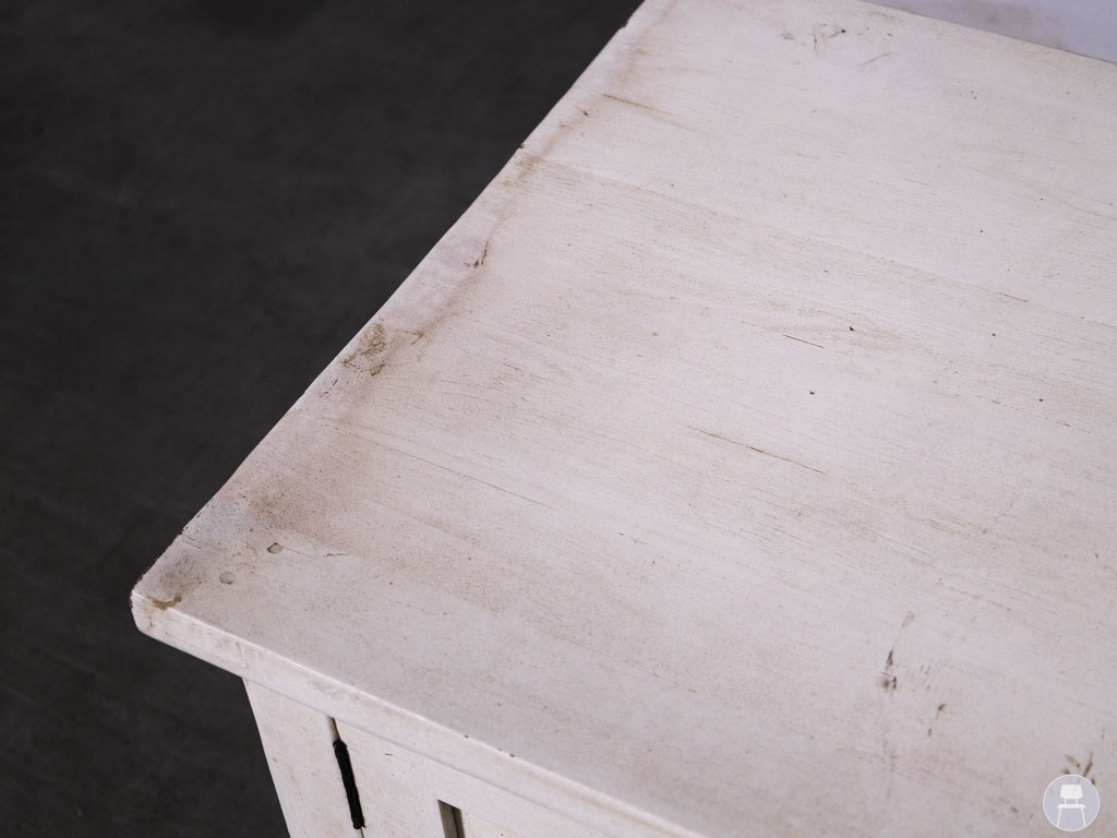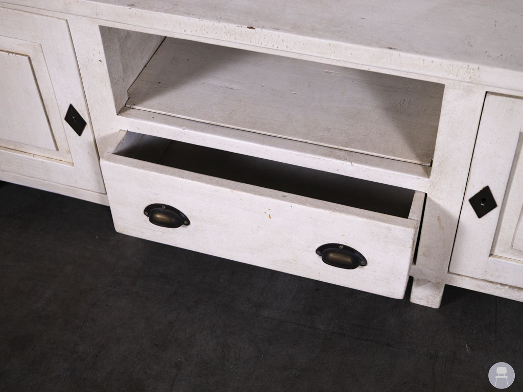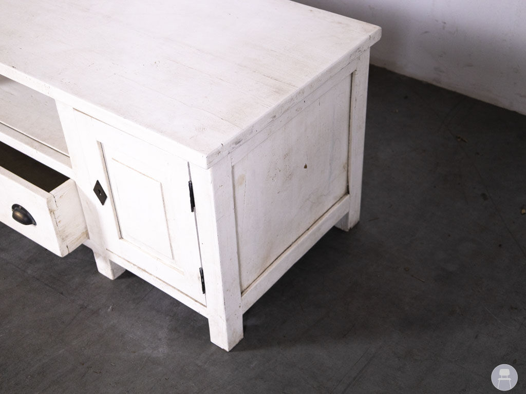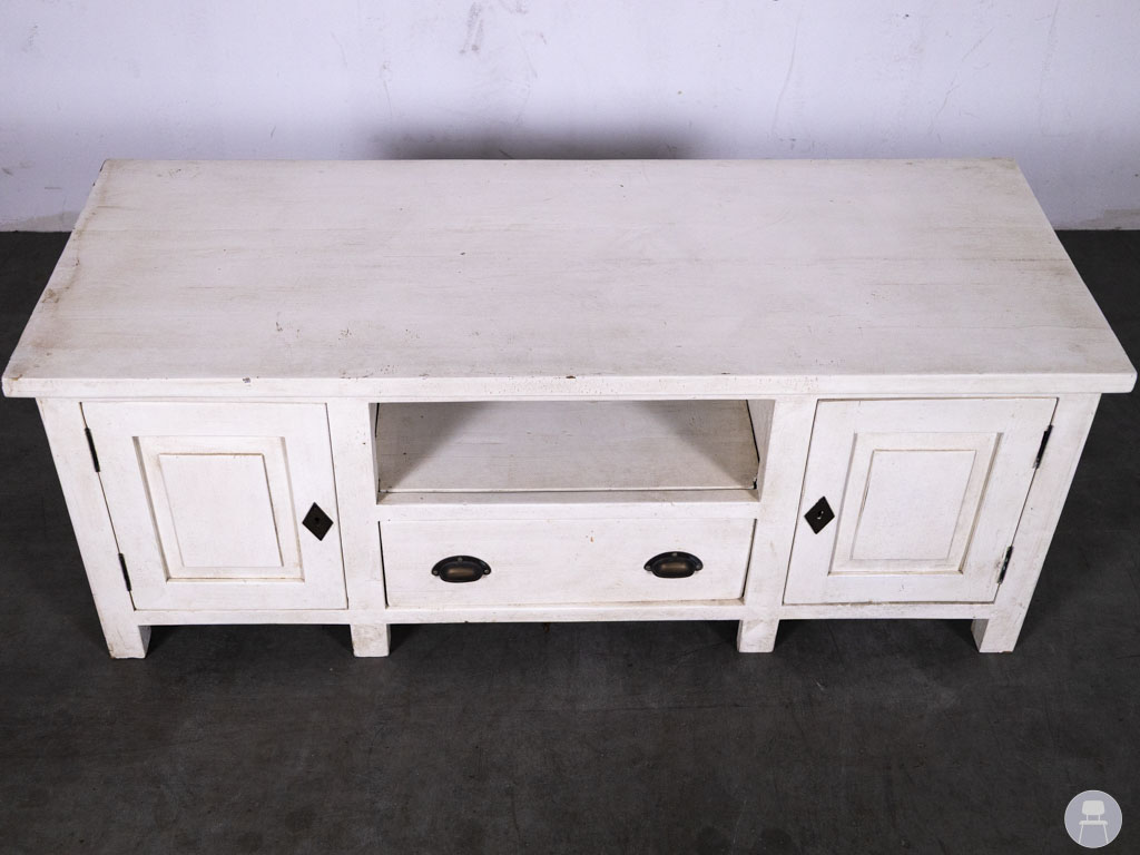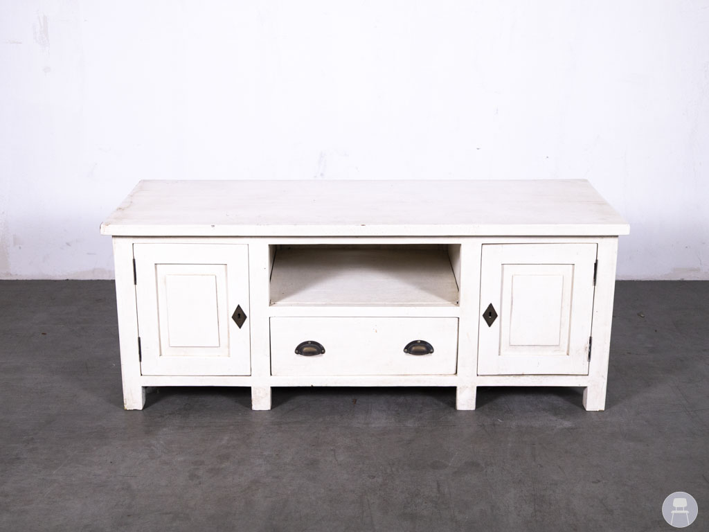Dressoir River wit 135x53cm is een sfeervol en praktisch meubelstuk met een landelijke uitstraling. Dit tweedehands dressoir is uitgevoerd in een gebroken witte kleur en beschikt over twee kastdeuren, een centrale lade en een open vak – ideaal voor het opbergen van servies, accessoires of elektronica.