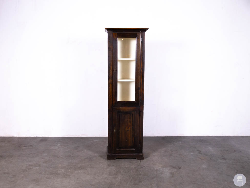 Vitrinekast Show 225cm hoog is een super gave ouderwetse kast gemaakt van massief hout in een donkerbruine kleur. Het bovenste gedeelte van de kast is voorzien van ramen aan alle drie de zijdes. De achterzijde is dicht en is aan de binnenkant voorzien van een spiegel wat zorgt voor een ruimtelijk effect. De onderzijde van de kast heeft een kastje met een mooie deur welke is bewerkt waardoor er een prachtige sierlijst is ontstaan. De vitrinekast staat op wieltjes waardoor deze makkelijk te verplaatsen is.