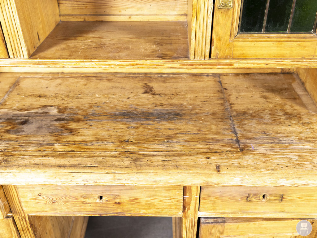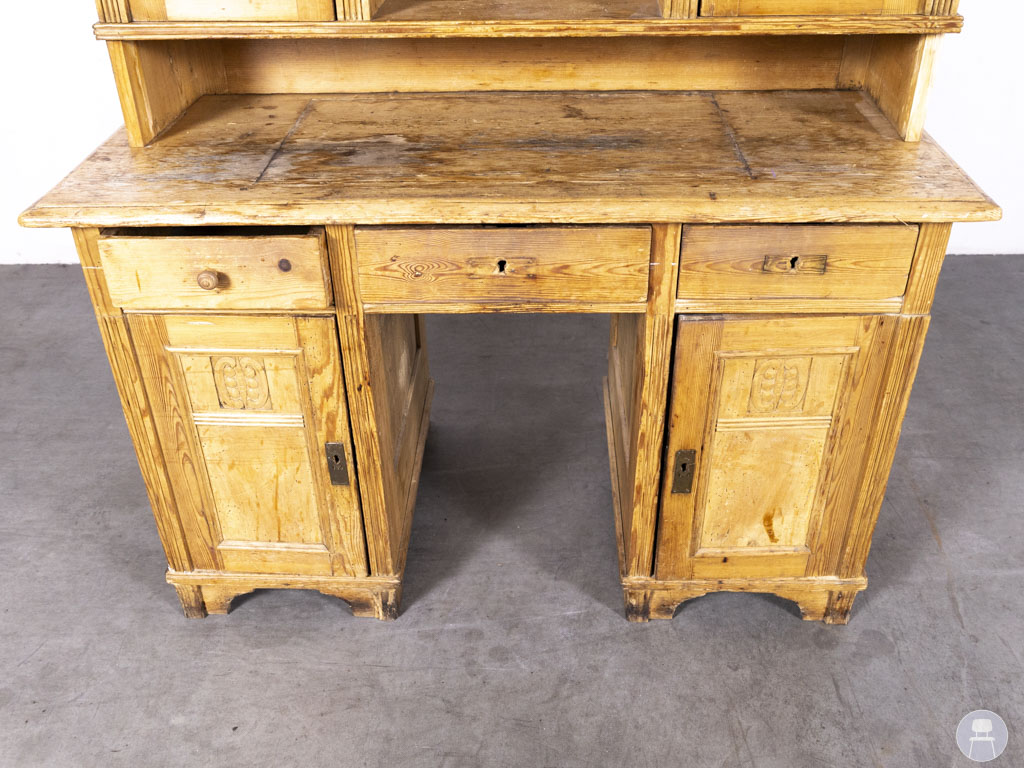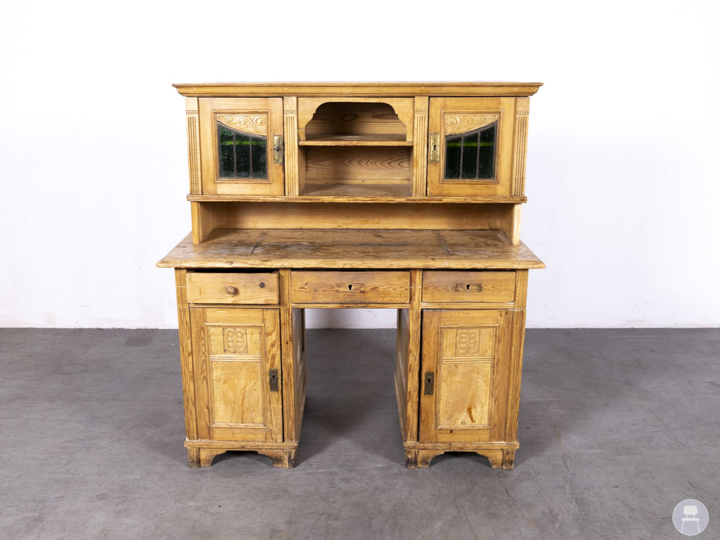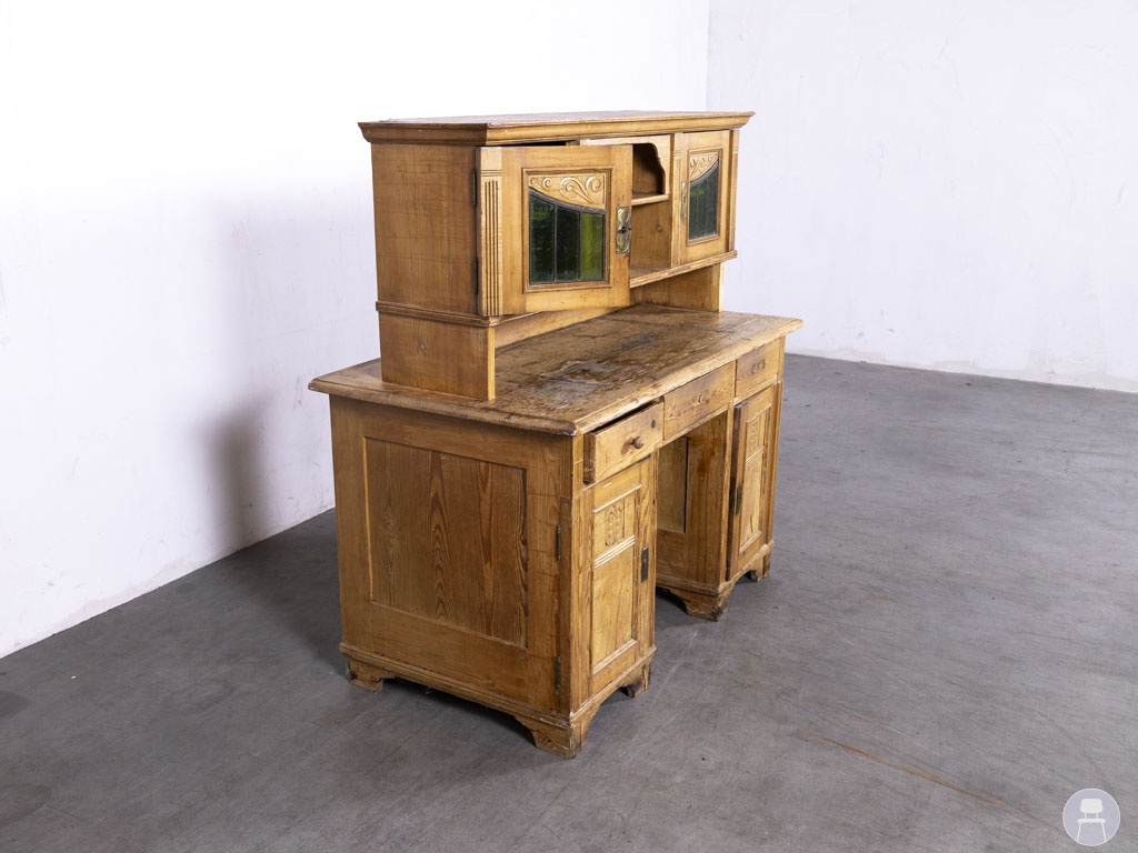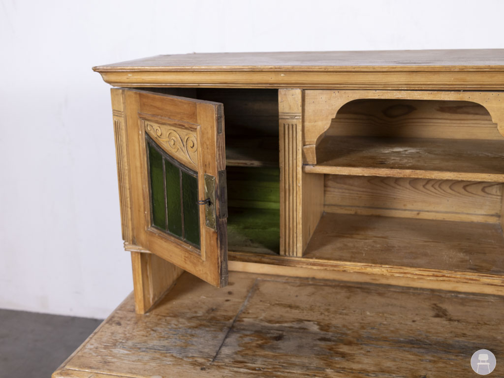 Wandkast Tobias grenen 125x130cm in een warme, naturel houten afwerking is een sfeervol vintage meubel met een unieke uitstraling. De kast heeft sierlijke details in het houtwerk en opvallende glas-in-lood raampjes in een diepe groene kleur. Het bovenblad van de wandkast is ideaal als werk- of presenteeroppervlak, terwijl de diverse opbergvakken zorgen voor praktische functionaliteit. Perfect als decoratief meubel in een horecazaak, winkel of sfeervolle woonruimte met een landelijke of brocante stijl. In gebruikte staat met duidelijke gebruikssporen op het blad en rondom.