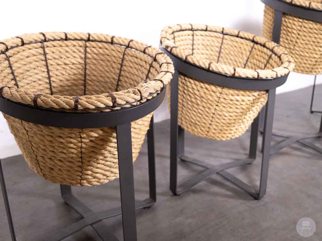 1 set 4 stuks Opbergmand Denise is een ideale mix van functionaliteit en uitstraling. Elke mand bestaat uit een stevig zwart stalen frame met een handgevlochten mand van dik touw, wat zorgt voor een natuurlijke en sfeervolle uitstraling. Deze set is niet alleen praktisch voor het opbergen van diverse spullen, maar ook perfect om producten op een stijlvolle manier te presenteren — bijvoorbeeld in winkels, horecazaken of op markten.