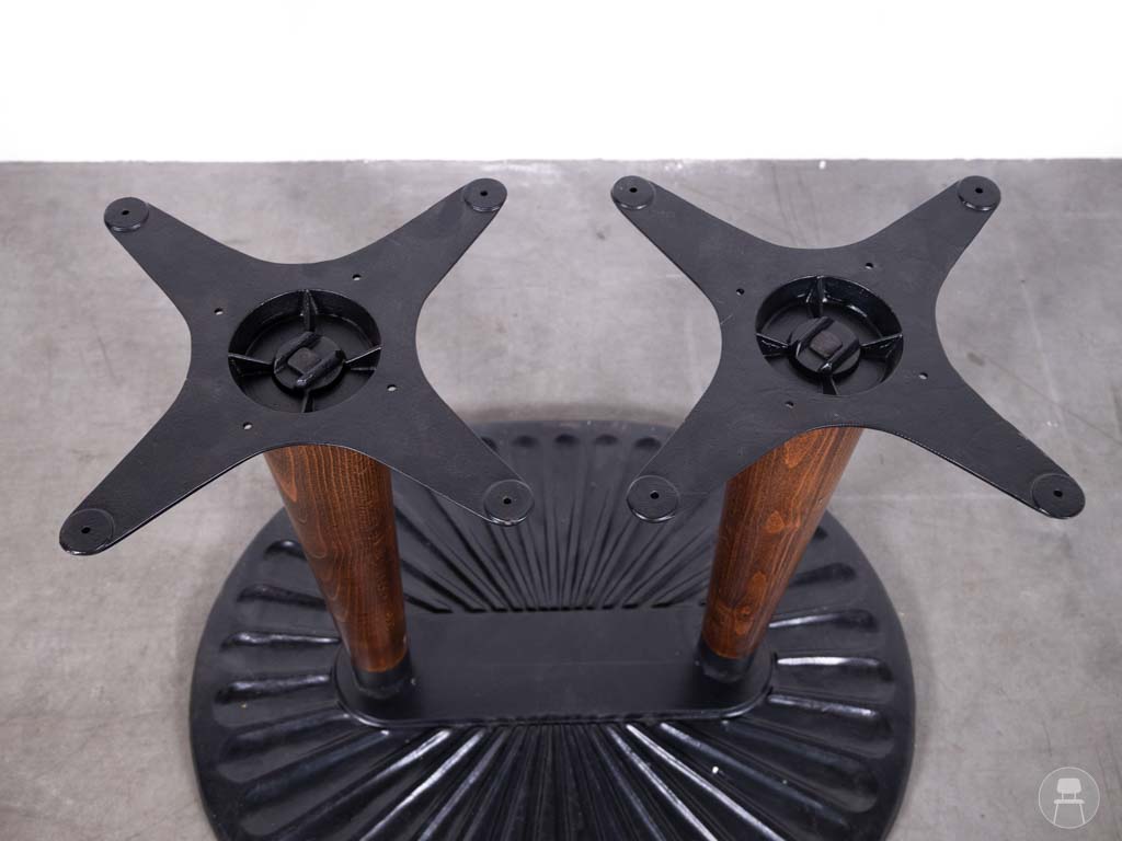 Tafelonderstel Lieke dubbel eiken Hutten is een stijlvolle en stevige basis voor grotere horecatafels die zowel design als functionaliteit belangrijk vinden. Dit hoogwaardige onderstel van het merk Hutten combineert een robuuste stalen voet met een verfijnd patroon én twee elegante kolommen van massief eikenhout. Die combinatie van materialen zorgt voor een warme, luxe uitstraling die perfect past in zowel klassieke als moderne horecazaken.
