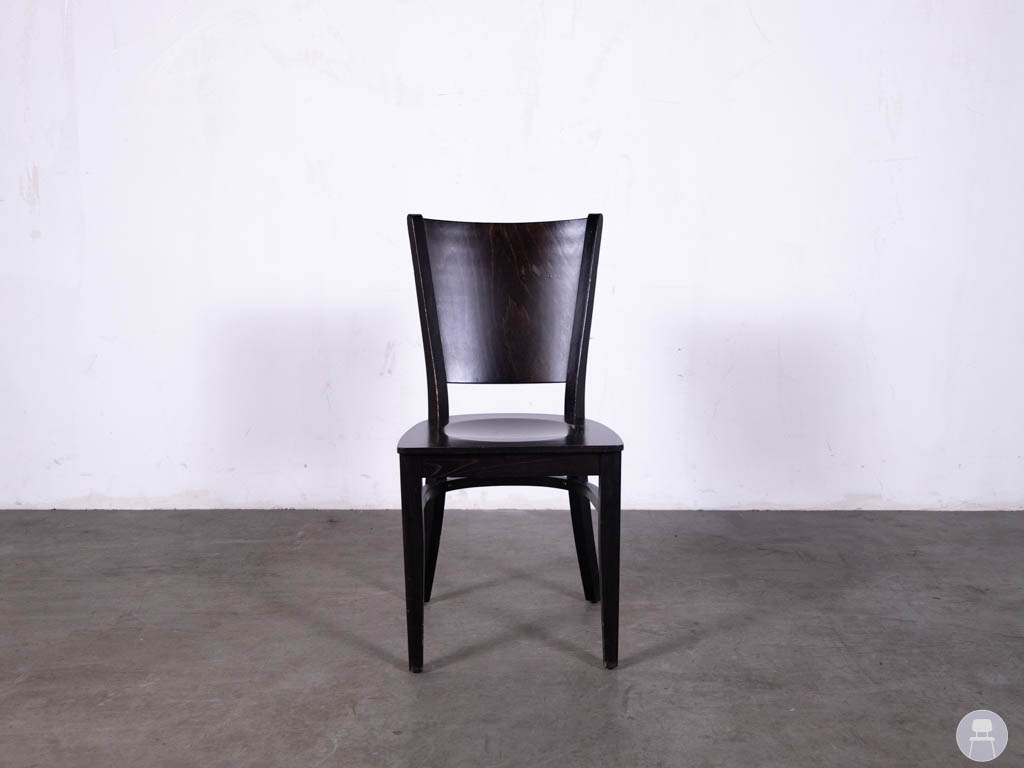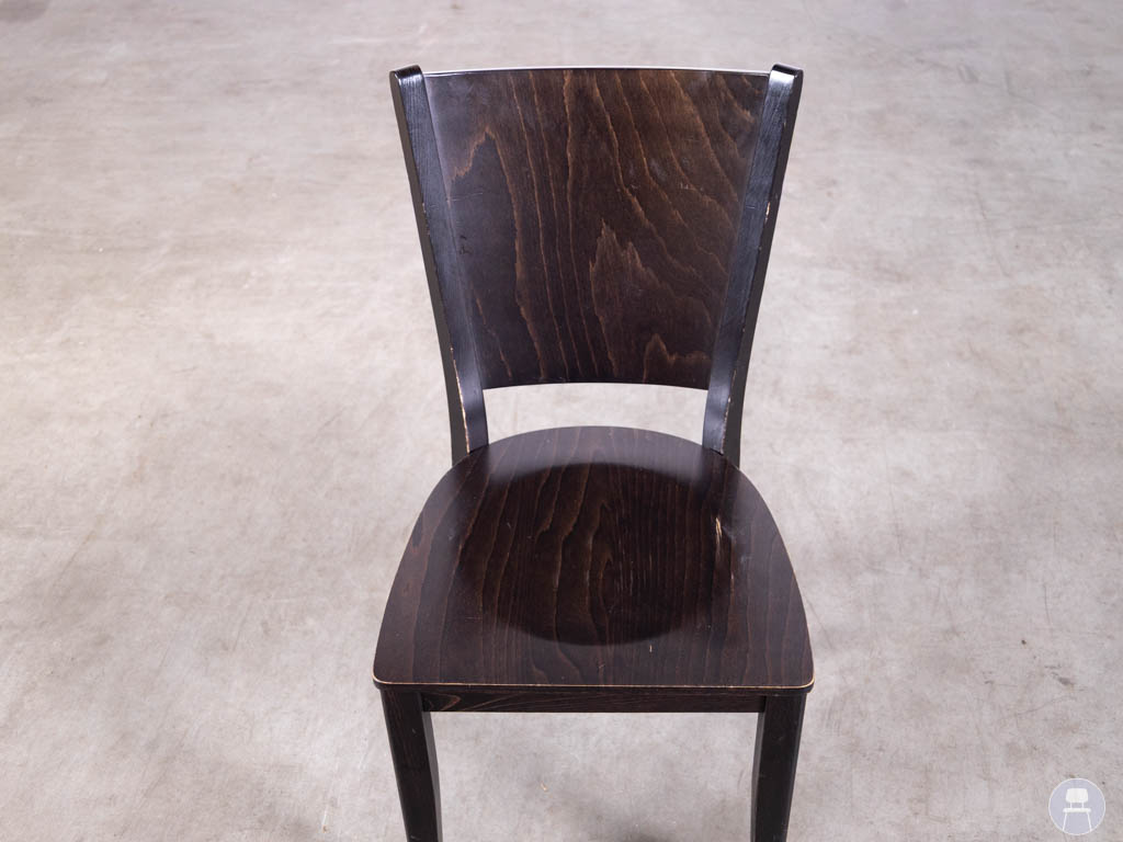 De stoel is uitgevoerd in bruin hout en heeft een elegante, licht gebogen rugleuning die zorgt voor een comfortabele zit. Dankzij het stevige houten frame is de stoel geschikt voor intensief gebruik in de horeca.