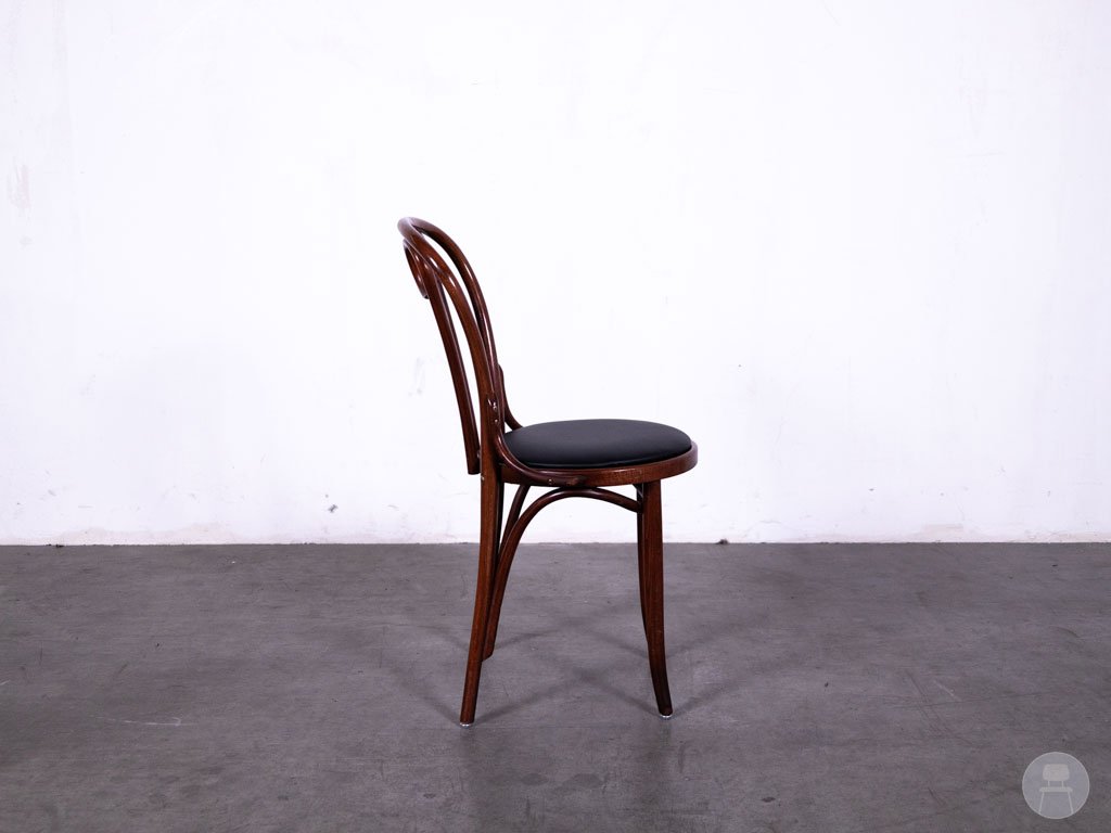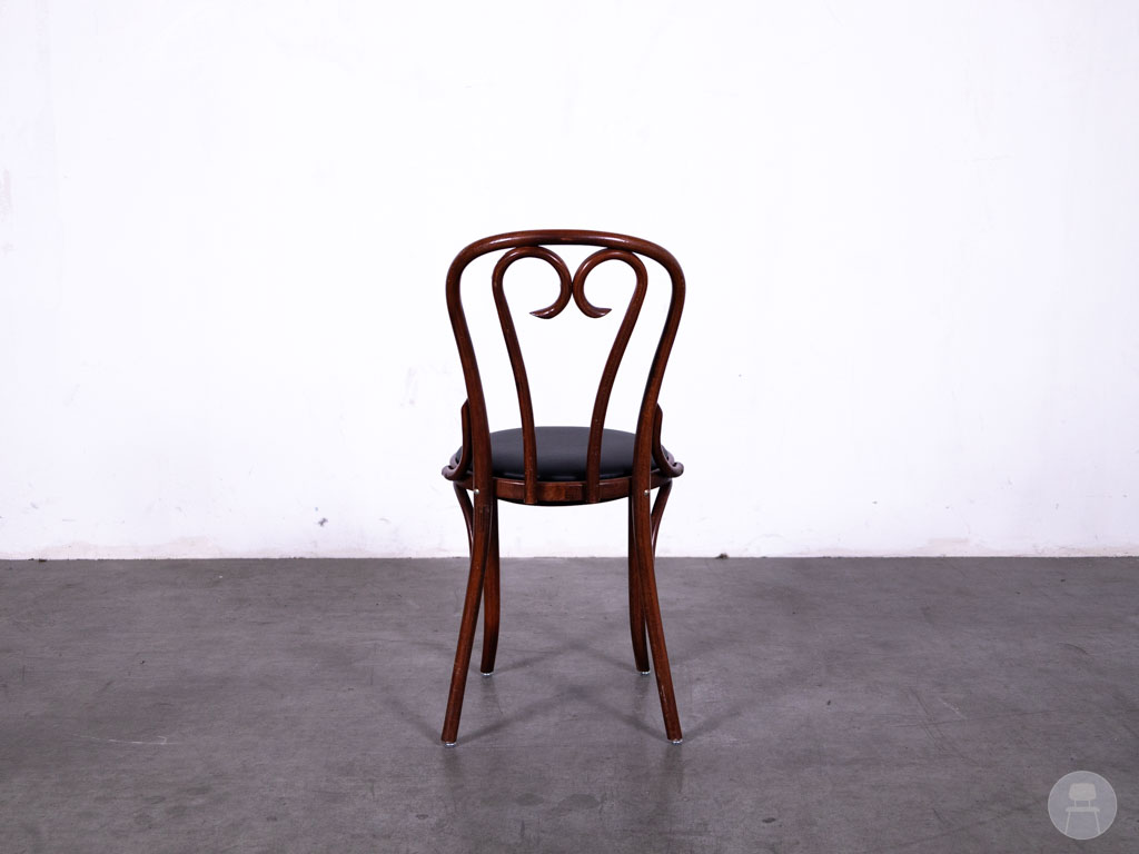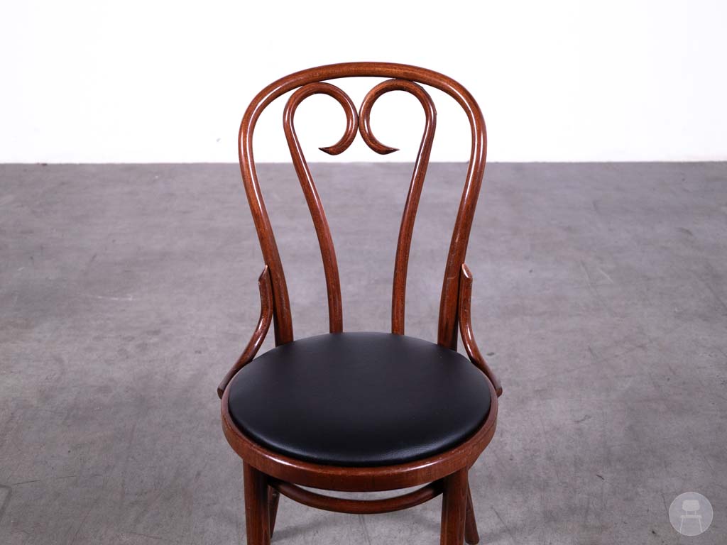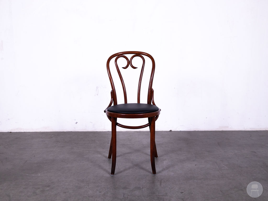 Cafestoel Thonet heart is een klassieker die sfeer en elegantie toevoegt aan iedere horecazaak. Het beukenhouten frame is stevig en stijlvol, maar de echte blikvanger is natuurlijk de sierlijke hartvorm in de rugleuning – een detail dat deze stoel zijn naam en unieke charme geeft. De zwarte skai lederen zitting is door ons volledig opnieuw gestoffeerd, wat zorgt voor een frisse, duurzame afwerking die bovendien gemakkelijk schoon te houden is. Dit maakt de stoel niet alleen mooi, maar ook uiterst praktisch in gebruik.