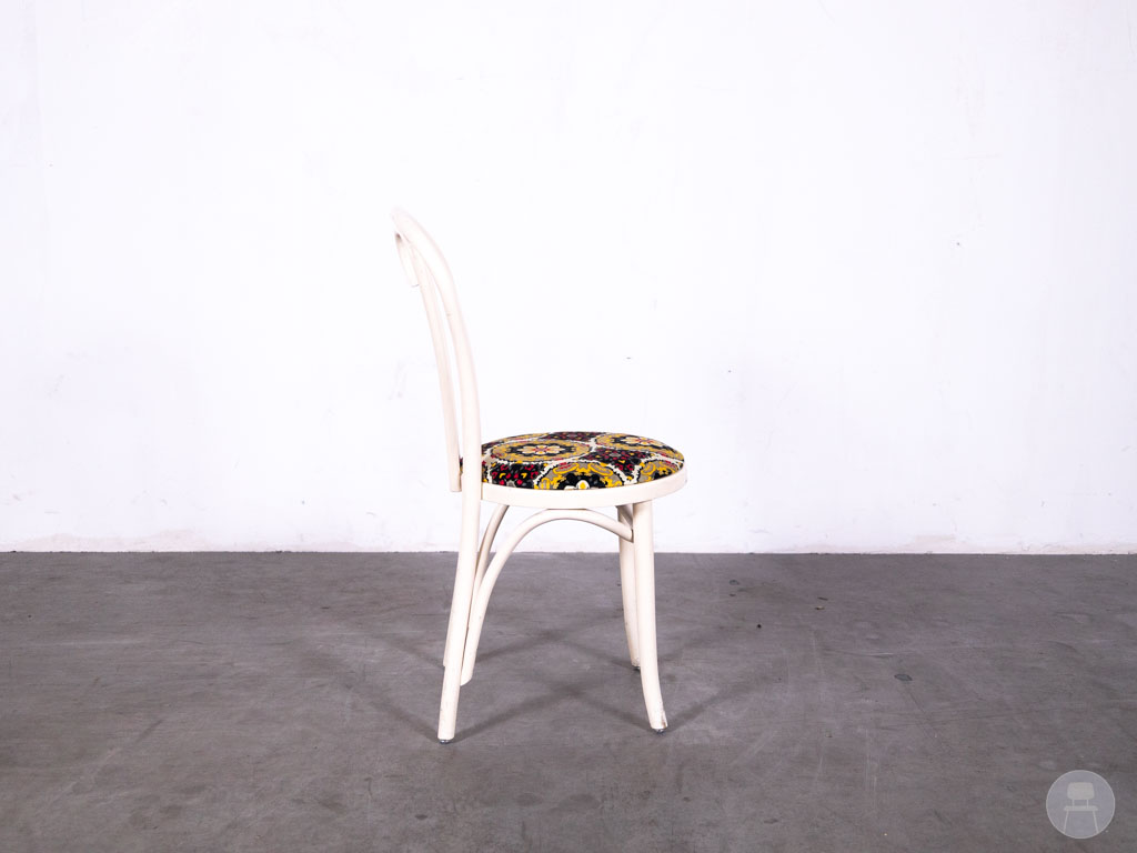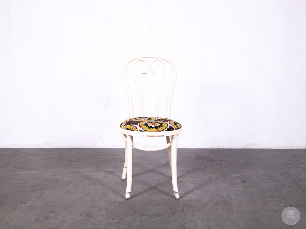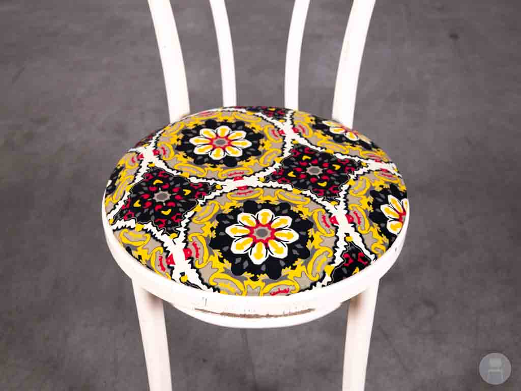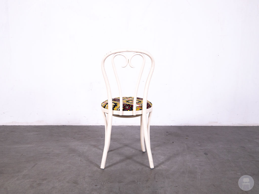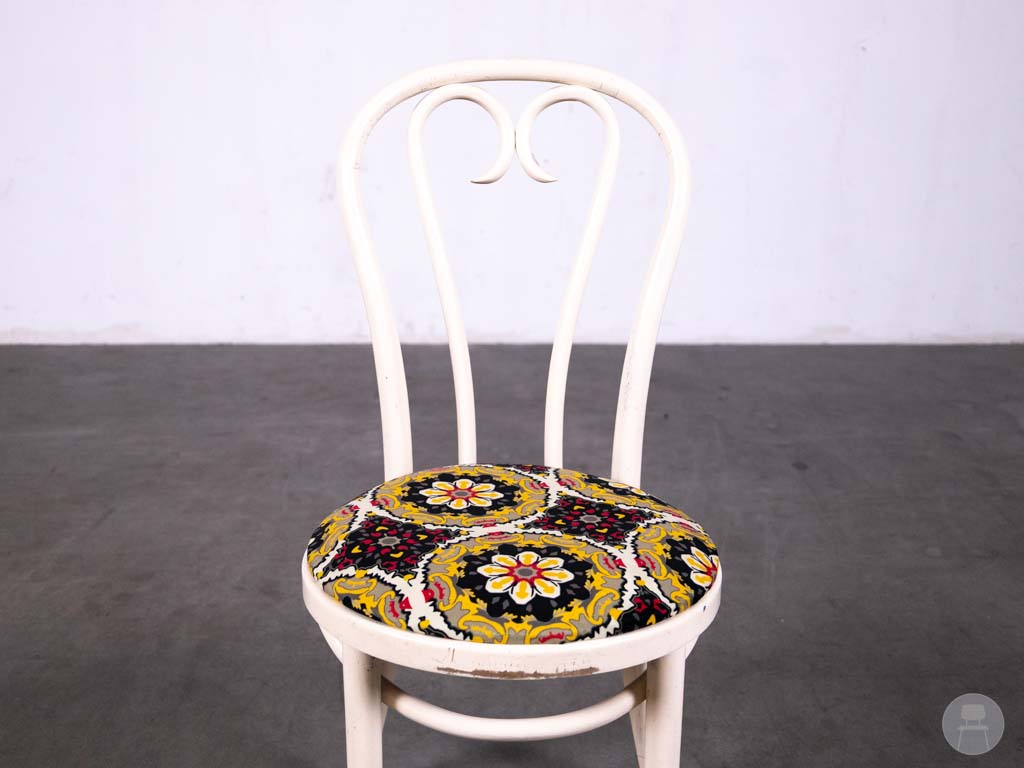 De ronde zitting is door ons volledig opnieuw gestoffeerd, waardoor de stoel een frisse, unieke update heeft gekregen. De kleurrijke stof met een uitgesproken vintagepatroon in onder andere geel, rood, wit en zwart zorgt voor een levendig accent in het interieur en maakt elke stoel net even anders. Hierdoor komt de Thonet Vintage prachtig tot zijn recht in zowel klassieke bruine cafés als trendy bistro’s of koffieconcepten met een knipoog naar retro. Een perfecte keuze voor ondernemers die gasten willen verrassen met een comfortabele zitplek vol stijl en historie.