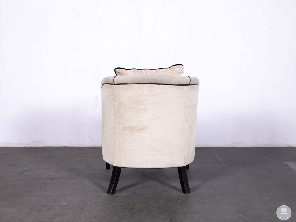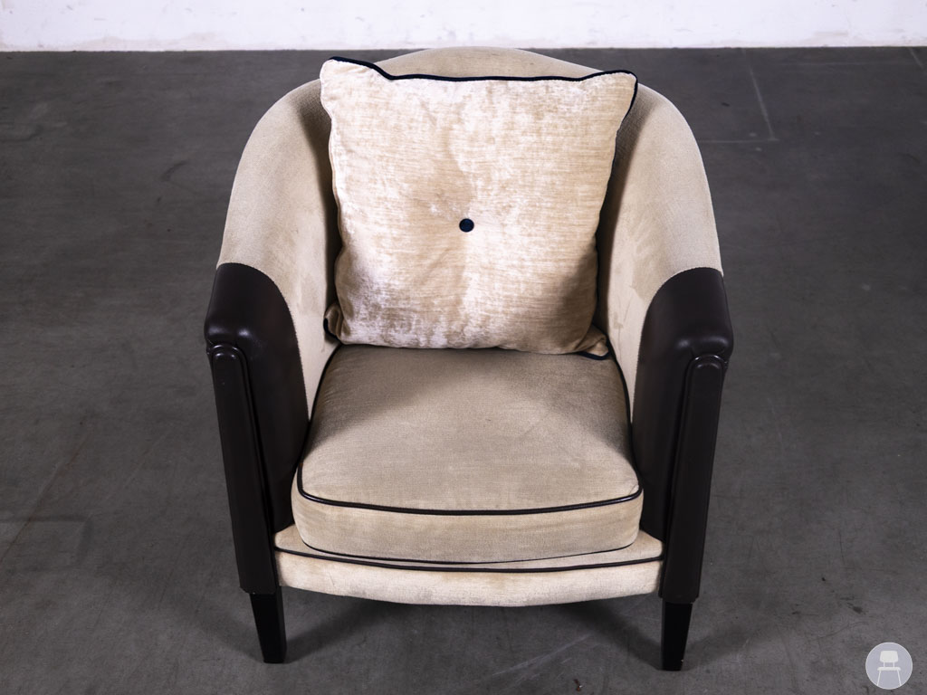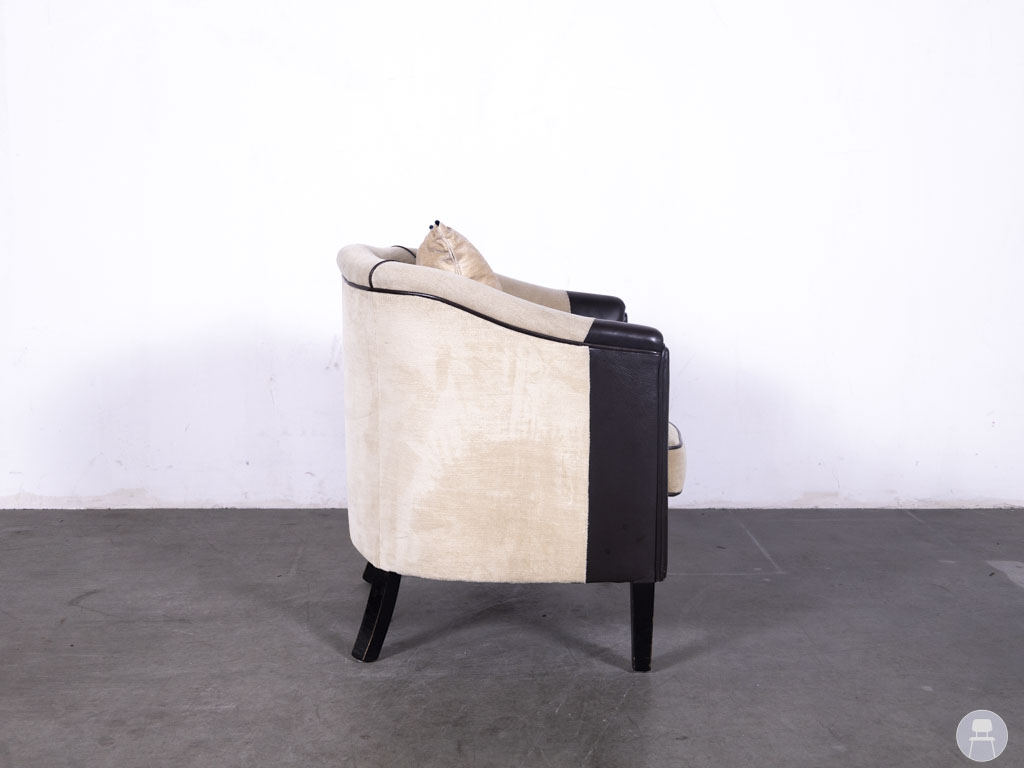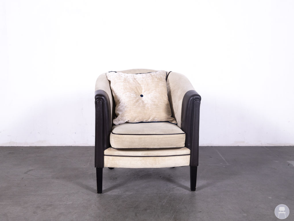 De zitting is voorzien van een los, dik gevuld kussen dat zorgt voor extra zitcomfort. Het kussen heeft zwarte accenten. Dankzij de afgeronde rugleuning en brede armsteunen biedt de fauteuil een ontspannen zitervaring. Het model is stevig en solide opgebouwd, geschikt voor intensief gebruik. Een ideale keuze voor wie op zoek is naar tweedehands horecameubilair met uitstraling, comfort en een tijdloos design.