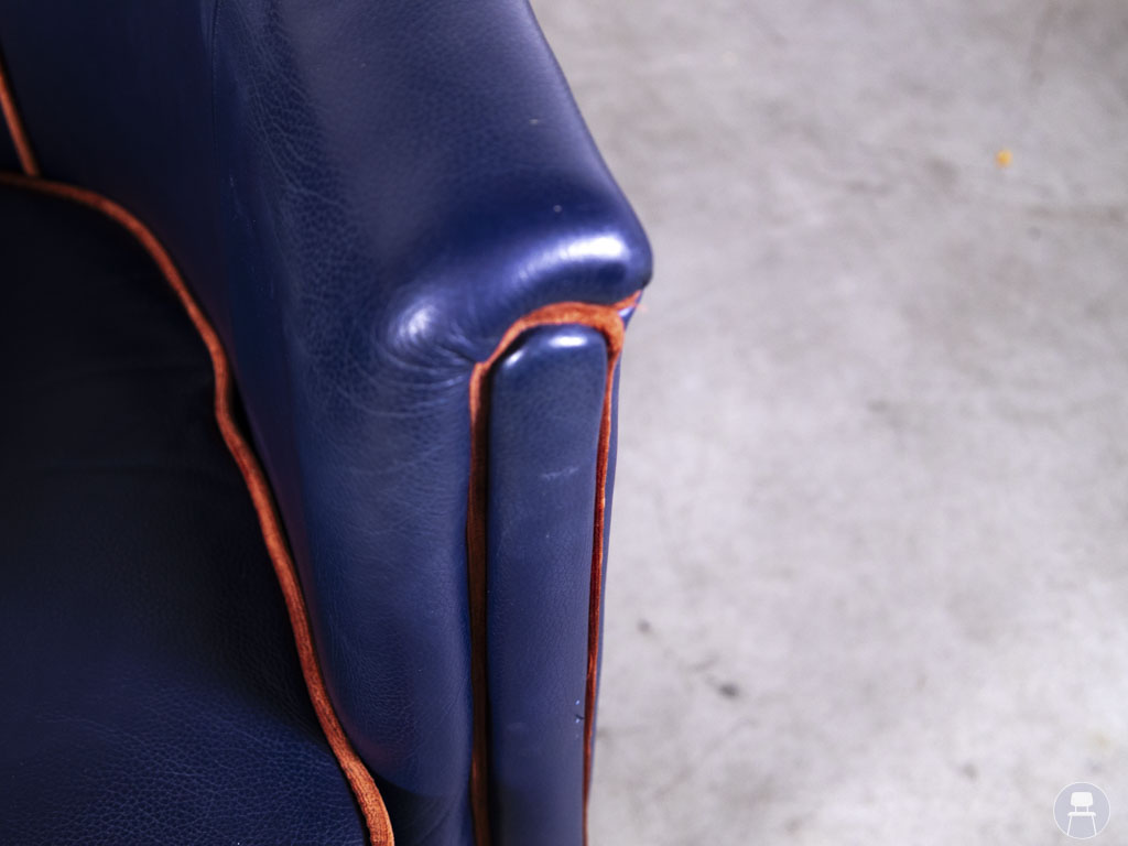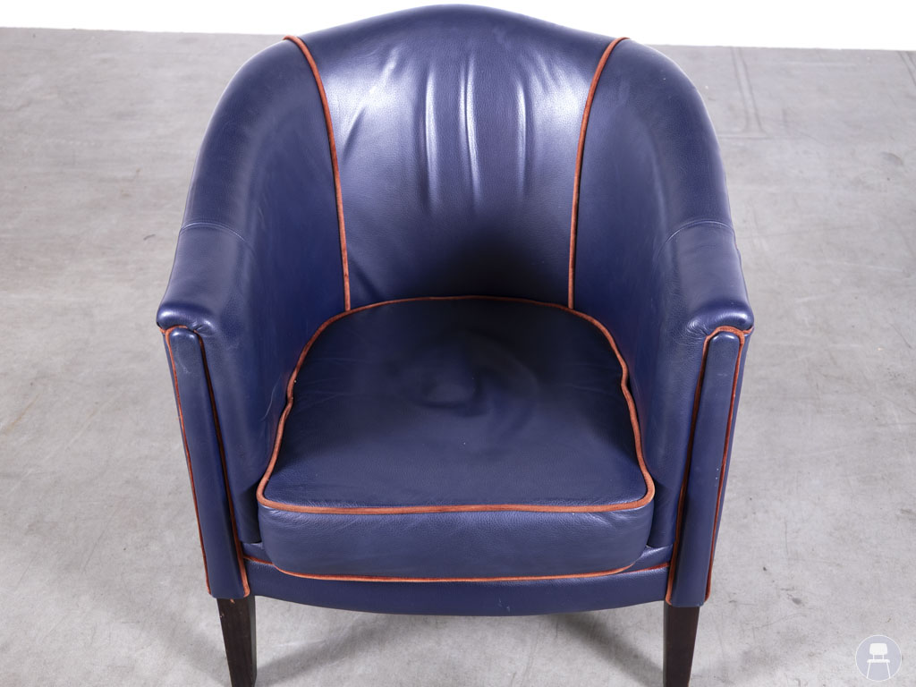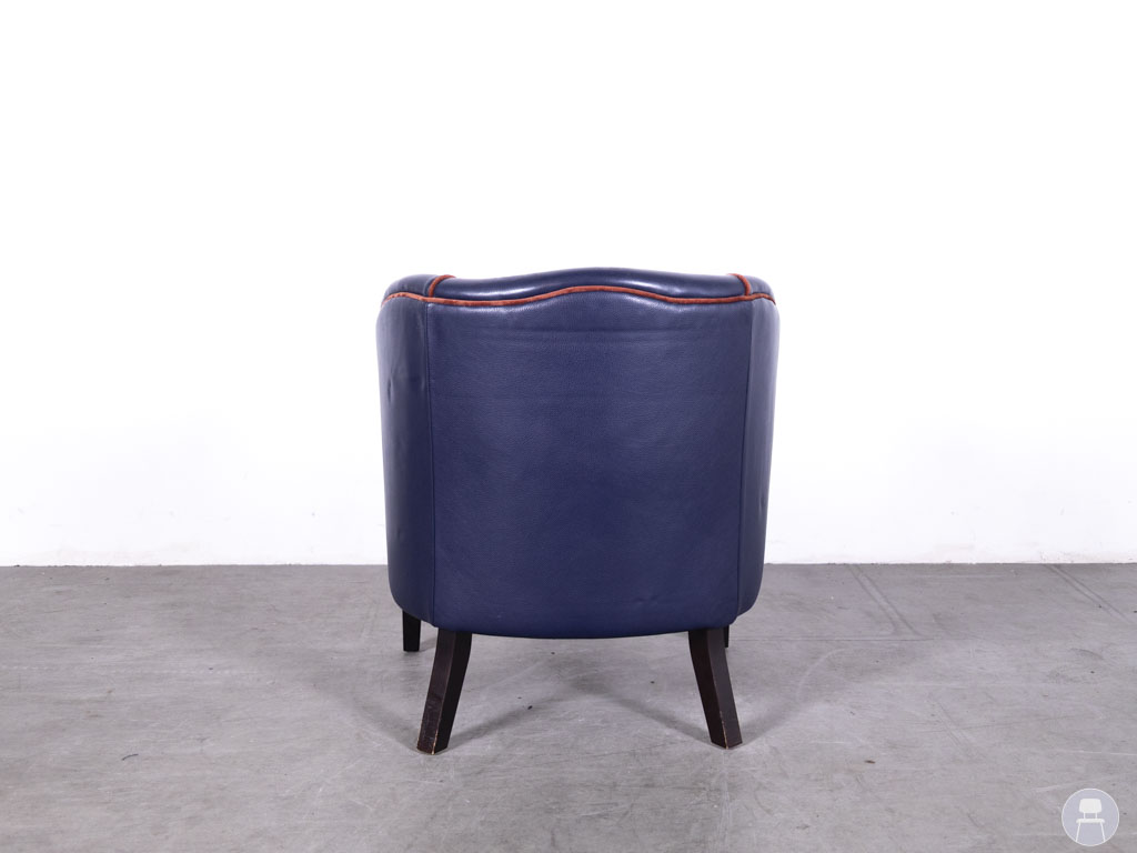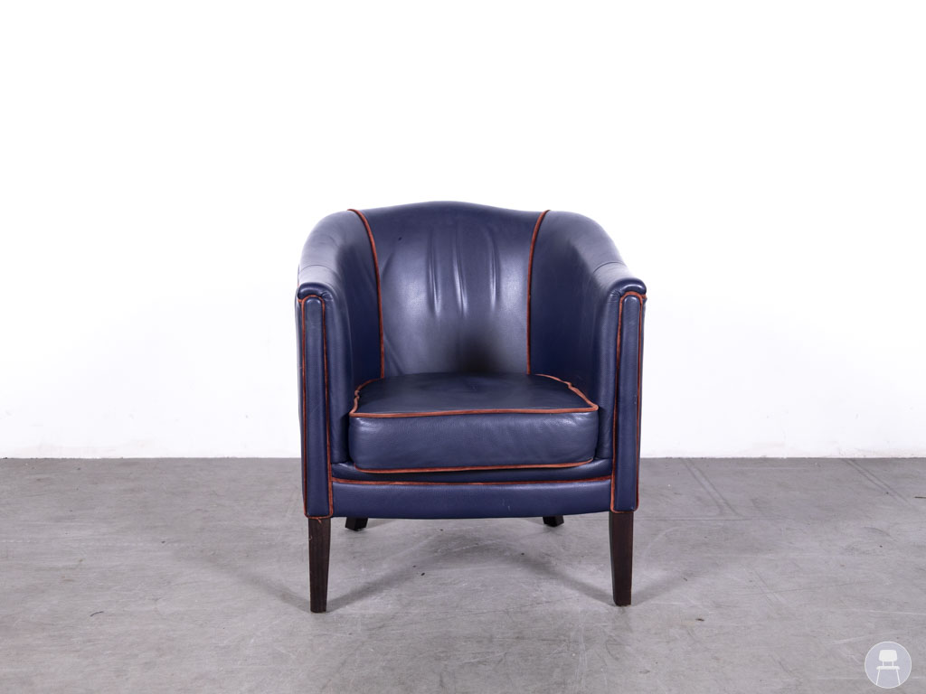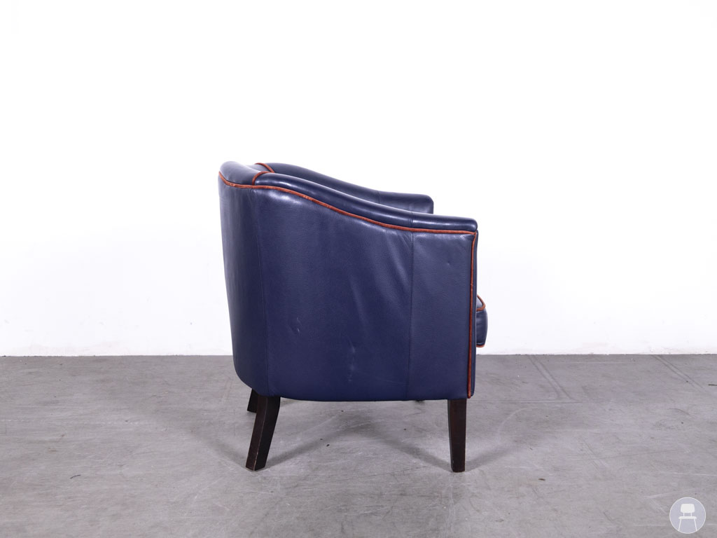 Horecafauteuil Olga blauw is een stijlvolle en comfortabele keuze voor iedere horecagelegenheid. De diepe blauwe bekleding in kunstleer geeft de fauteuil een luxe en moderne uitstraling, terwijl de contrasterende siernaden in oranje zorgen voor een speels detail. Dankzij de ronde kuipvorm en het losse zitkussen biedt de horecafauteuil uitstekend zitcomfort. Ideaal voor lounges, hotellobby’s of wachtruimtes. Het stevige houten frame en de donkere poten maken deze tweedehands fauteuil geschikt voor intensief gebruik.
