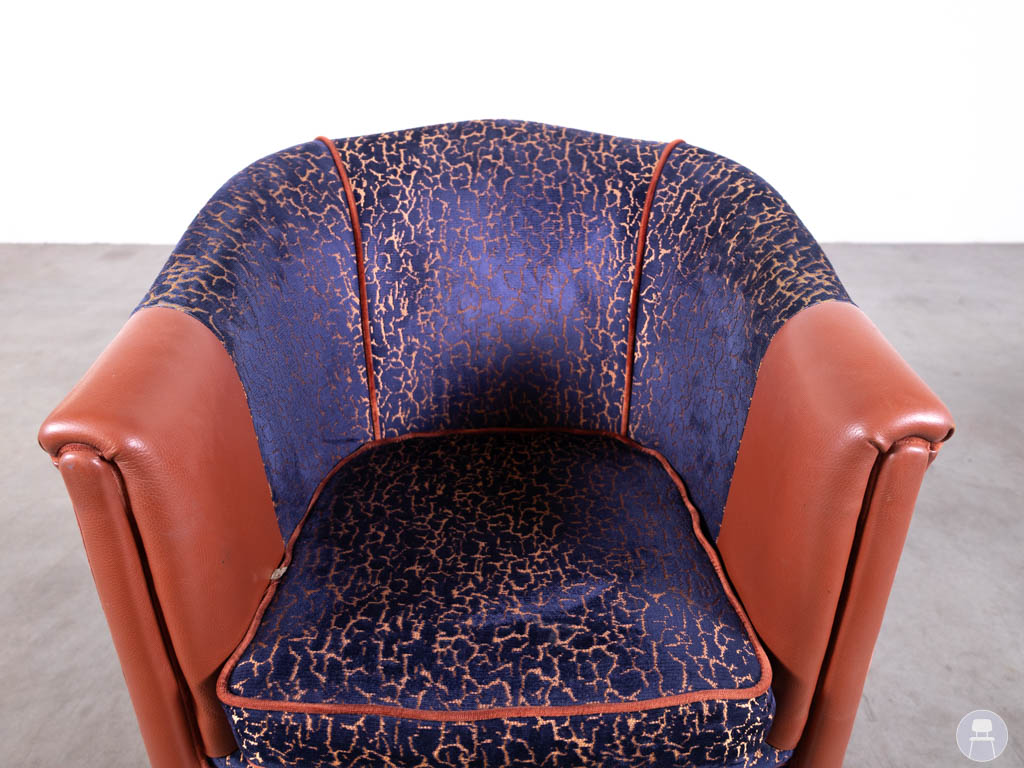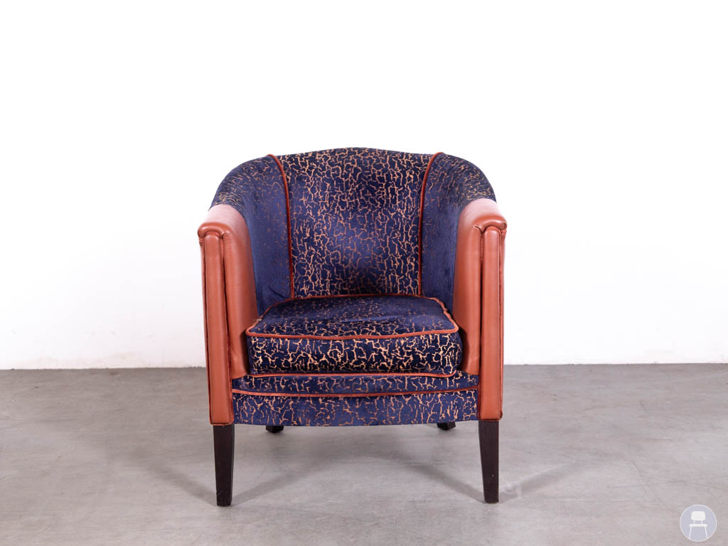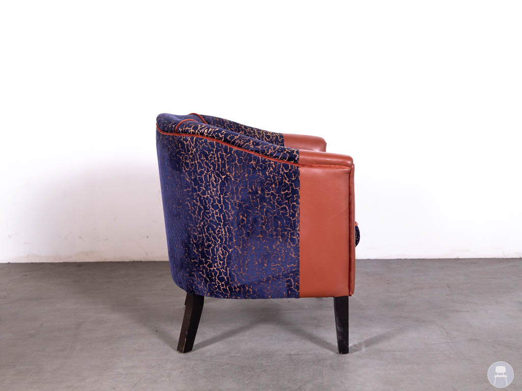 Deze horecafauteuil is uitgevoerd in een combinatie van blauwe stof met print en rood kunstleer, wat zorgt voor een speels en luxe contrast. De afgeronde vormen en zachte bekleding bieden optimaal zitcomfort, ideaal voor lounges, cafés en restaurants.