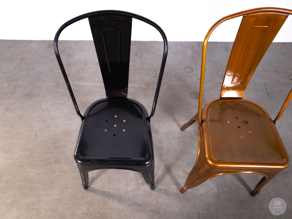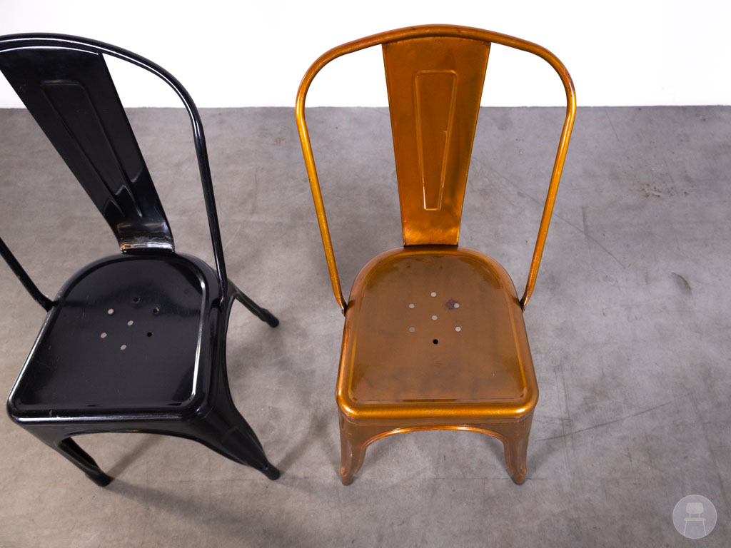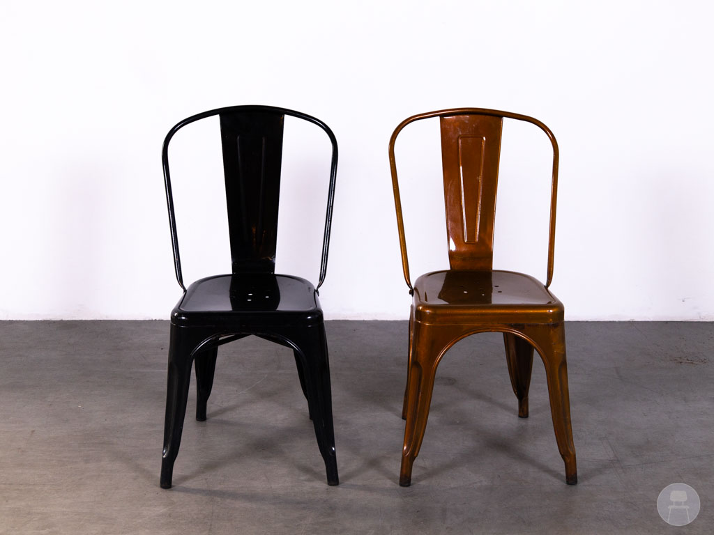 1 set 2 stuks Horecastoel Tolix mix is een robuuste en industriële horecaset, perfect voor cafés, restaurants en terrassen met een stoer interieur. Deze set bestaat uit twee metalen Tolix stoelen in een mix van zwart en koperkleur, wat zorgt voor een speels en trendy effect.