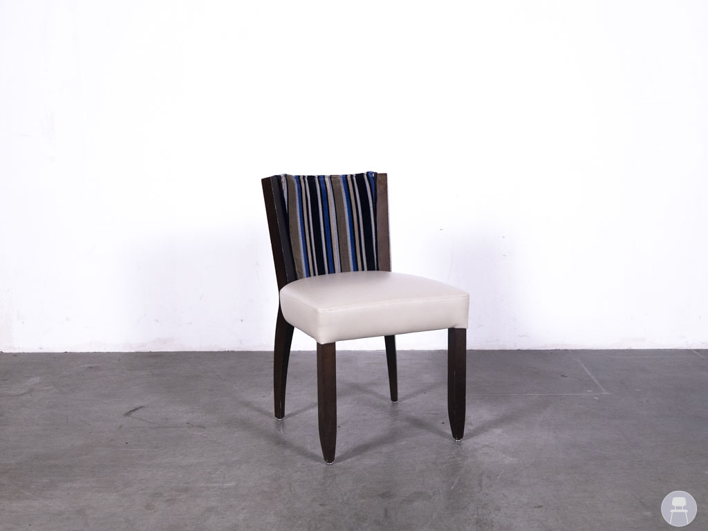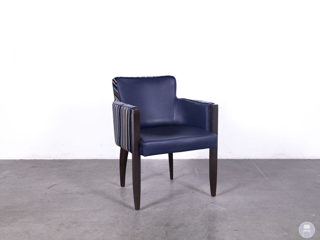 De achterzijde is bekleed met een verticaal gestreepte stof in blauw en goudtinten, wat zorgt voor een verrassend en stijlvol contrast. Dankzij de vloeiende lijnen en stevige constructie biedt deze horecastoel zowel visuele klasse als functioneel comfort. De Alexia stripe blauw is een uitstekende keuze voor wie zoekt naar tweedehands horecameubilair met een klassieke en luxueuze afwerking, en is ideaal om karakter toe te voegen aan elk interieur.