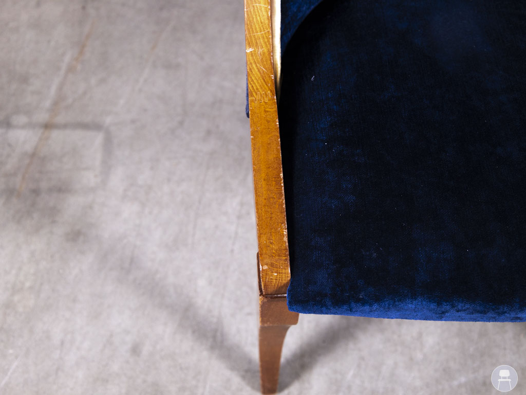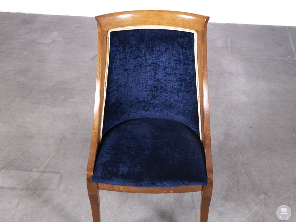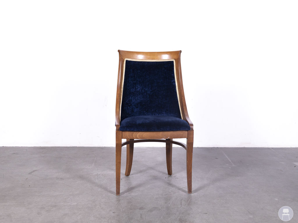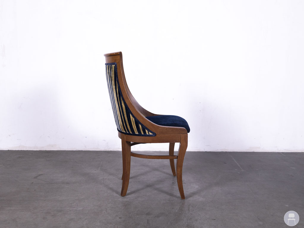 De achterzijde is bekleed met een verticaal gestreepte stof in blauw en goudtinten, wat zorgt voor een verrassend en stijlvol contrast. Dankzij de vloeiende lijnen en stevige constructie biedt deze horecastoel zowel visuele klasse als functioneel comfort. De Alexia stripe blauw is een uitstekende keuze voor wie zoekt naar tweedehands horecameubilair met een klassieke en luxueuze afwerking, en is ideaal om karakter toe te voegen aan elk interieur.