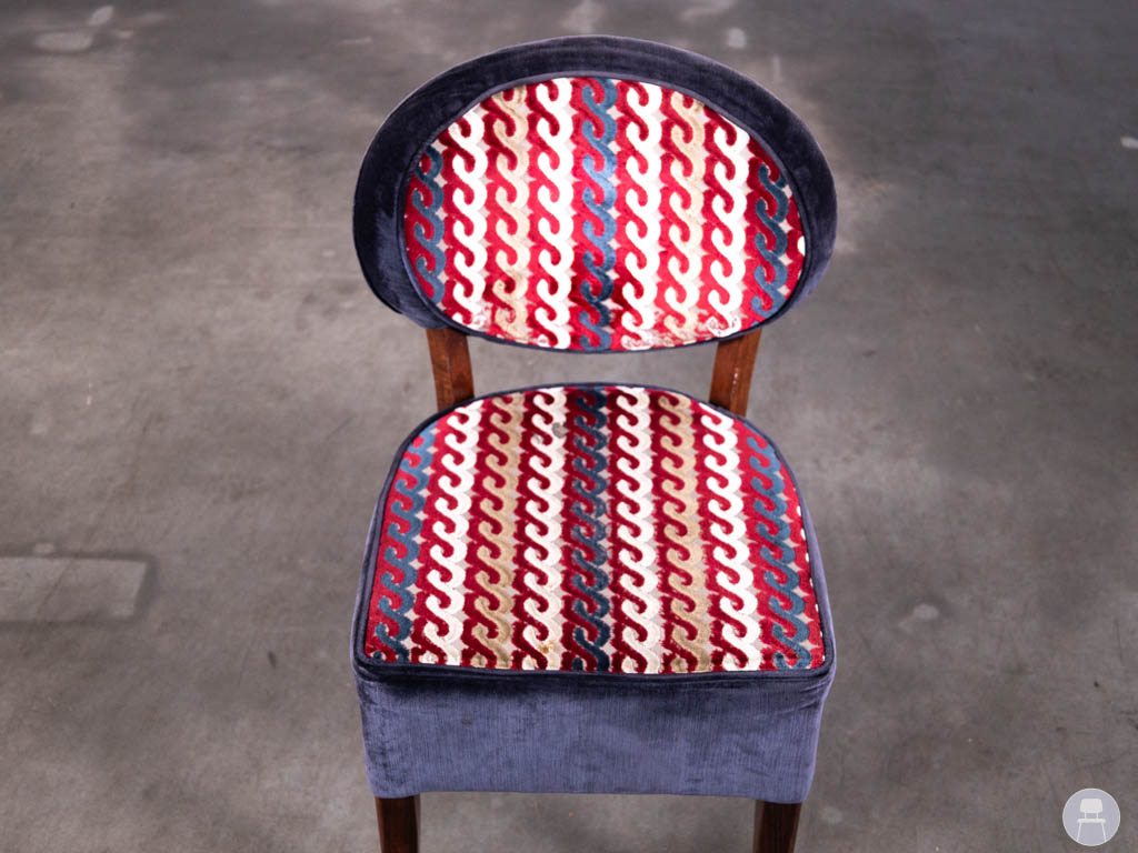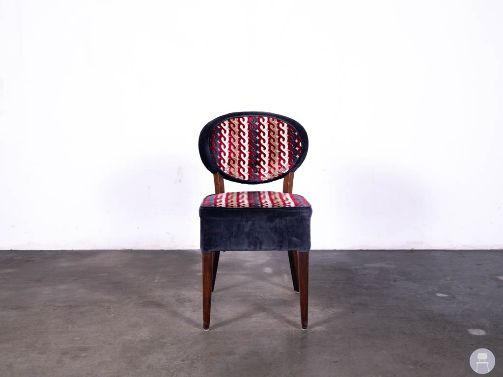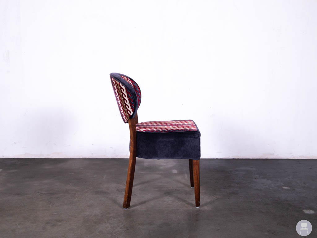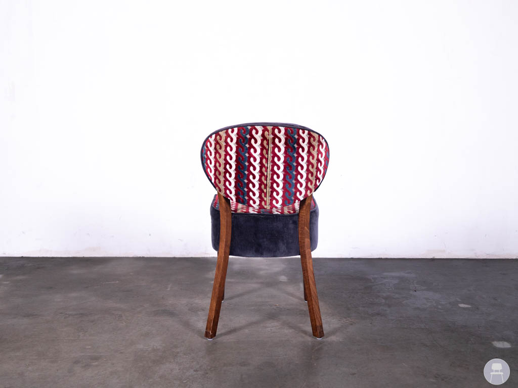 De horecastoel is bekleed met blauw velvet aan de buitenzijde en zijkanten, wat zorgt voor een zachte en chique uitstraling. De binnenzijde van de rugleuning en de zitting zijn uitgevoerd in een speels wave-patroon in blauw en rood, wat de stoel een uniek en karaktervol design geeft. Deze combinatie maakt de stoel perfect voor restaurants, boutique hotels of horecazaken met een uitgesproken interieurconcept.
