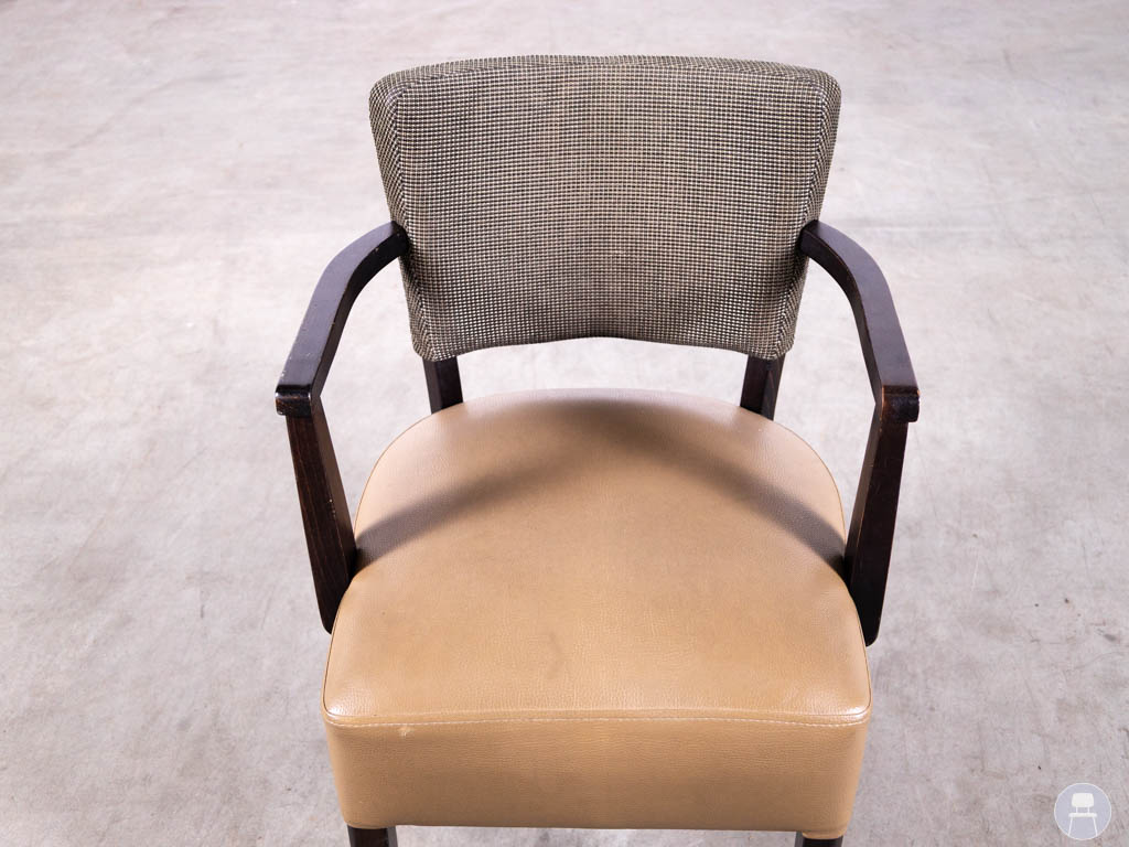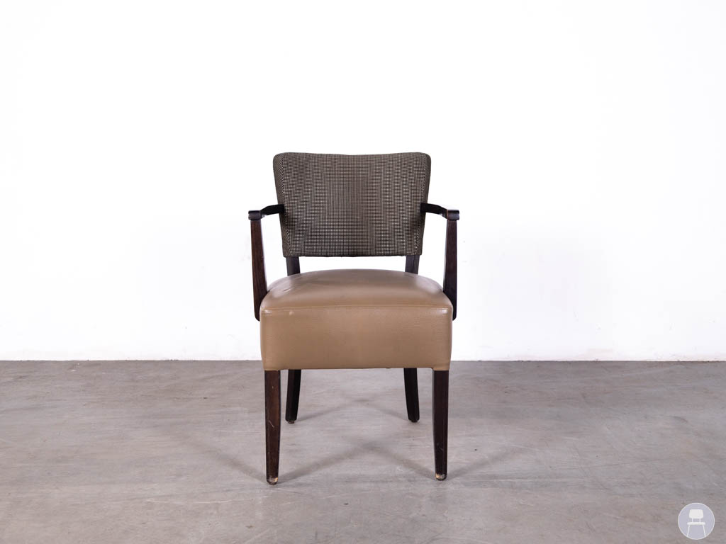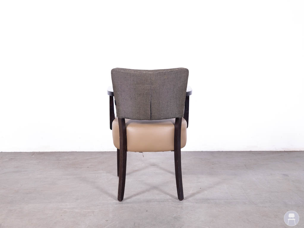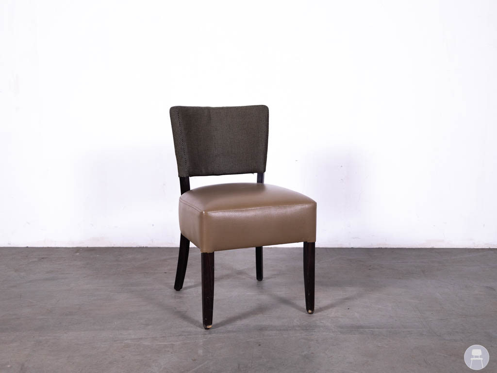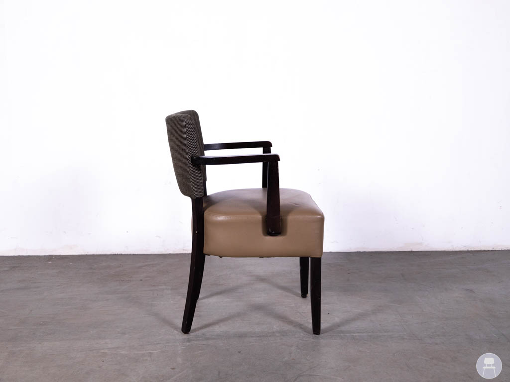 Deze horecastoel van Homint is uitgevoerd met een kunstleren zitting in taupe kleur en een gestoffeerde rugleuning in bijpassende taupe stof. Het stevige houten frame in donkerbruin met armleuningen zorgt voor extra comfort en een luxe uitstraling.