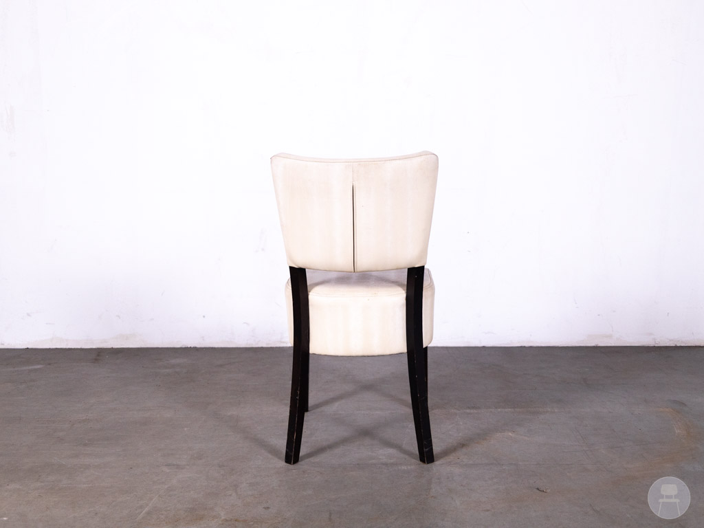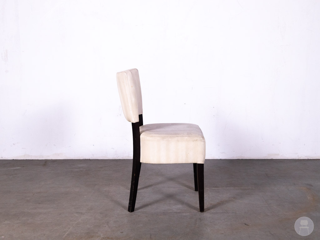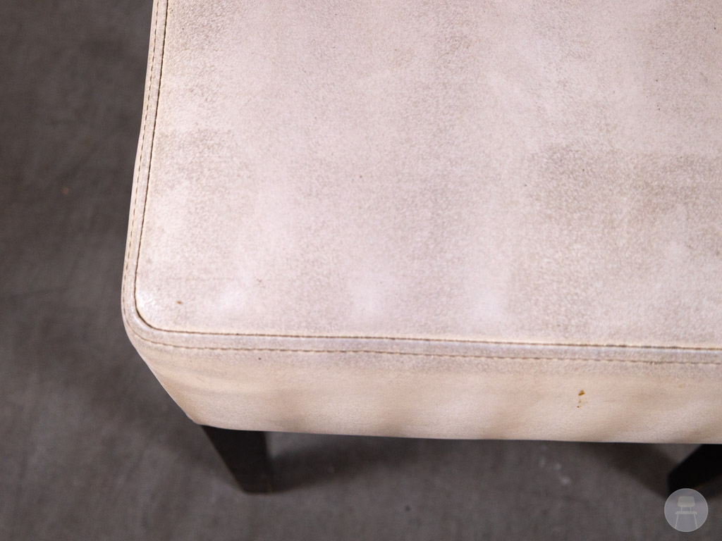 Deze stoel heeft zichtbare gebruikssporen in de vorm van vlekkerige stof, wat hem een tweedehands karakter geeft en aantrekkelijk maakt voor ondernemers die op zoek zijn naar een voordelige oplossing zonder in te leveren op stijl en comfort.