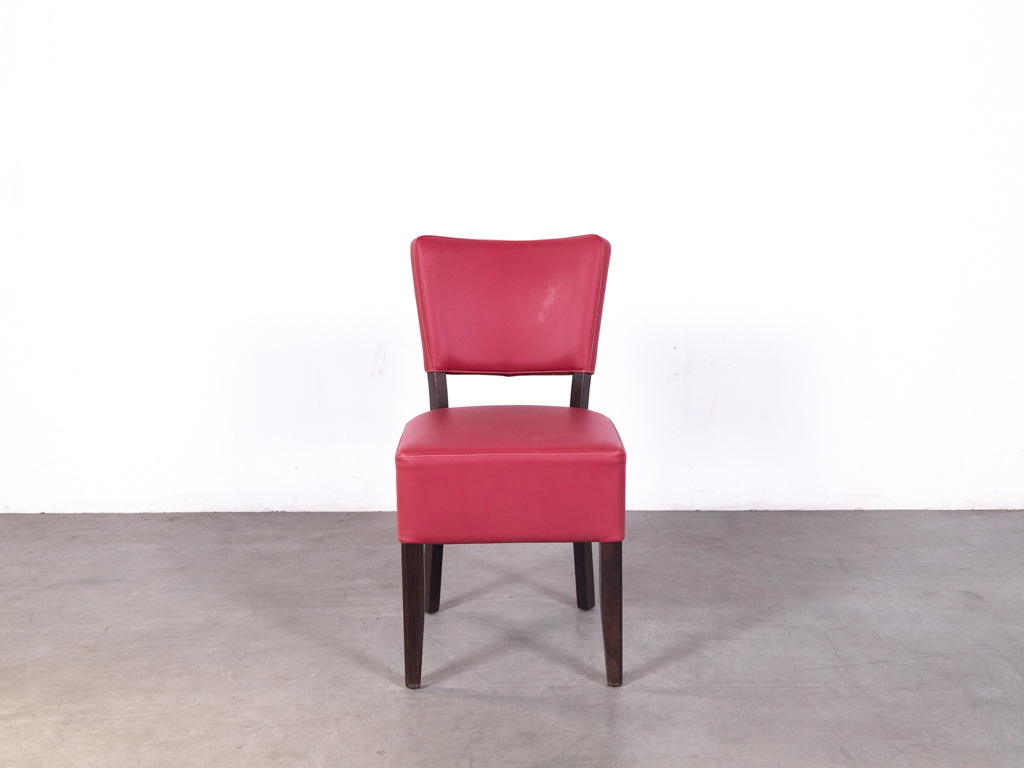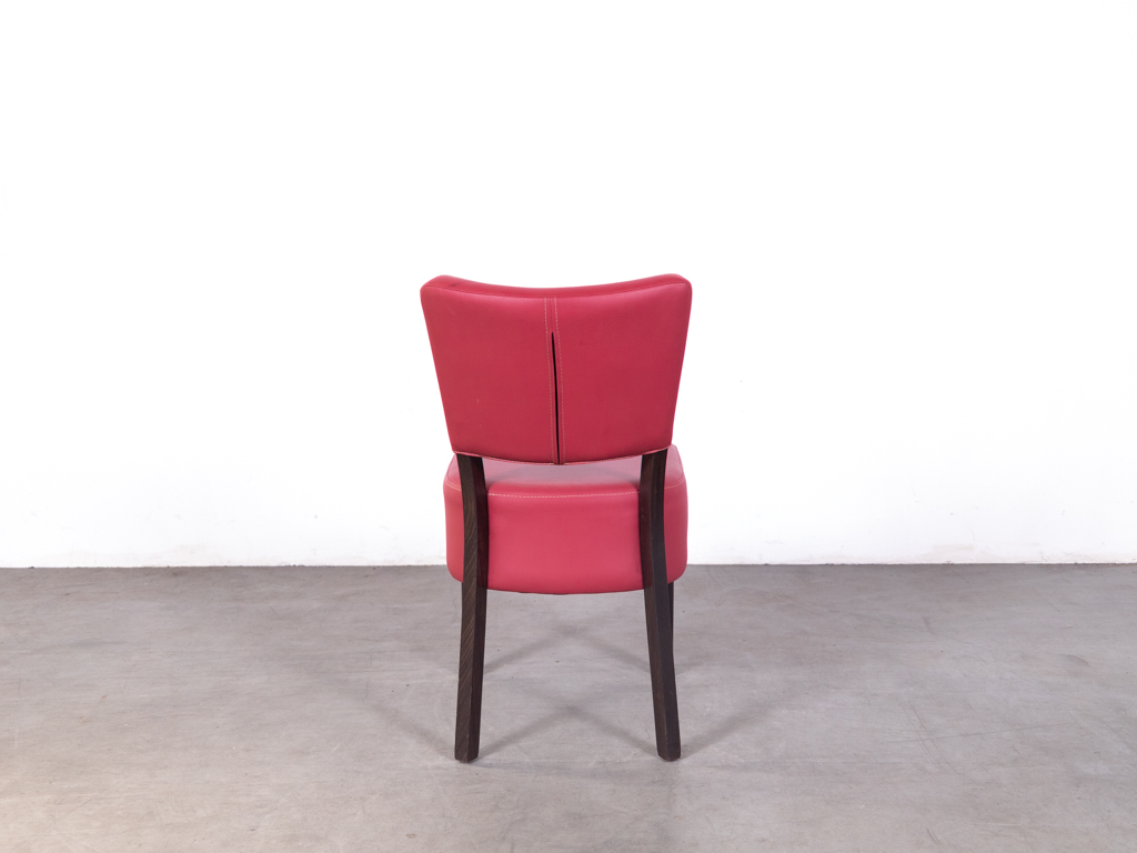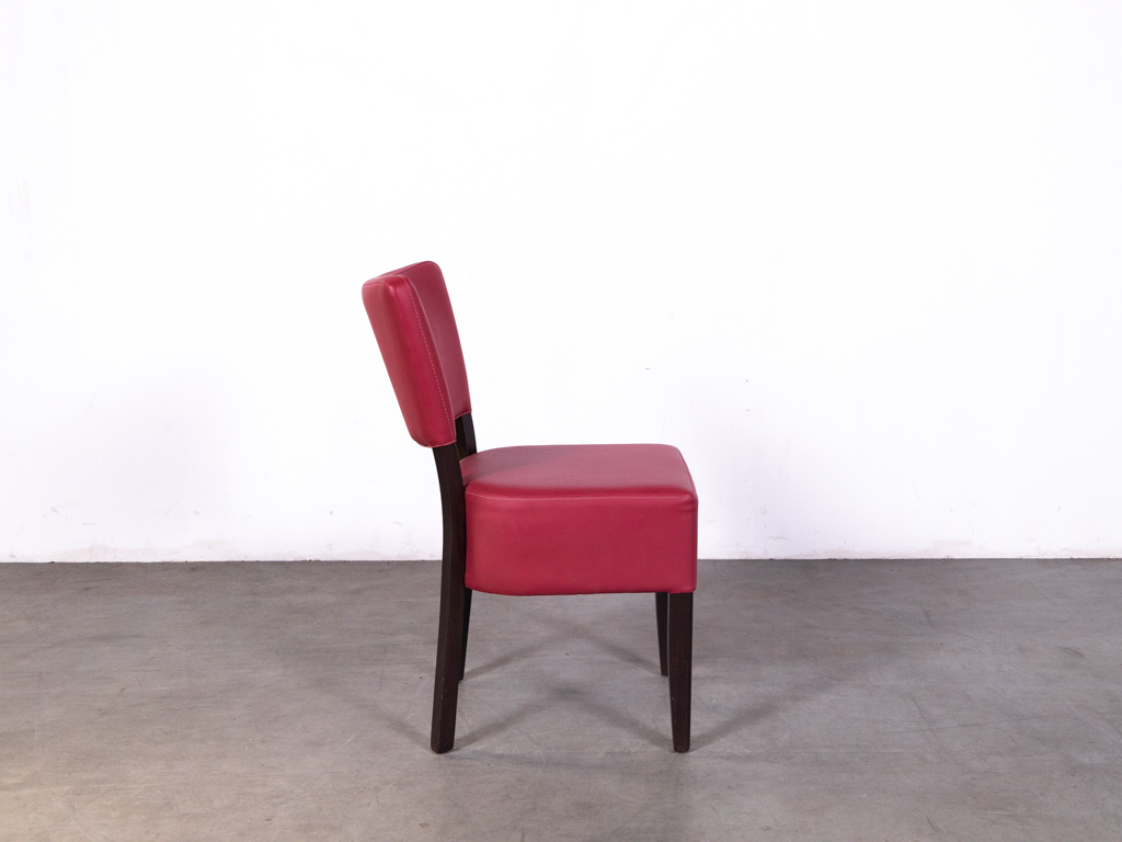 De zitting en rugleuning zijn bekleed met rood skai met een licht roze gloed, wat zorgt voor een warme en opvallende uitstraling. Daarnaast is het materiaal onderhoudsvriendelijk en eenvoudig schoon te maken. Het stevige frame van hout in donkerbruine kleur zorgt voor stabiliteit en een klassieke look.