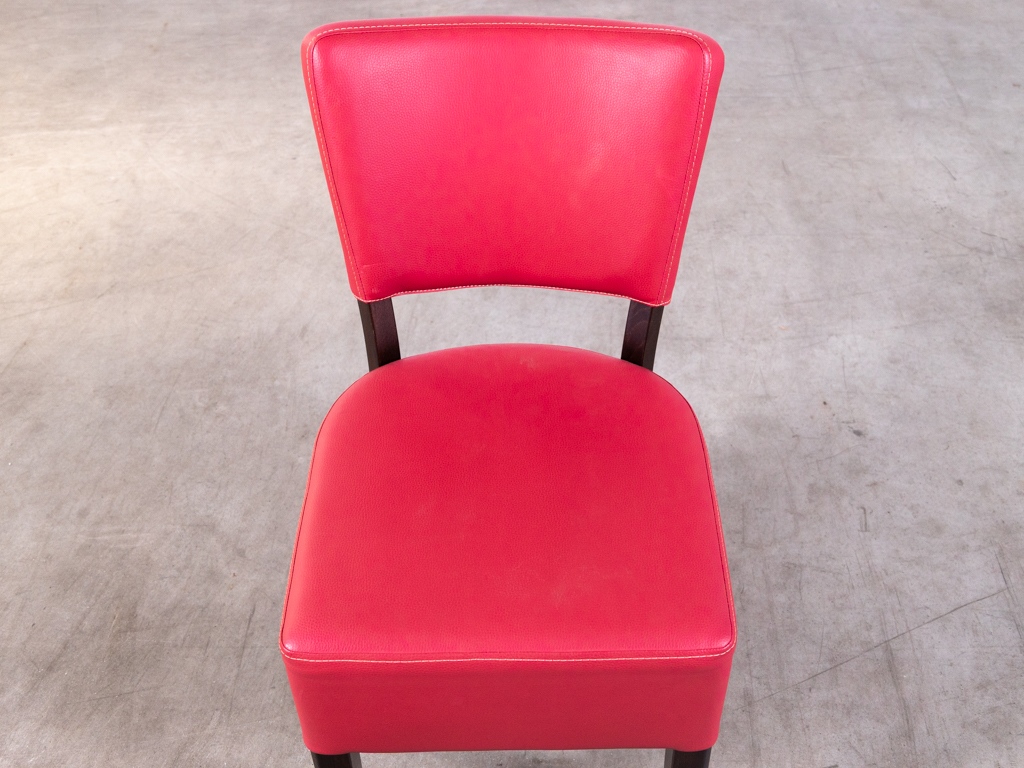 Horecastoel Lisa rood/roze is een compacte en comfortabele horecastoel, uitgevoerd in skai en hout in een diepe rode kleur met een subtiele roze tint en een donkerbruin houten frame. Deze horecastoel heeft een tijdloos en praktisch design, waardoor hij perfect inzetbaar is binnen restaurants, cafés en eetcafés.