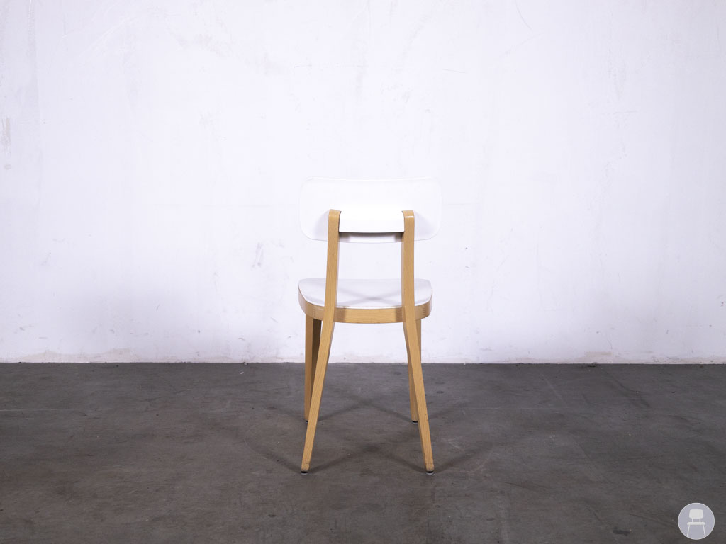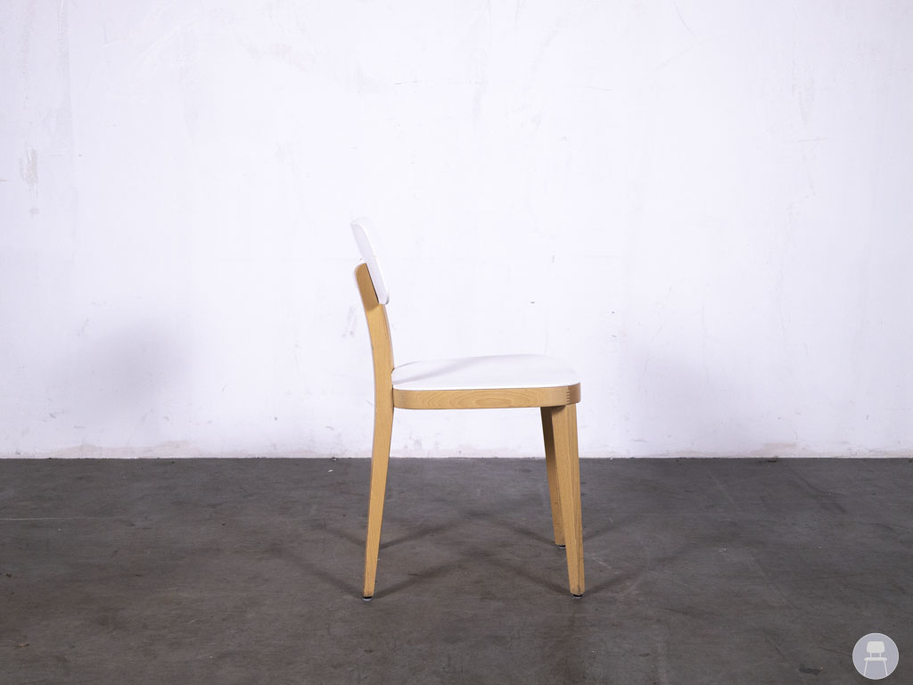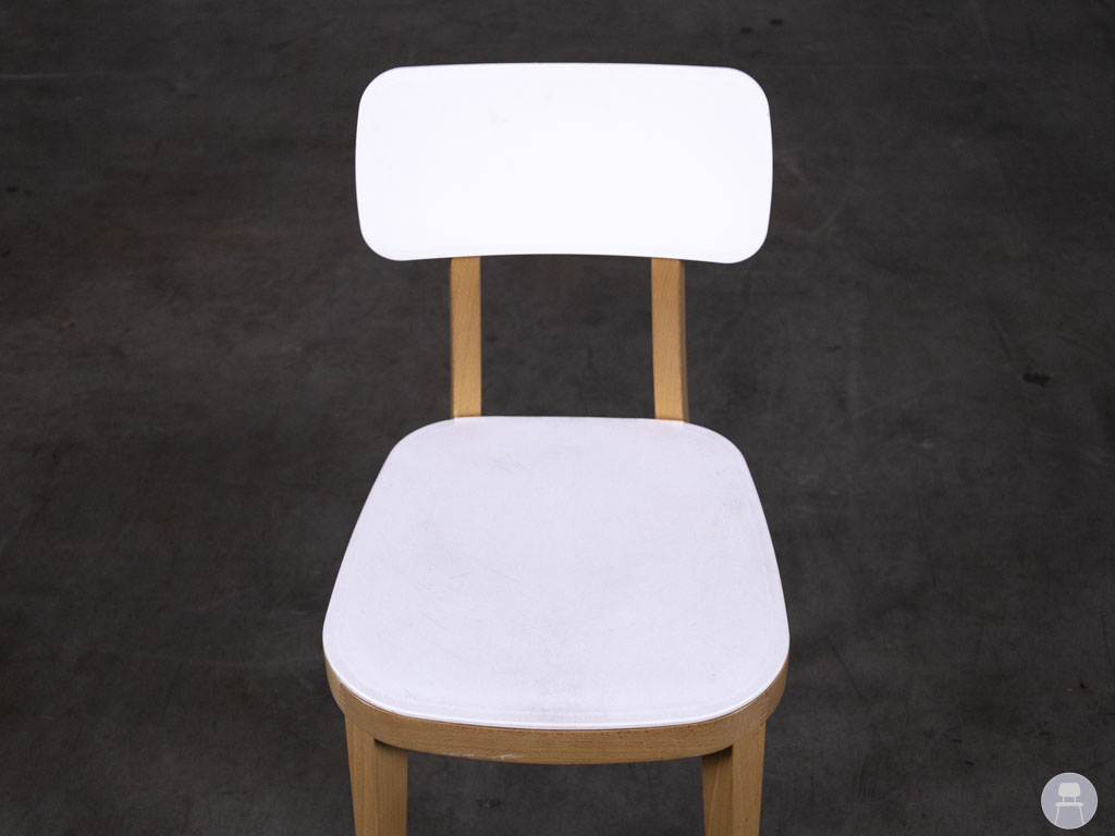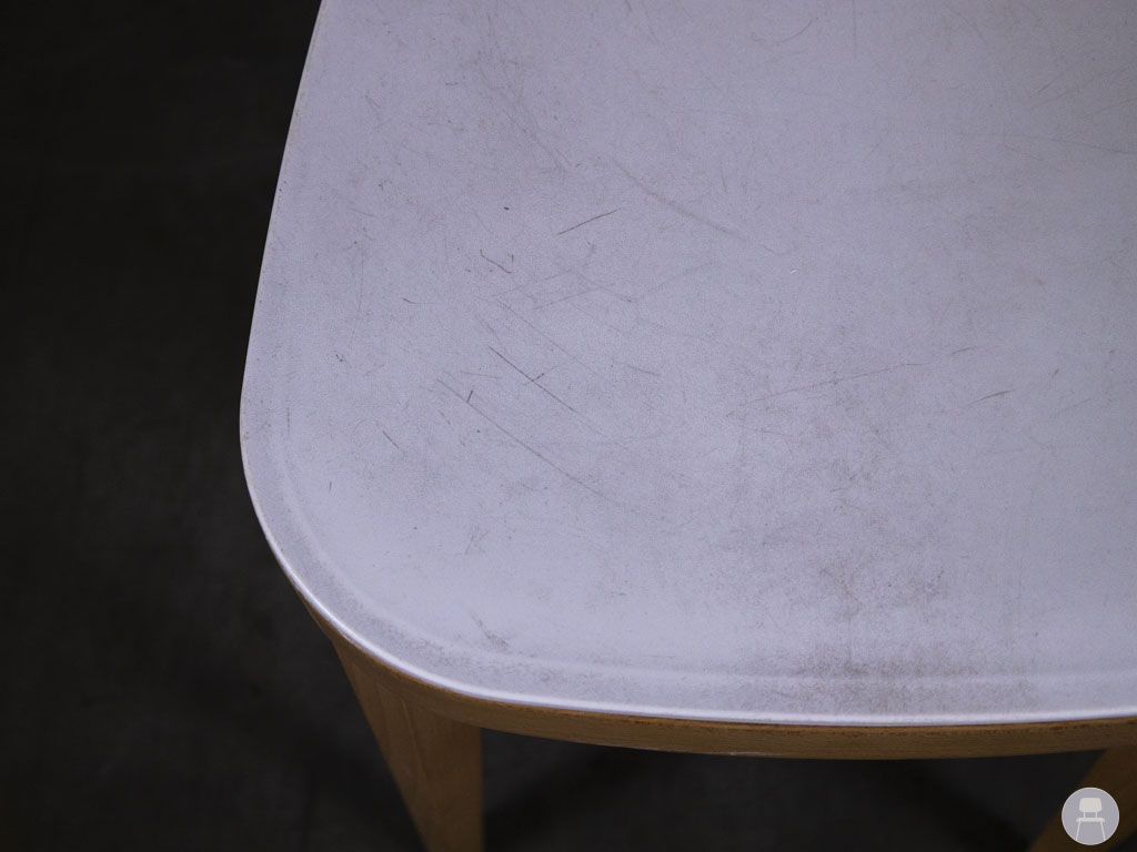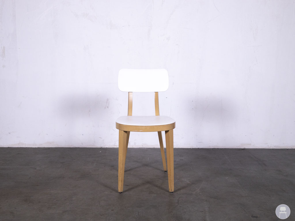 De zitting en rugleuning zijn afgewerkt met een witte coating, die samen met het blankhouten onderstel een natuurlijke look geeft. Let op: de horecastoel vertoont gebruikssporen en krassen op de zitting, passend bij tweedehands horeca meubilair. Dit doet echter niets af aan de stevigheid en functionaliteit.