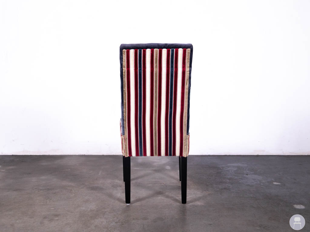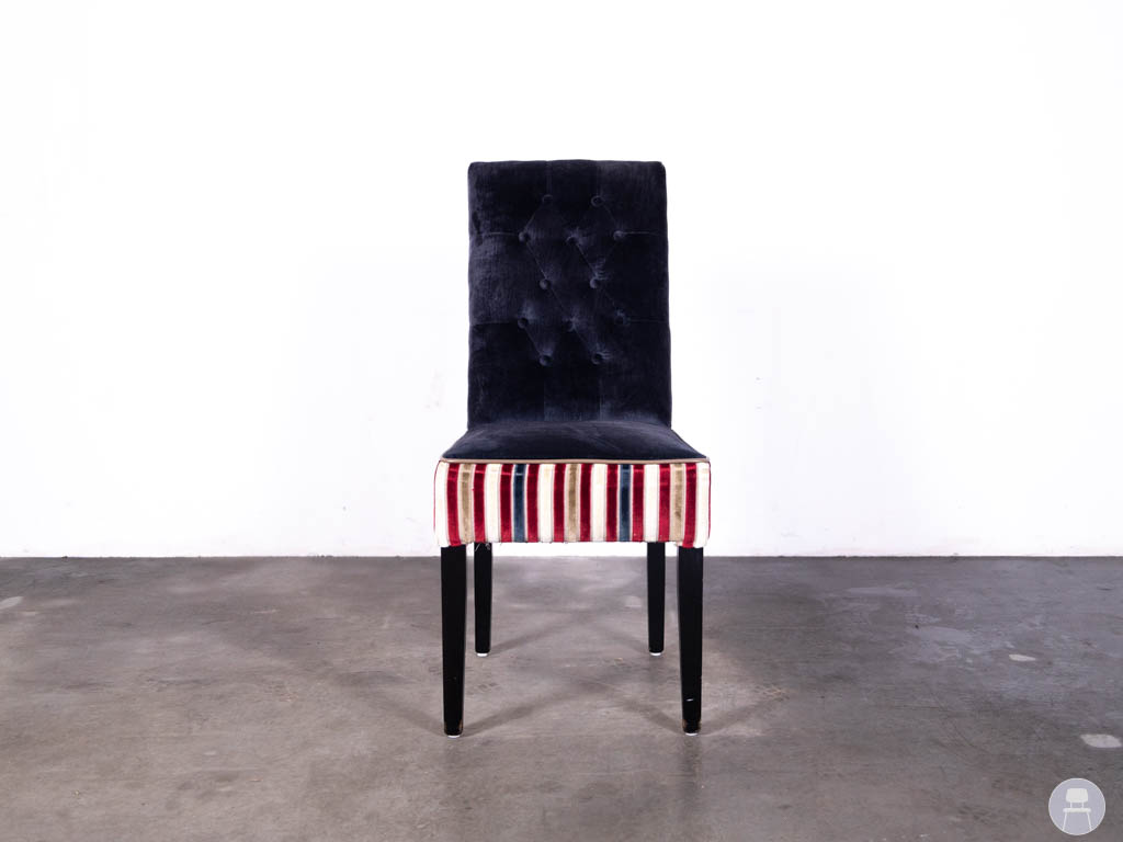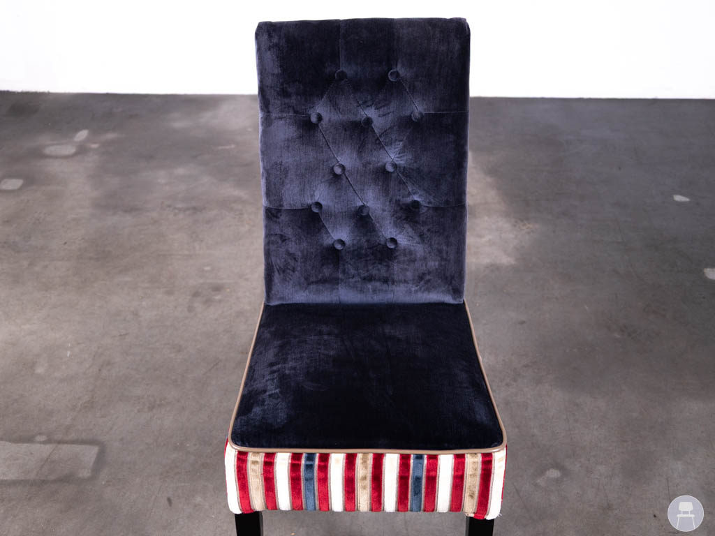 De voorzijde van de stoel is bekleed met donkerblauw velvet, inclusief een stijlvol gecapitonneerde rugleuning die zorgt voor een chique en klassieke uitstraling. De zitting en achterzijde zijn uitgevoerd in een rood/blauw gestreepte stof, wat de stoel een uniek en karaktervol accent geeft. Juist deze combinatie maakt de stoel bijzonder geschikt voor interieurs waar beleving en detail belangrijk zijn.