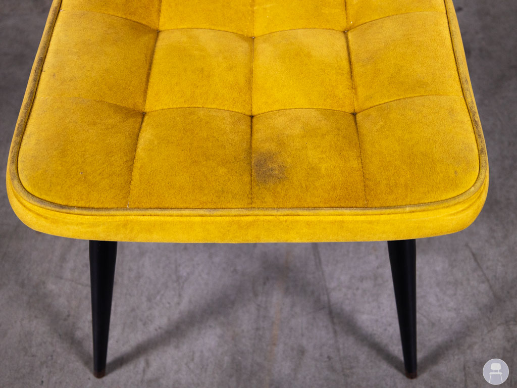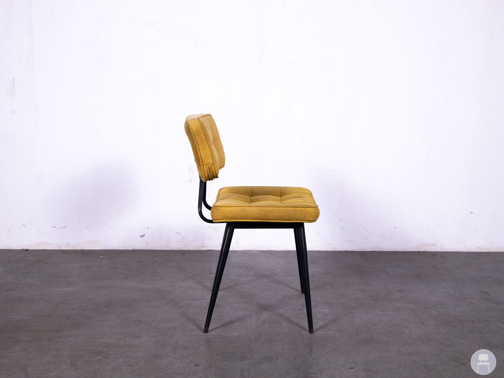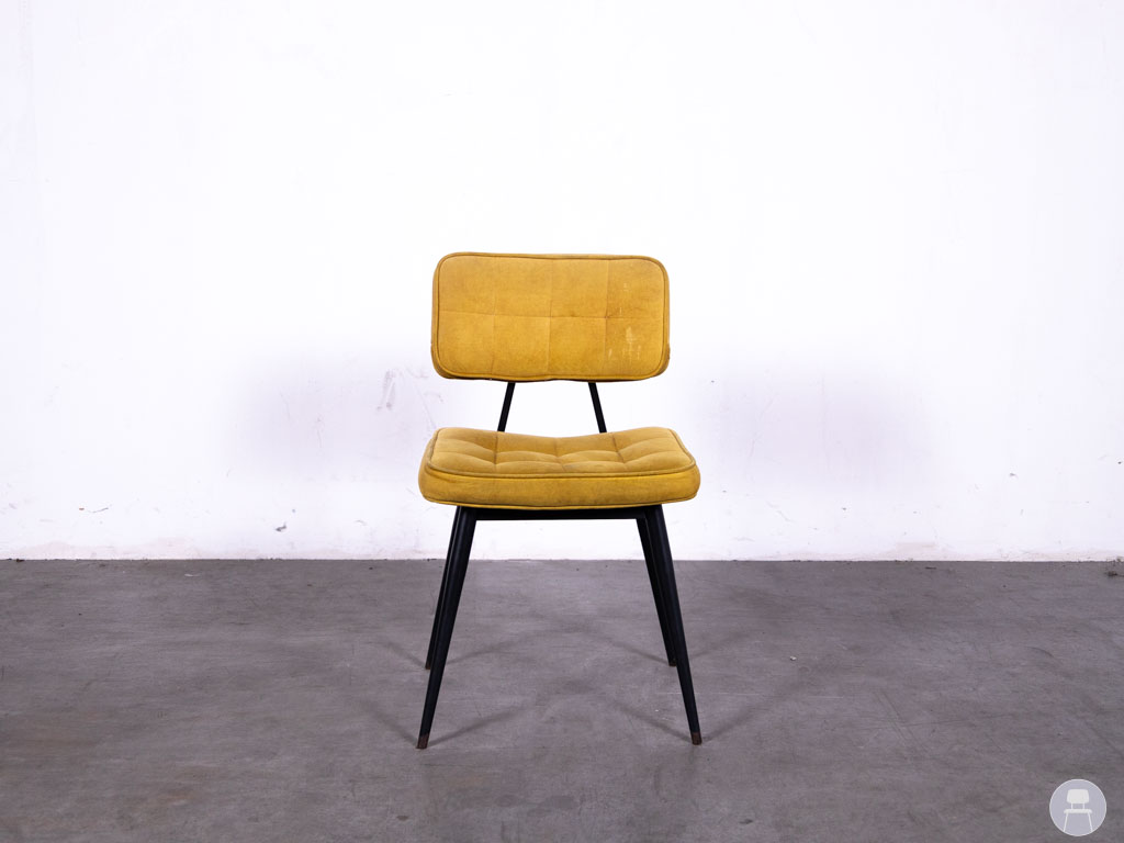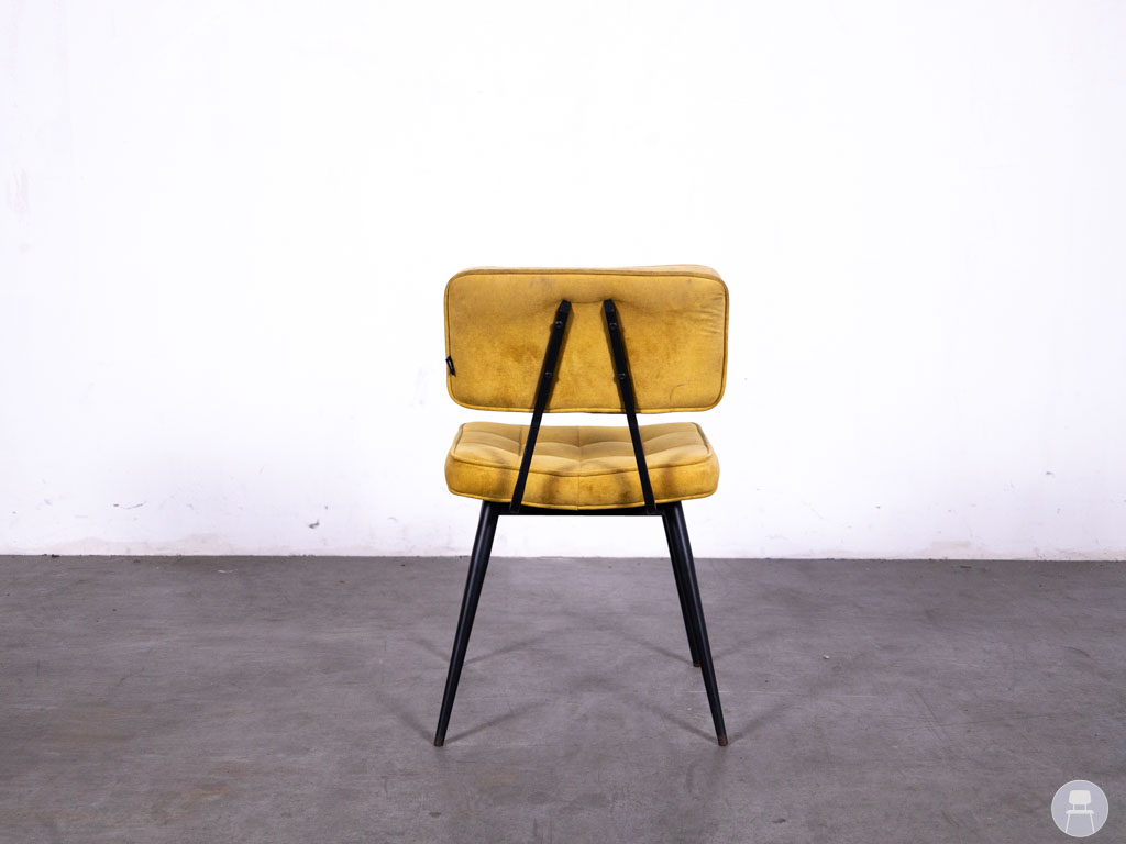 De comfortabele zitting en rugleuning zijn licht gecapitonneerd voor extra zitcomfort en visuele charme. Het zwarte metalen onderstel zorgt voor een mooi contrast én een stevige basis. Ideaal voor restaurants, cafés of lunchzaken die een kleurrijke, vintage touch willen toevoegen aan hun interieur. Let op: de stoel heeft gebruikssporen op de stof.