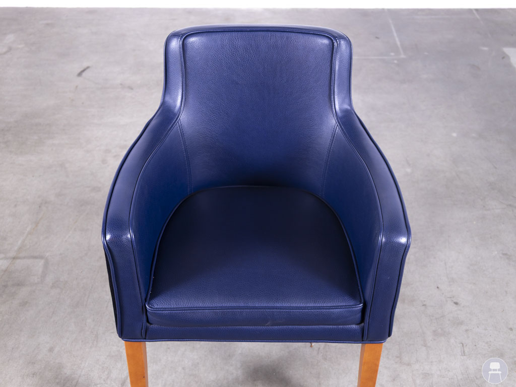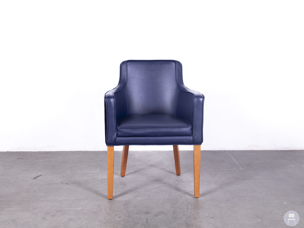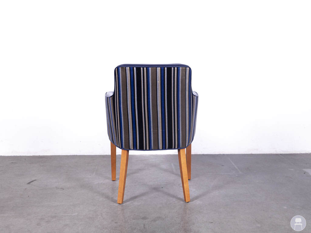De zitting en rug zijn stevig gevoerd voor optimaal comfort, terwijl de geïntegreerde armleuningen zorgen voor extra ondersteuning. De horecastoel staat op een stabiel onderstel van licht hout, wat mooi contrasteert met de donkere bekleding en zorgt voor een warme, toegankelijke look. Dankzij de duurzame materialen en hoogwaardige afwerking is dit een ideale keuze voor wie op zoek is naar comfortabel en karaktervol tweedehands horecameubilair.