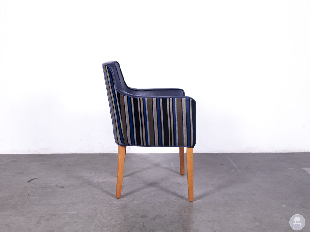 Horecastoel Stripe blauw is uitgevoerd met een stijlvolle blauwe kunstleren bekleding aan de voorzijde en een opvallende gestreepte stoffen rug in blauw, zwart en beige tinten aan de achterzijde. Deze combinatie van materialen en kleuren geeft de stoel een moderne en speelse uitstraling die perfect past in een eigentijds restaurant, hotel of wachtruimte.