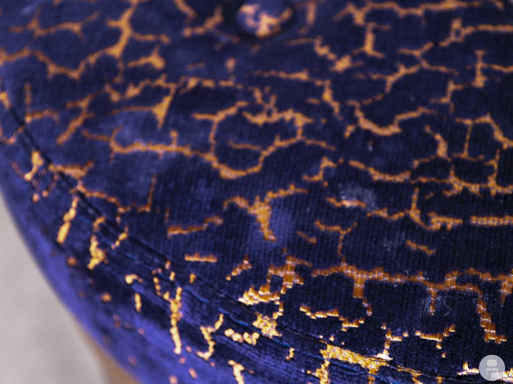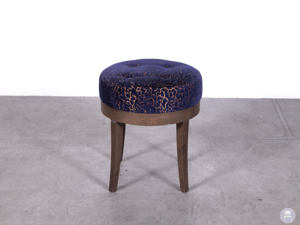 Krukje Amalia velvet blauw Montbel is een charmant en stijlvol zitmeubel met een luxe uitstraling. De ronde zitting is bekleed met diepblauwe/paarse velvet stof met sierlijk goudpatroon, wat zorgt voor een rijke, klassieke look. Het houten frame en de elegante poten geven het krukje van Montbel een stevige en stabiele basis. Er zijn lichte gebruikssporen zichtbaar op de stof, passend bij een tweedehands item met karakter. Perfect als bijzetkrukje in een hotelkamer, lounge of restaurant met een vintage of chique inrichting.