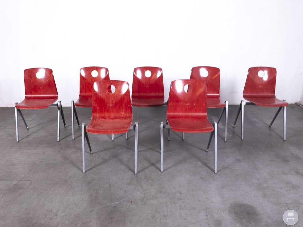 1 set 7 stuks Schoolstoel S19 rood Galvanitas bestaat uit zeven stevige schoolstoelen van het merk Galvanitas, uitgevoerd in een opvallende rode kleur. De stoelen hebben een houten zitvlak en rugleuning met het karakteristieke ronde handgreep-gat in de rug, wat niet alleen functioneel is maar ook direct herkenbaar als klassiek schoolstoeldesign.
