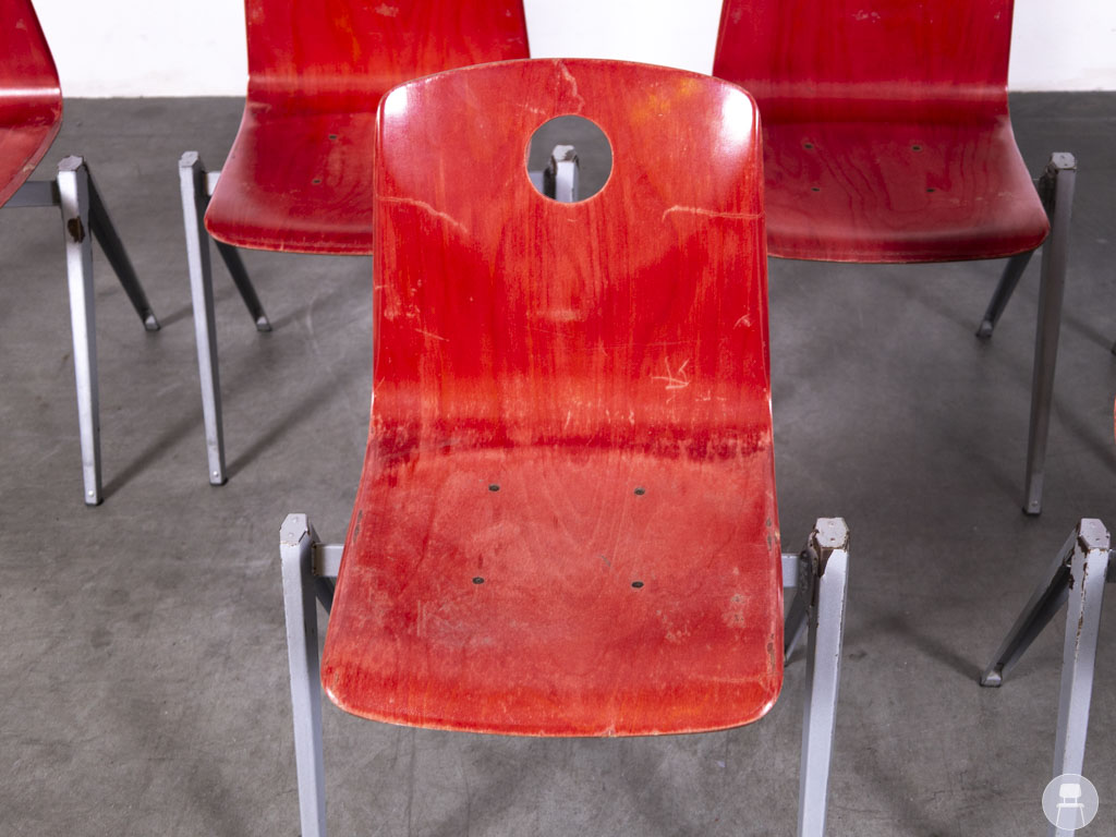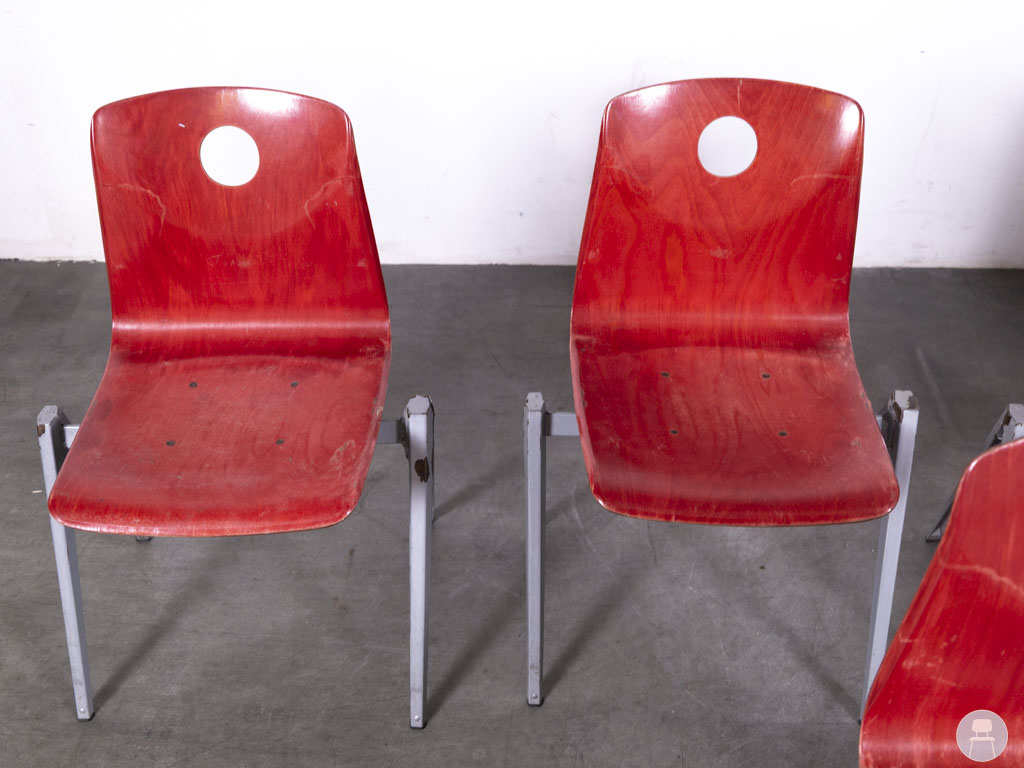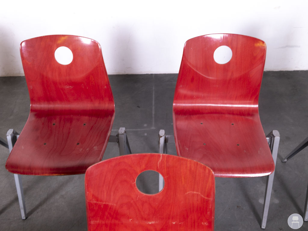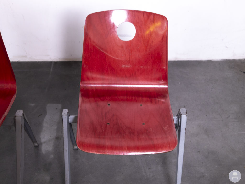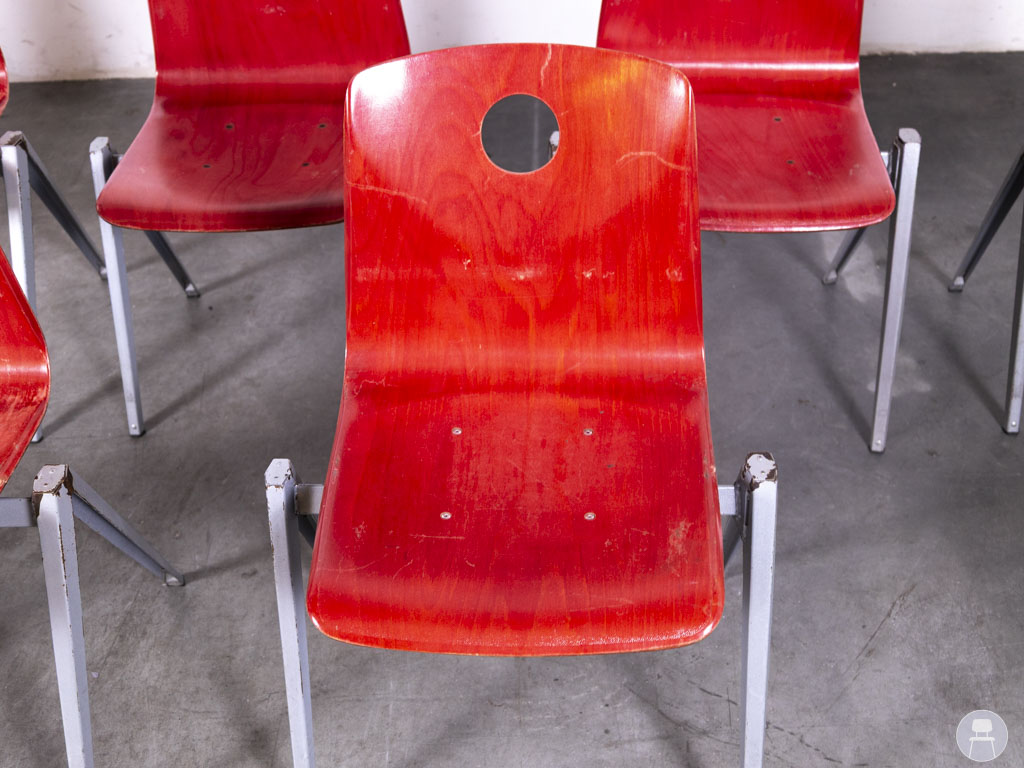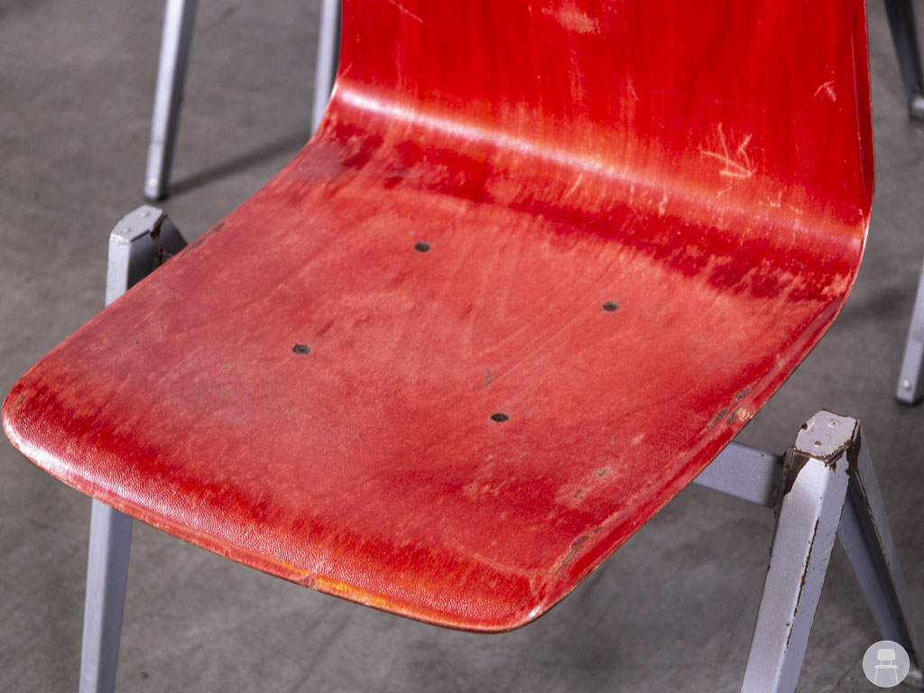 Het zilverkleurige metalen frame biedt stabiliteit en maakt de stoelen bijzonder duurzaam. Dankzij het slimme ontwerp zijn deze stapelbaar, wat ze ideaal maakt voor gebruik in scholen, bedrijfskantines, wachtruimtes of horecazaken waar flexibiliteit gewenst is. De stoelen vertonen gebruikssporen op de zittingen, wat ze een authentieke vintage uitstraling geeft. Een uitstekende keuze voor wie op zoek is naar praktisch én stijlvol tweedehands horecameubilair met een industriële touch.