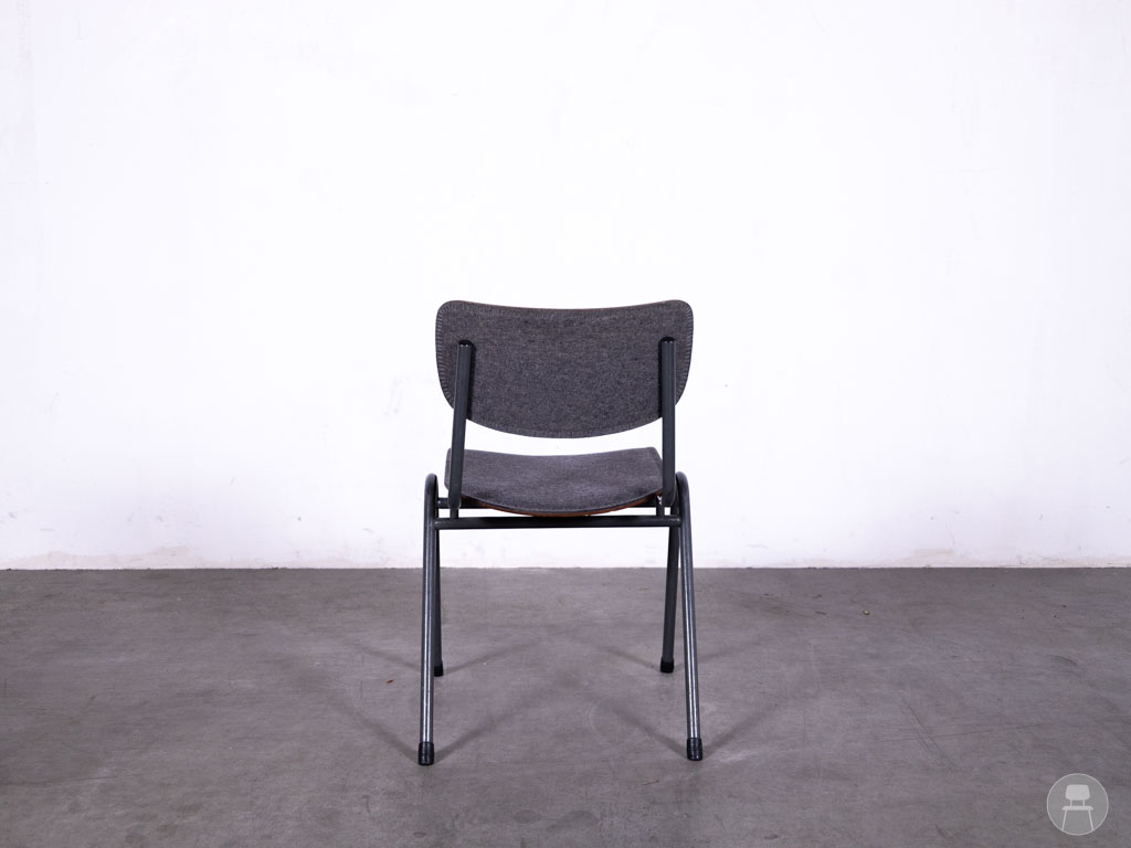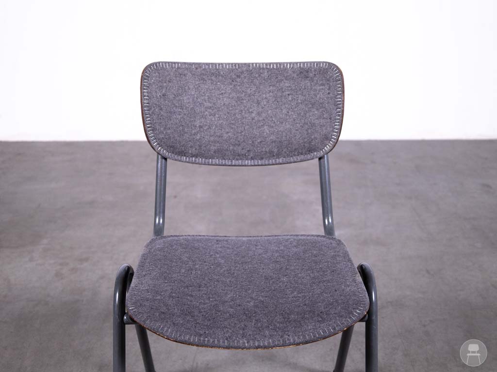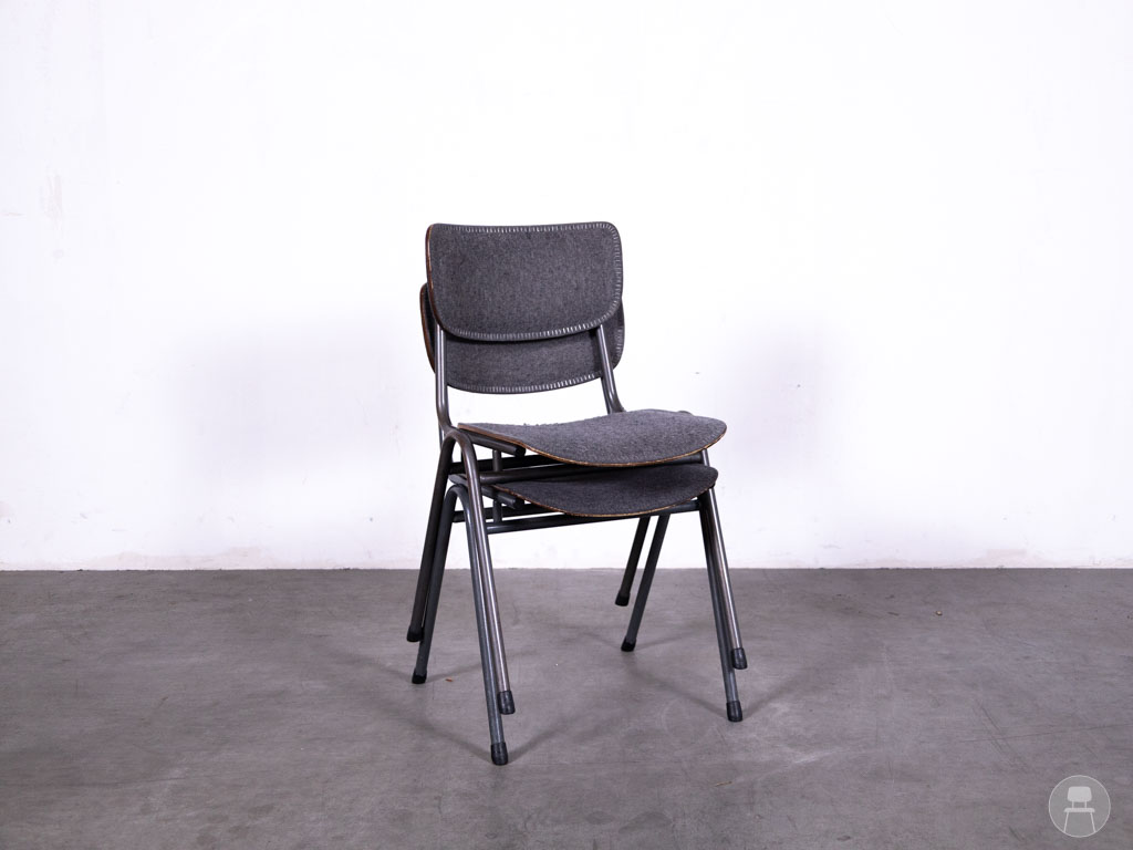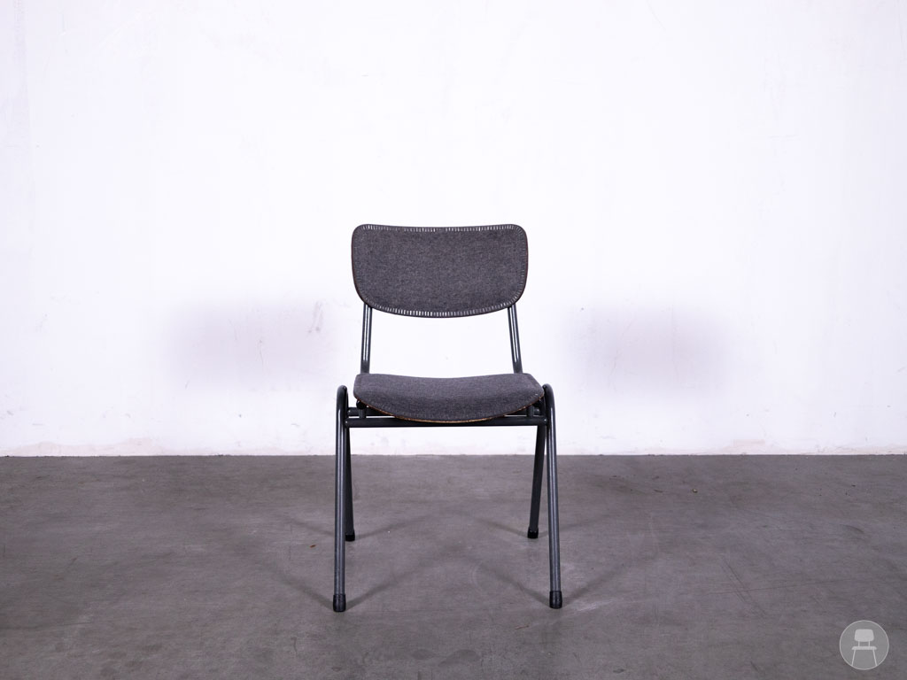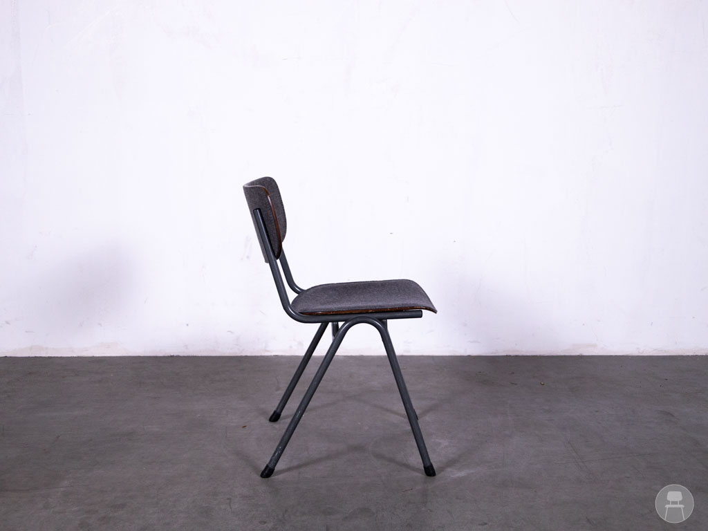 Schoolstoel Gijs donkergrijs is een praktische en stijlvolle keuze voor elke horecazaak, vergaderruimte of kantine. Deze vintage schoolstoel heeft een comfortabel zitvlak en rugleuning met donkergrijze stoffering en is afgewerkt met een stoer zwart metalen buisframe.
