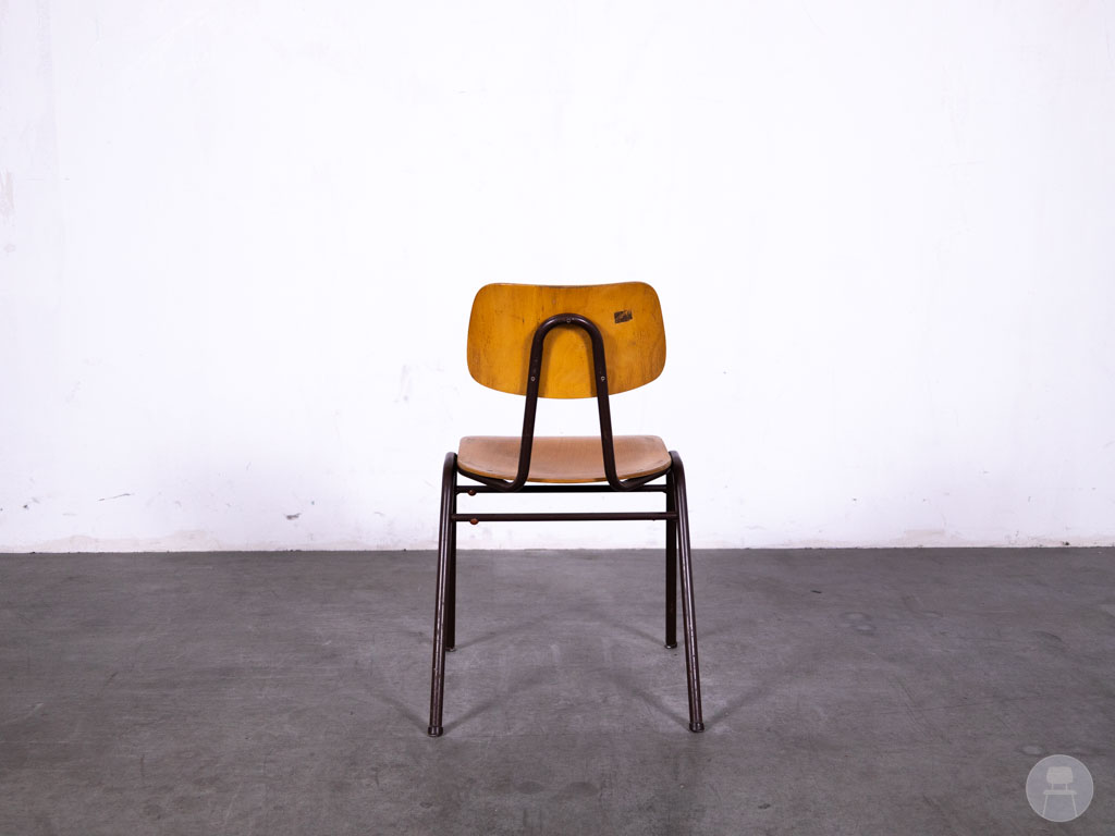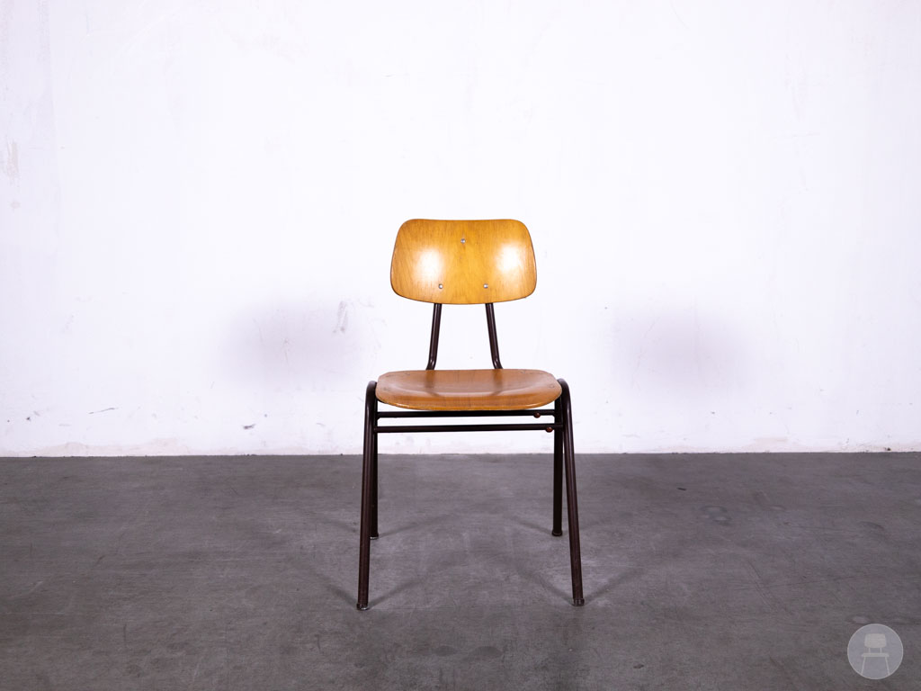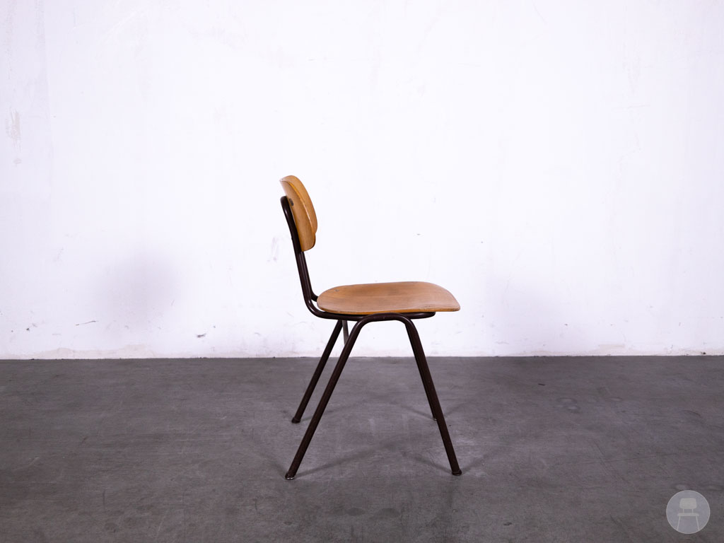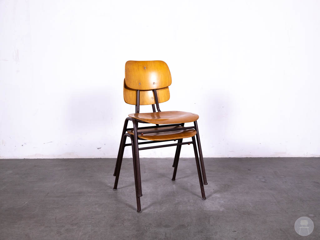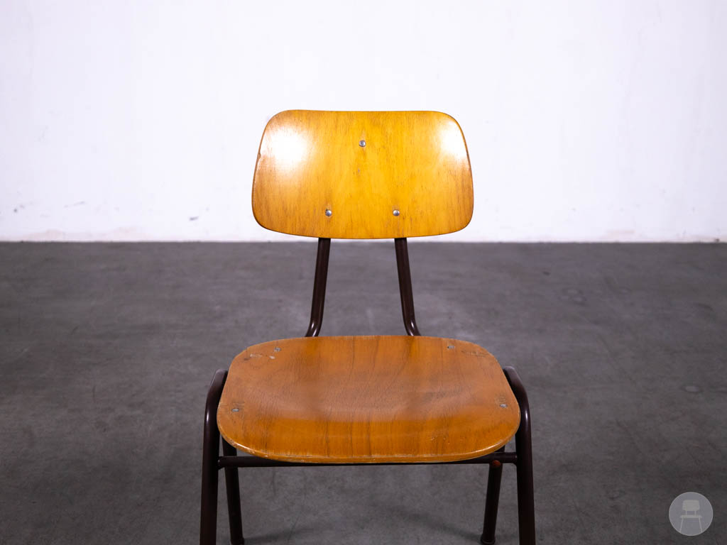 De zitting en rugleuning zijn gemaakt van gebogen hout in een warme houtkleur, terwijl het onderstel is vervaardigd uit stevig donkerbruin metaal. Deze combinatie geeft de schoolstoel een retro karakter, zoals je dat kent uit klassieke schoolomgevingen. De stoel is stapelbaar, wat hem zeer geschikt maakt voor flexibel gebruik in bijvoorbeeld cafés, vergaderruimtes of kantines.