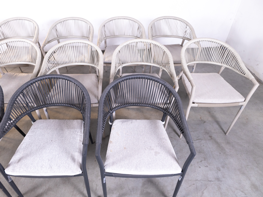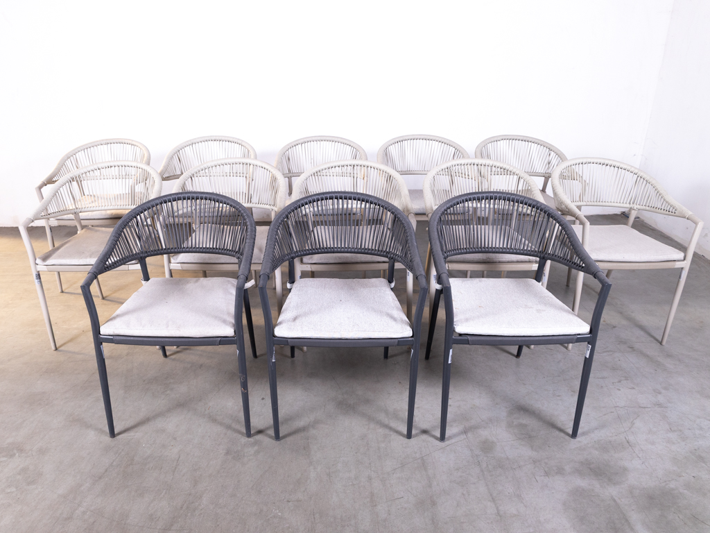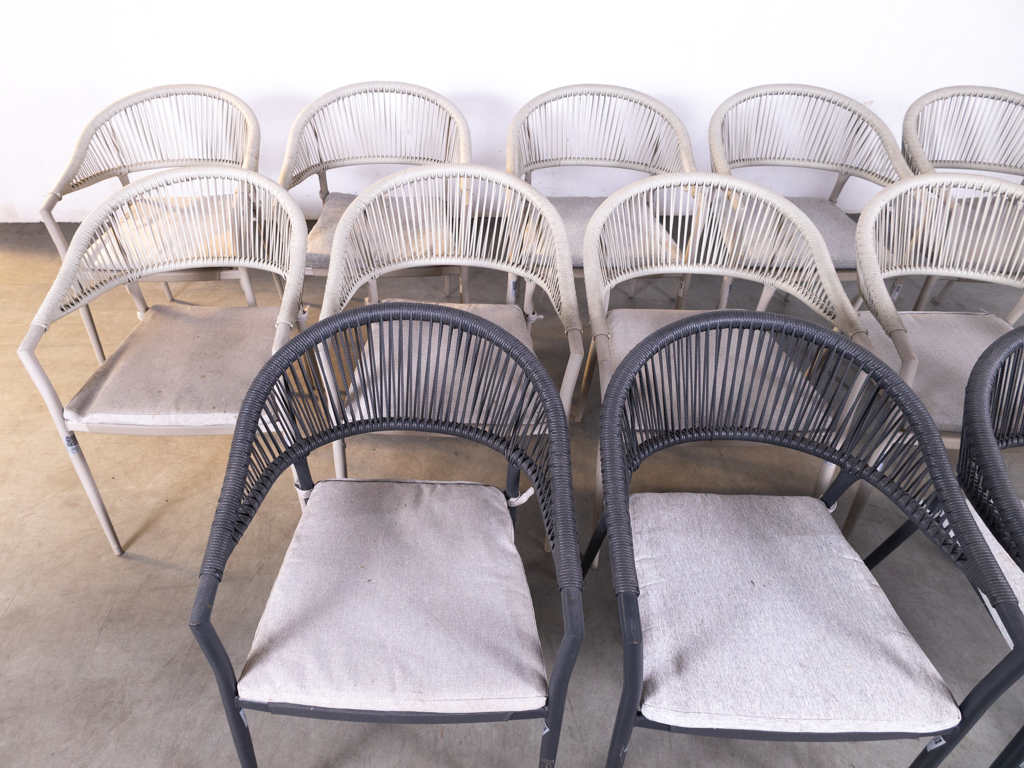 Het betreft een mix van grijze en zwarte stoelen, wat een speels en modern effect geeft op uw terras of buitenruimte. De set bestaat uit 13 stuks, ideaal voor het snel inrichten van een groter terras.