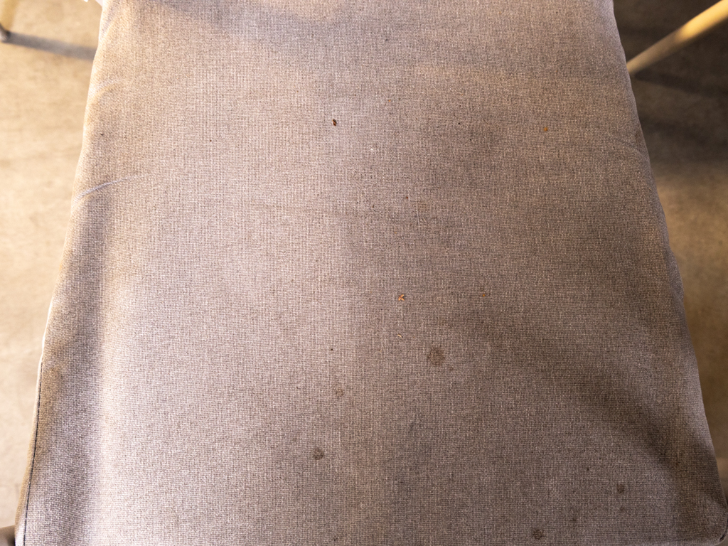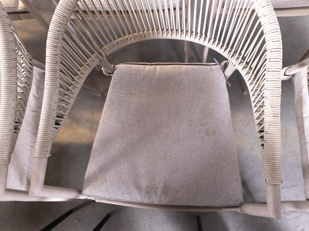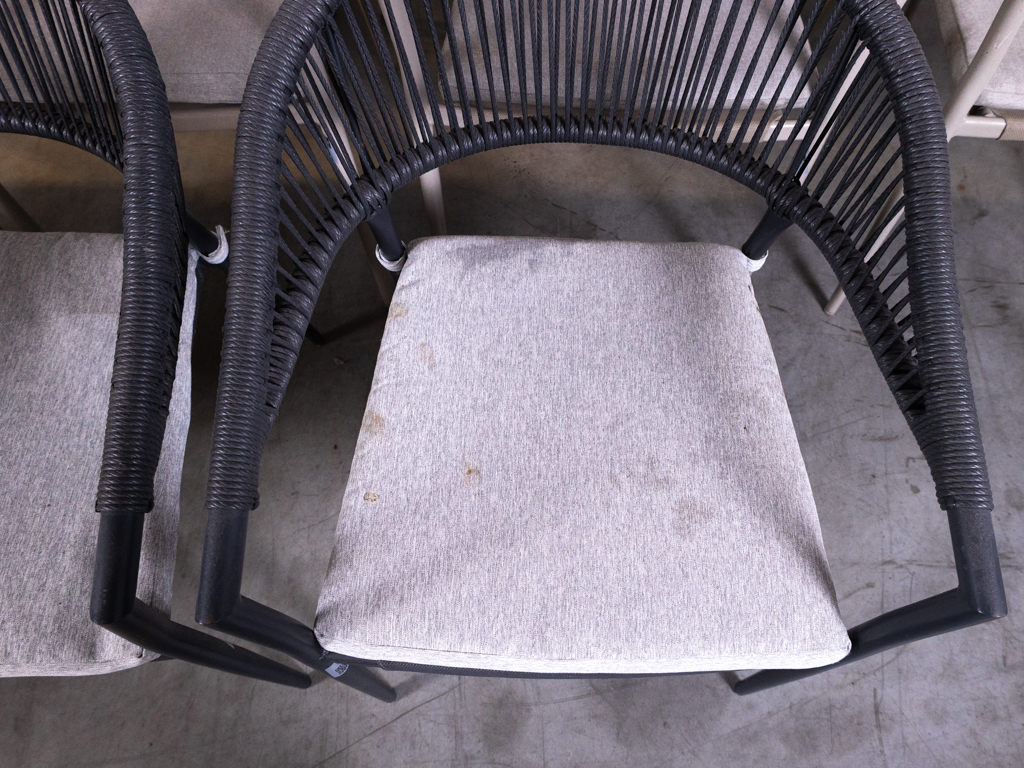 De zittingen zijn voorzien van grijze kussens van stof, wat extra comfort biedt voor uw gasten. Let op: de kussens vertonen gebruikssporen en vlekken, zoals zichtbaar op de detailfoto. Dit maakt deze set uitermate geschikt voor horecaondernemers die op zoek zijn naar voordelige tweedehands terrasstoelen.