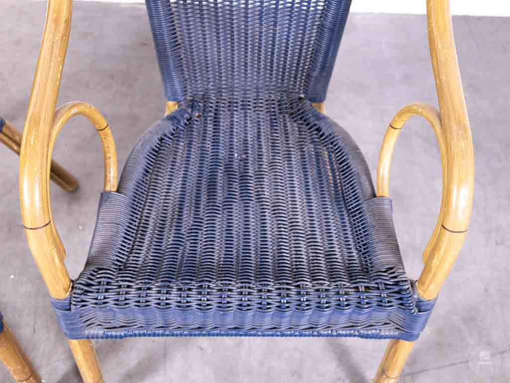 1 set 2 stuks Terrasstoel Panda Ocean blauw is een perfecte aanvulling voor elk horecaterras dat op zoek is naar een tropische, sfeervolle uitstraling met een moderne twist. De stoelen zijn voorzien van een stevig aluminium frame met een bamboe-look afwerking, wat niet alleen zorgt voor een natuurlijke uitstraling maar ook een licht gewicht en uitstekende weersbestendigheid garandeert. De zitting en rugleuning zijn vervaardigd uit duurzaam kunststof vlechtwerk in een diepe oceaanblauwe kleur, wat het geheel een frisse en stijlvolle look geeft.