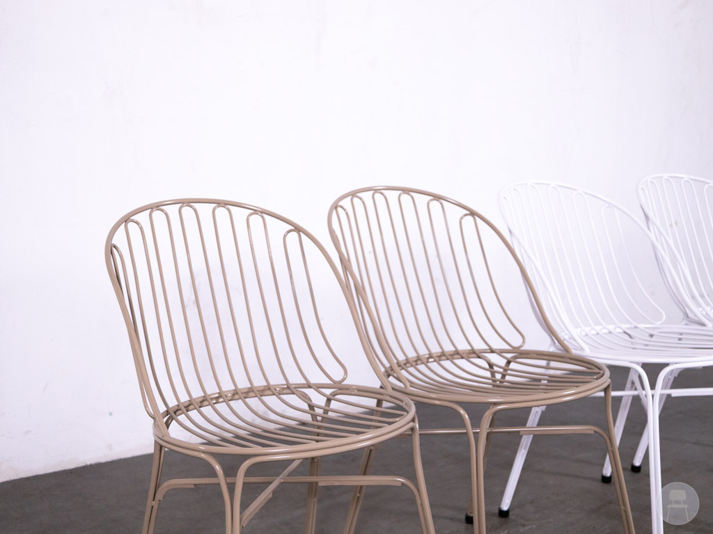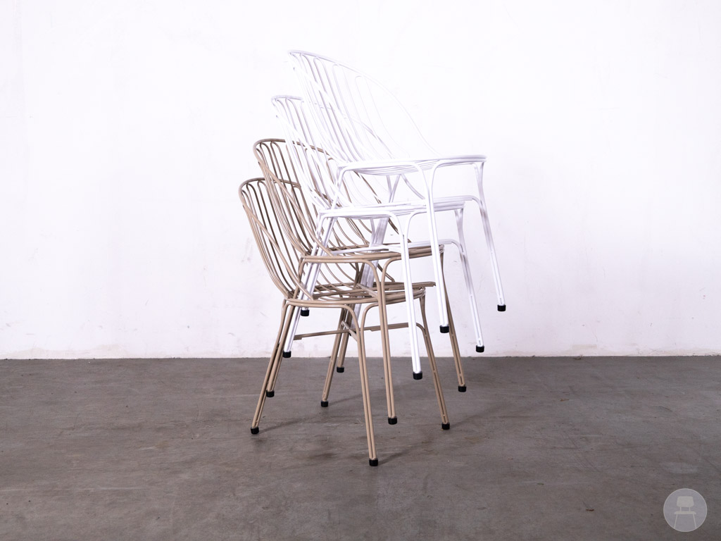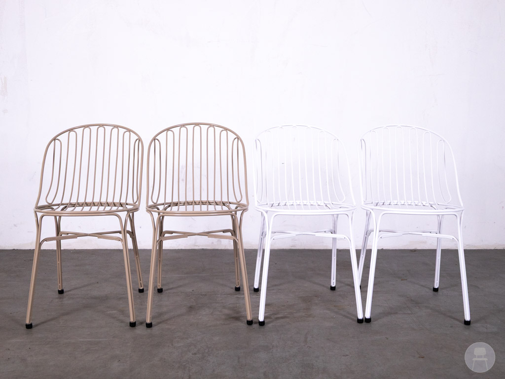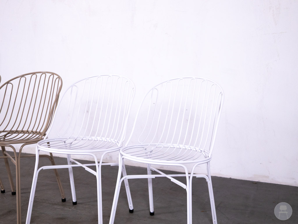 De 1 Set 4 Terrasstoelen Milou wit/beige is een stijlvolle en luchtige set terrasstoelen die perfect past bij een modern horecaterras. Deze elegante stoelen combineren een verfijnd draadstalen design met een frisse uitstraling in wit en beige, waardoor ze moeiteloos aansluiten bij diverse buitenconcepten.