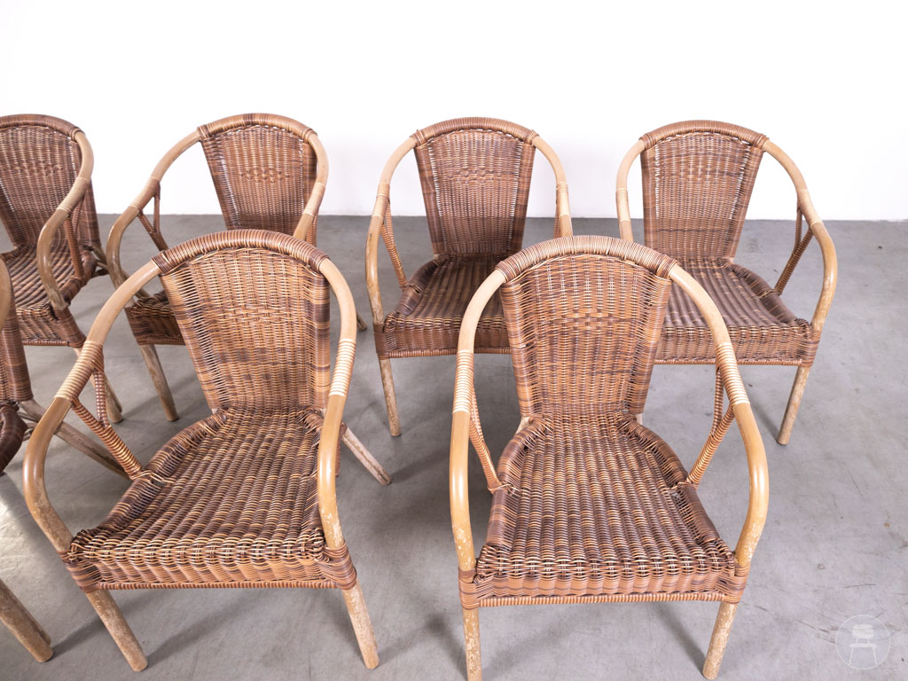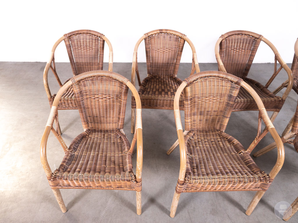 De stoelen zijn gemaakt van een combinatie van kunststof vlechtwerk en een stevig frame met houtlook afwerking in naturel kleur. Dit geeft de stoelen de klassieke rotan uitstraling, terwijl ze geschikt zijn voor intensief horeca gebruik.